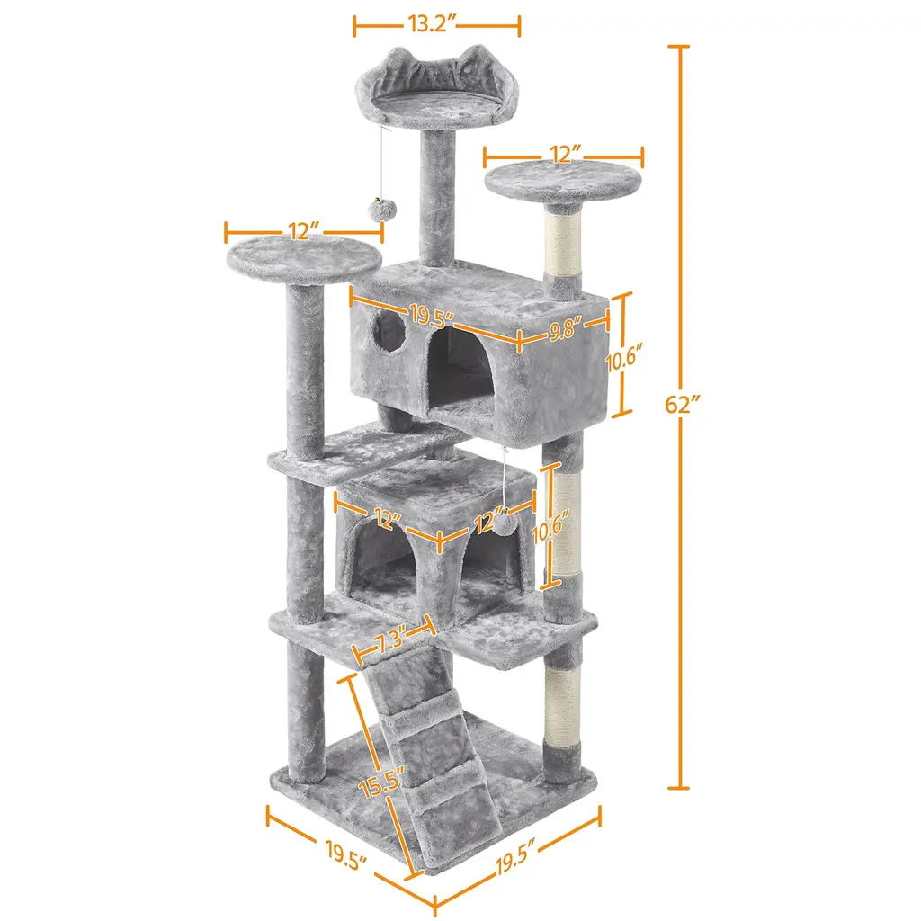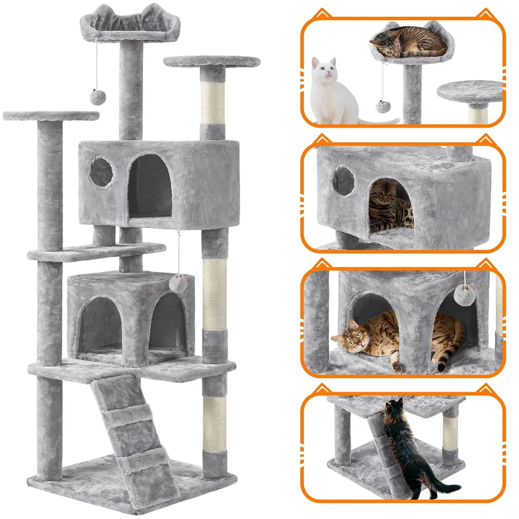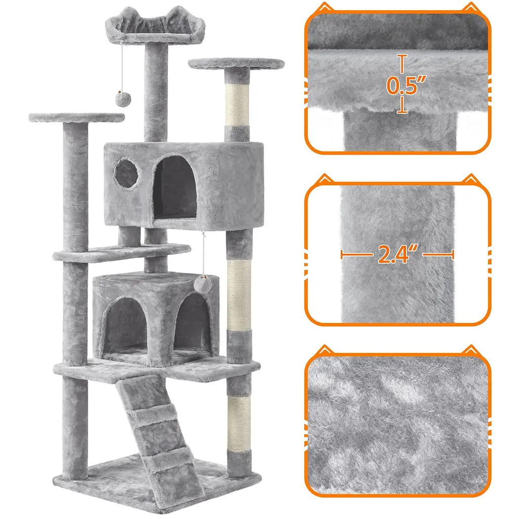 62in Cat Tree Cat Tower, Cat Furniture W/double Cat Condo, Scratching Posts, Multiple Platforms & Balls For Kittens & Cats - Light Gray