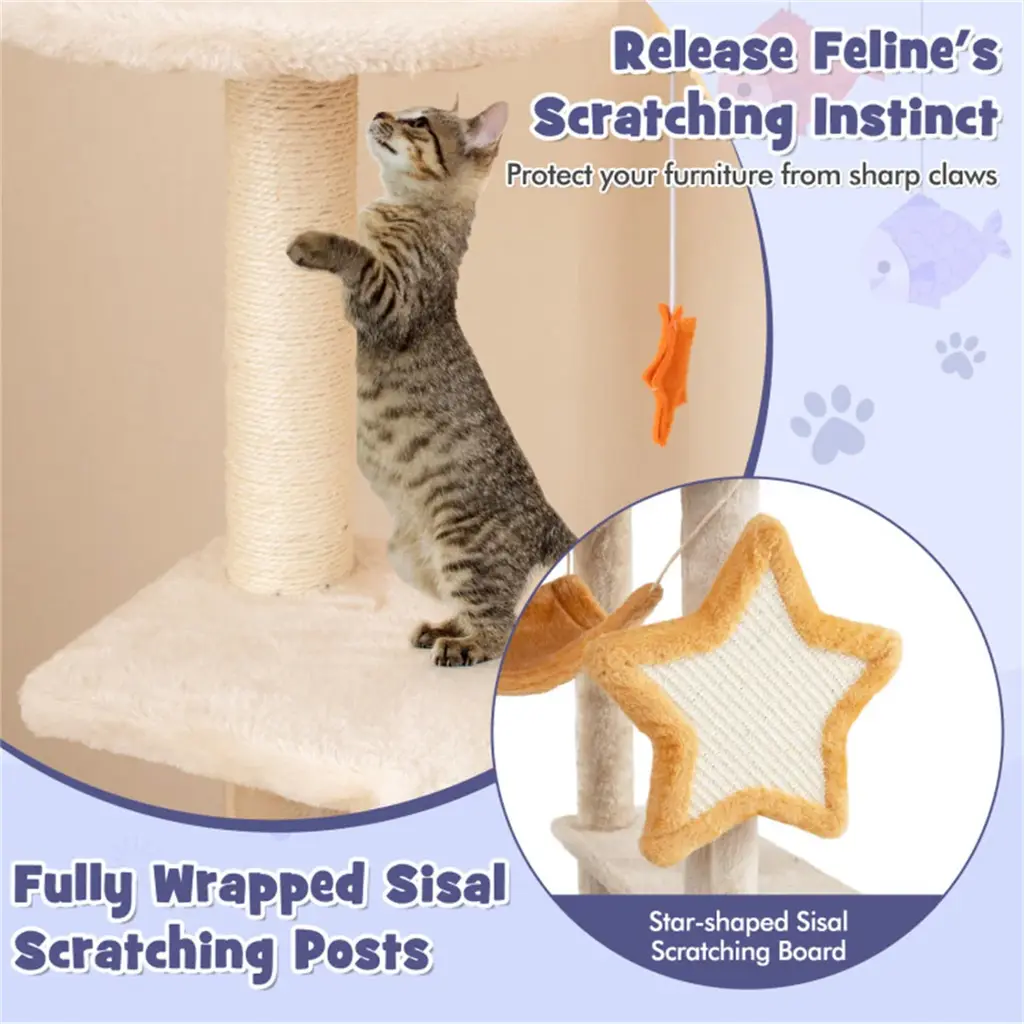 SpecificationsDescription:This 63-inch multi-stage cat tower is the perfect addition to any multi-cat household, offering a private retreat for relaxation and play. Designed with a large condo, deep hammock, and padded round perch, it provides multiple lounging spots for cats to rest at elevated viewpoints. The tower features a variety of interactive toys, including a dangling bell ball, spring ball, and 3 star-shaped hanging toys, stimulating your cat’s natural instincts to play. Equipped with a sisal-covered star-shaped scratching board and posts, this cat tree protects furniture from damage while promoting healthy claws. With a wide 24" x 16" base and anti-tipping device, the structure ensures stability during active play. Covered in soft, plush fabric, it provides comfort while adding style to your home with its chic color design. The multi-level design is also space-efficient, making it an ideal choice for any living space.Key Features: