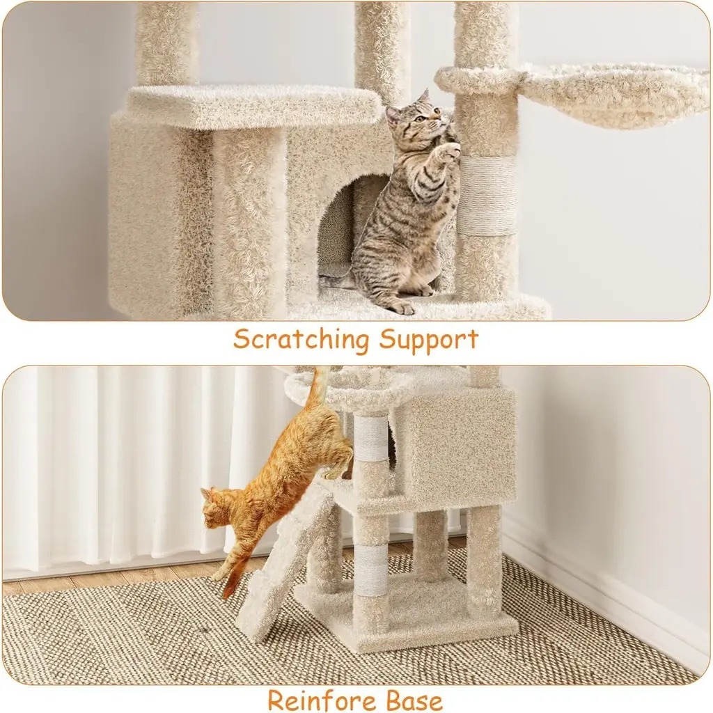 Multi-Level Design for Play and Rest: This cat tree is thoughtfully designed to offer a variety of platforms where cats can scratch, nap, play, and relax. The accessible layout ensures cats of all sizes and ages can easily reach every level, promoting both activity and comfort.Quiet and Comfortable: Wrapped in plush faux fur, this cat tree provides a soft and cozy resting area for your cat. It's the perfect spot for your feline friend to curl up and enjoy a peaceful nap in comfort and warmth.Scratch Posts for Healthy Activity: Equipped with two scratching posts, this cat tree helps your cat stretch and exercise its muscles, enhancing and balance. It also protects your furniture from unwanted scratches, allowing your cat to its natural scratching instincts.Sturdy and Stable Construction: Built with a broad, solid base and an anti-tip kit for added security, this cat tree offers a safe environment for energetic cats. You can rest assured that even the most active cats can jump in and out without any risk of tipping over.Quick and Easy Assembly: Our cat tree comes with clear, easy-to-follow instructions, making assembly a breeze. In just a few minutes, you'll have a fully assembled cat condo ready for your furry friend to enjoy!