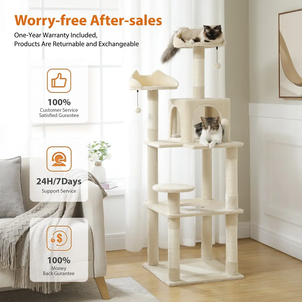 1. ULTIMATE ACTIVITY HOUSE: Equipped with a roomy condo, cozy plush top perch, natural sisal covered scratching posts and fluffy dangling ball, this 63" cat tree is an ideal place for entertaining as well as taking a good rest. Your frisky kittens could easily jump up and down with the assist of the round pedal and step-like layout.2. DOUBLE TOP PERCHES: The cat tree be equiped with two perches, if you have multiple cats in your home don't worry about them fighting for the top perch3. EXERCISES GROUND: 5 natural sisal covered posts allows them to release emotions and have daily claw exercises without damaging your delicate furniture. Acquire the thrill of hunting by playing with replaceable fuzzy dangling ball attached below the perch.4. RELIABLE QUALITY: Stability and safety are always the key points. Crafted by soft plush fabric, CARB-certified natural particle boards, firm sisal wrapped posts and strengthened base, it's sturdy and safe for your furry babies to bounce and enjoy up on their castle with ease.5. EASY INSTALLTION: Illustrated assemble manual included, also you could look up video on YouTube for easier installation. No need extra tools with the contained hardware pack. We provide professional customer service both before and after your purchase.