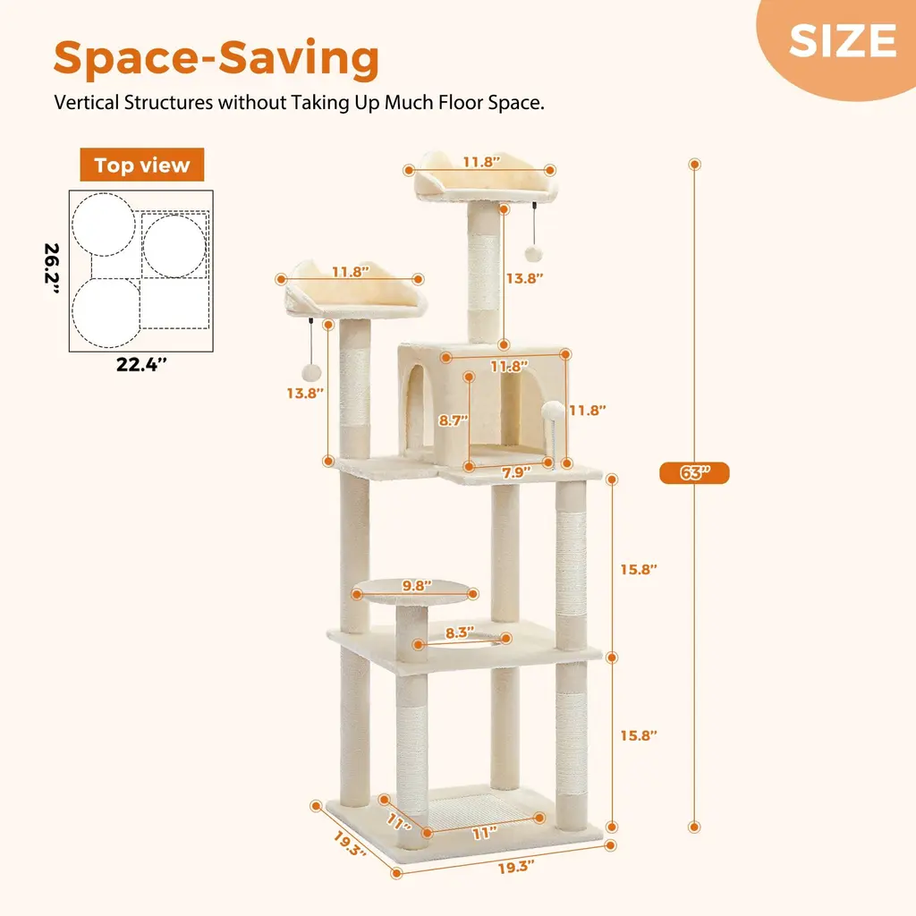63" Indoor Large Cat Tree Cat Tower With Scratching Pad And Cozy Condo - Beige