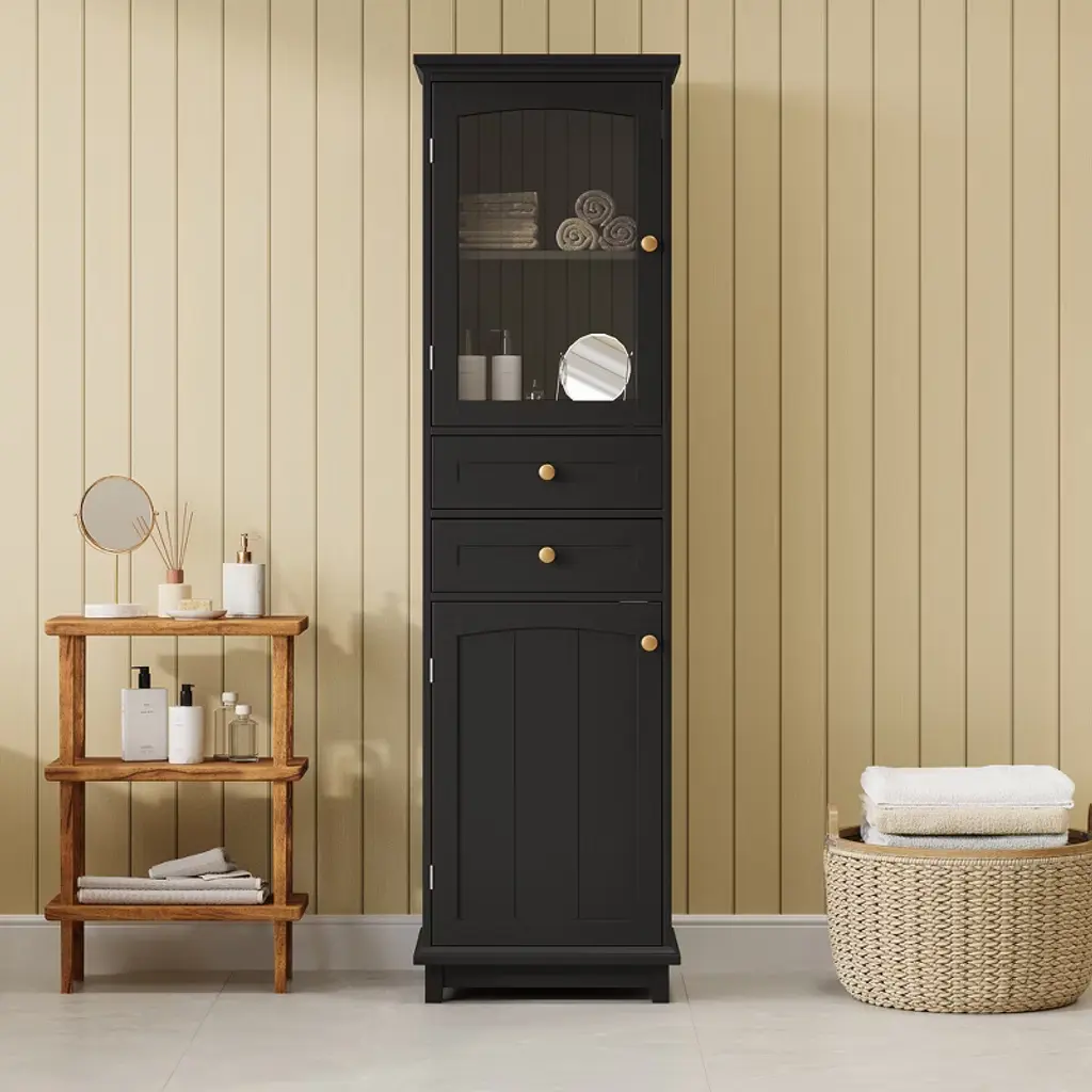Upgrade your bathroom with our contemporary tall bathroom vanity cabinets, designed to maximize space while adding a touch of style. This tall vanity measures 17.76x14.21x62.99 inches, making it perfect for any bathroom layout. A sophisticated blend of modern and classic elements ensures it blends seamlessly into any décor. Glass doors add a touch of elegance and openness, allowing for stylish display of stored items. With exquisite carvings and flowing lines, this cabinet exudes timeless beauty and high-end taste, making it a standout in your home. Elegant Design This tall bathroom cabinet combines sleek modern aesthetics with functional elegance. Featuring glass doors, a white painted finish, and gold round handles, it effortlessly adds a touch of sophistication to any bathroom decor. The clean lines and contemporary style make it a standout piece that enha. Ample Storage Designed for practicality, this cabinet offers two adjustable shelves and two drawers, providing ample storage space for all your bathroom essentials. The adjustable shelves allow you to customize the interior to accommodate items of various sizes, ensuring a clutter-free and organized bathroom. The Perfect Blend of Design and Functionality Our tall bathroom storage cabinet features fully transparent glass doors, making your items easily visible and accessible. This design not only allows for effortless organization but also provides a stylish way to showcase your decor and collectibles. The glass doors enhance the visual spaciousness.