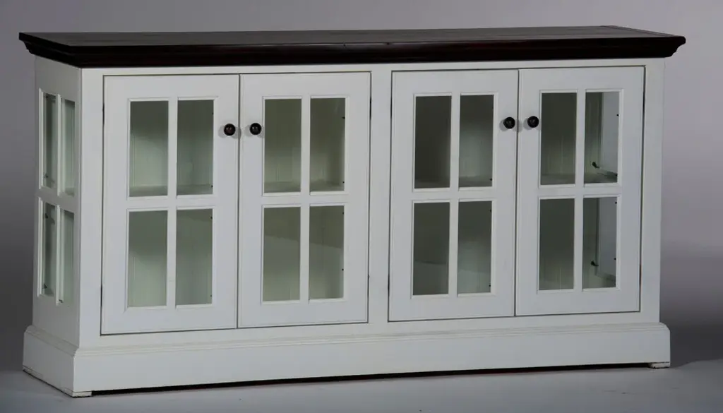 Please Note:Refer to 2nd image for main body color and 3rd image for top finish colorThe classic design elements of the West Winds Collection are apparent in the strong lines of the divided glass door and side panels, hand-applied finish and distressed solid wood plank top. With sixty possible finish options and distinctive hardware, you are sure to create your own personal look.Solid Wood Furniture Grade Birch Ply Main BodySolid Hardwood Plank Top4 Framed Pane Glass DoorsBoth Sides Framed Pane Glass SidesBead Board Back Panel60 Finish OptionsTop FinishConcord CherryDistressed Finish: noWarranty: Case 1 Year Parts 1 MonthWarranty Term: Eagle''s products are guaranteed against material defects for one (1) year from date of delivery to the dealer. Defects such as warping, separation of wood joints and splits in the wood may result from inappropriate storage or exposure to extreme conditions.Eagle reserves the right to investigate before settling any claim.ISTA 3A Certified: NoHazardous Materials: NoFlammable: NoMSDS Required: NoPerishable: NoFood or Edible: NoLive Plant or Animal: No