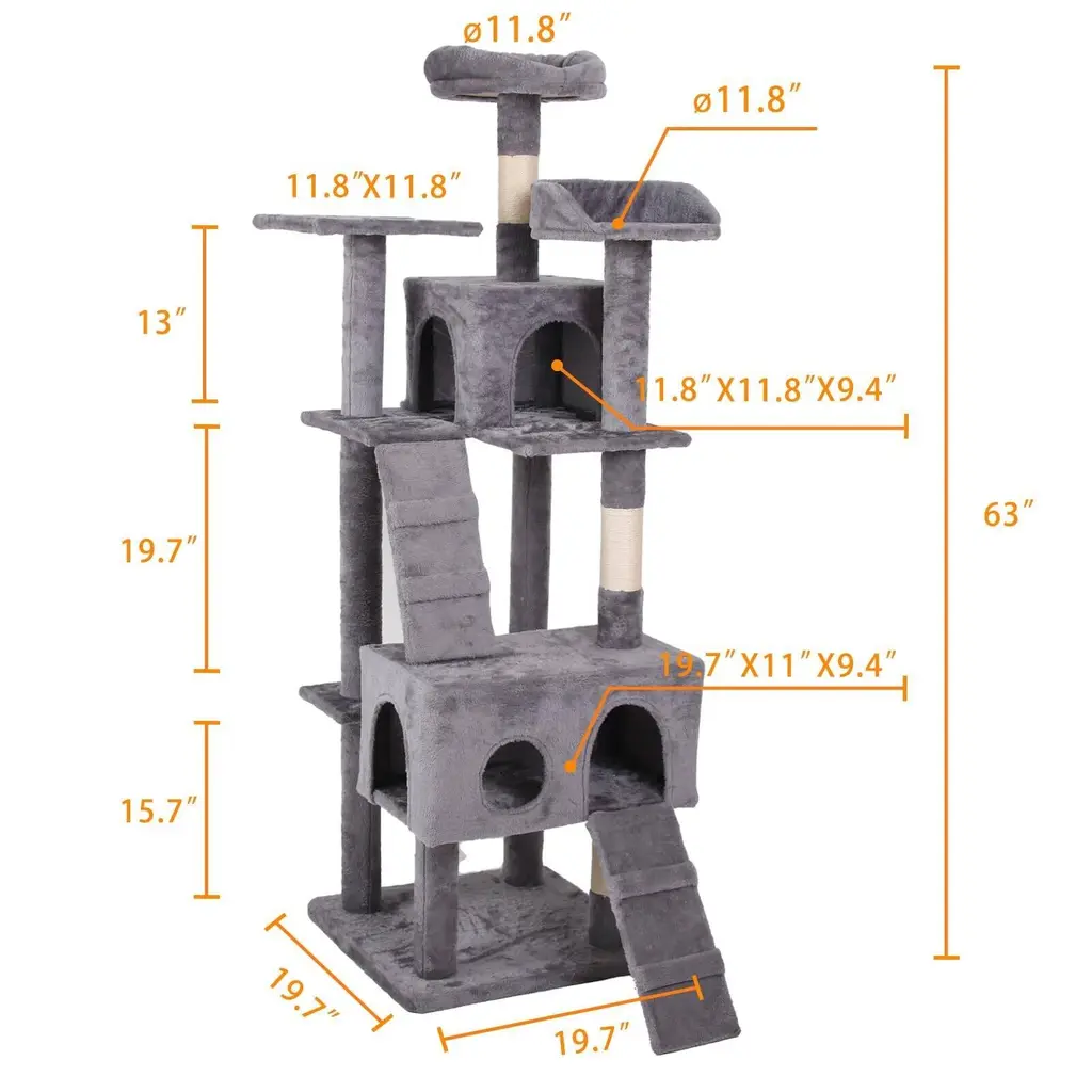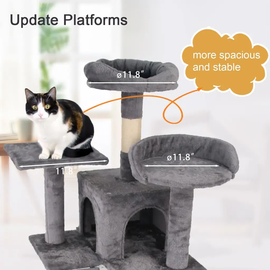 Multi-Layer Design: This cat tree features a convenient multi-layered structure that caters to your cat's natural behaviors, including scratching, napping, playing, and lounging. The thoughtfully designed platforms are easily accessible for cats of any age and size, ensuring that all your feline friends can enjoy their space. Quiet and Comfortable: Covered in skin-friendly plush faux fur, this cat tree provides super soft and warm lounging spots for your cats. It serves as an ideal retreat for them to curl up and take a nap, promoting relaxation and comfort in their own designated space. Scratching Posts: Equipped with two sturdy scratching posts, the cat tree encourages healthy scratching behaviors while preventing damage to your furniture. These posts allow cats to stretch, exercise their muscles, and develop their balance and agility, aligning with their natural instincts to climb and scratch. Sturdy and Stable: Designed with a wide base and an anti-tip kit for added safety, this cat tower provides stability and strength. Your active cat can jump in and out of the tree safely, reducing the risk of tipping over during play or exploration, ensuring a secure environment for your pet. Easy to Assemble: The cat tree comes with detailed graphic instructions to facilitate effortless installation. You can set it up in just a few minutes, making the assembly process straightforward and convenient, and allowing you to provide your cat with their new favorite spot in no time!