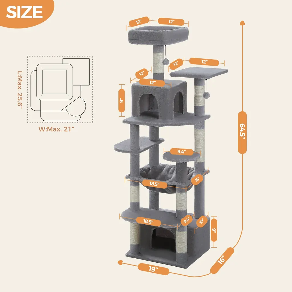 64.5" Cat Tree With Cat Condo And Hammock - Gray