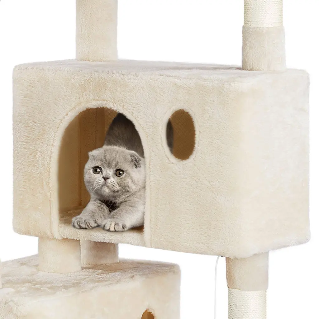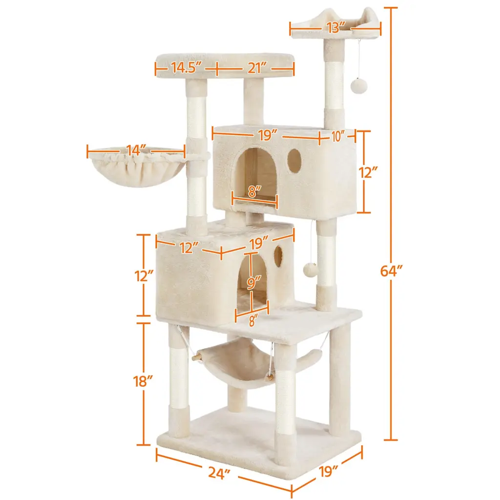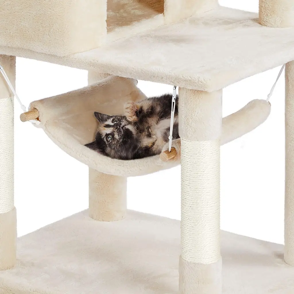 MULTILEVEL CAT HOUSE: This multiple-level cat tree has multiple tiers and structures for cats to play and sleep. It is suitable for around three small cats or two normally-sized cats, not suitable for large-sized cats. No matter it is for fun or rest, this cat tower is an ideal choice FOR FUN & REST: No matter for fun or rest, this multifunctional cat house will always meet your cats' needs. Have a good sleep in the comfy condos without fighting, or lounge in the basket and hammock severally. Each cat will find his/her favorite place AMPLE SPACE: To fully arouse your cats' interest, we design this cat tree with multiple levels and structures. The multiple-level cat house is very suitable for the owner who has two or more cats. Each cat can have its own condo without fighting CAT SCRATCHER: Every cat needs a scratching post or board to exercise and play. Cat scratchers can make cats satisfied and protect your furniture from their paws. Six posts covered by natural sisal ropes are perfect for scratching SKIN-FRIENDLY PLUSH: Our cat tower is made of selected materials, covered by plush, and connected by metal accessories. It is very pet-friendly and durable for a long time, no hazardous substances to your cats and families. Your cats will always have a wonderful day on this comfy cat tree