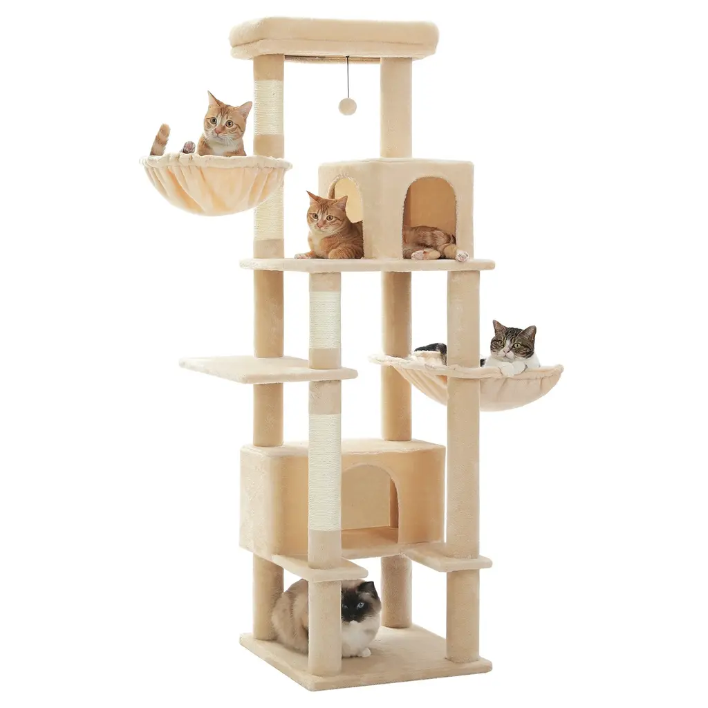 66" Cat Tree, Cat Tower With Sisal-Covered Scratching Post, Super Large Metal Hammock And 2 Big Condos - Beige