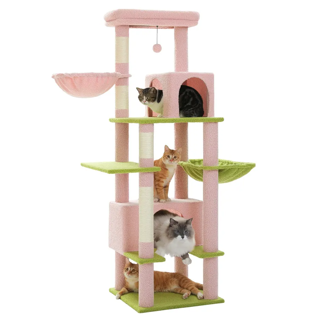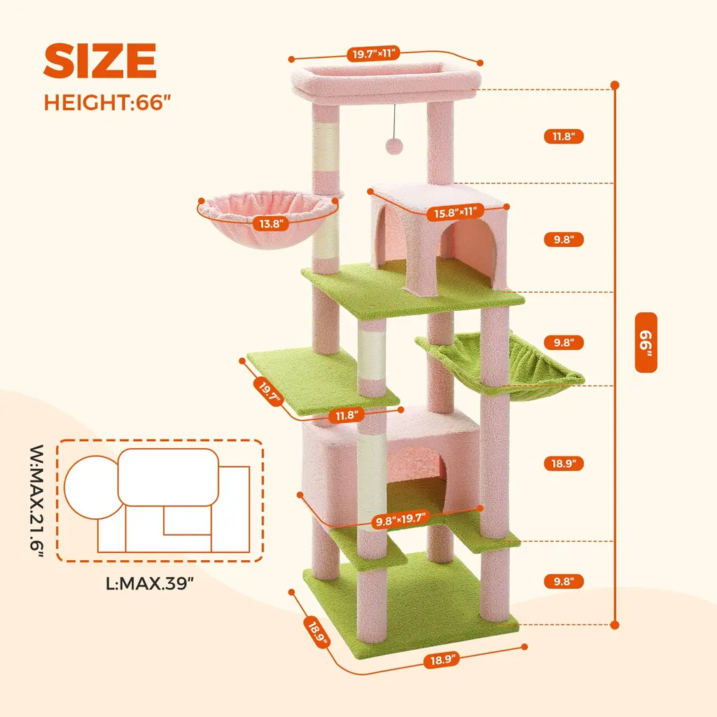 Ideal for Large Cats: This 66" cat tree is specially designed for Large cats Adult (20 lbs heavy duty), featuring spacious cat condos, a wide square hammock (20" x 12") and an enlarged cradle (dia=14") to comfortably accommodate the size and activity of large catsVarious Colors to Choose From: We provide 4 colors on this cat tower so there are various choices for your preference. A cactus cat tree or a pink cat tree can be a fresh decor in your room. The PEQULTI 6 levels tall cat tree is suitable for multi-cat householdReliable Quality and Stability: Crafted with high-grade materials and a weighted base, this cat tree stands tall and steady, providing a safe environment for your cat to leap and lounge. What's more, an anti-toppling strap ensures double safety for the whole tall cat towerFun Cat Playhouse: This multi-level cat tree features various resting places and extra entertainment facilities. Your cats can sleep in the cat condo or hammock on the different height, scratching on the 100% natural sisal post or jump up and down to play the toyball. This wonderful cat playhouse makes feline friends feel at paradiseEasy to Assemble and Nice Looking: Its attractive look will match with any room in your house like a piece of nice pet furniture rather than a jungle gym. All the necessary tools are included, just following the instruction step by step. It's super easy to set it up.Pls contact with our PEQULTI if you have any problem on this product