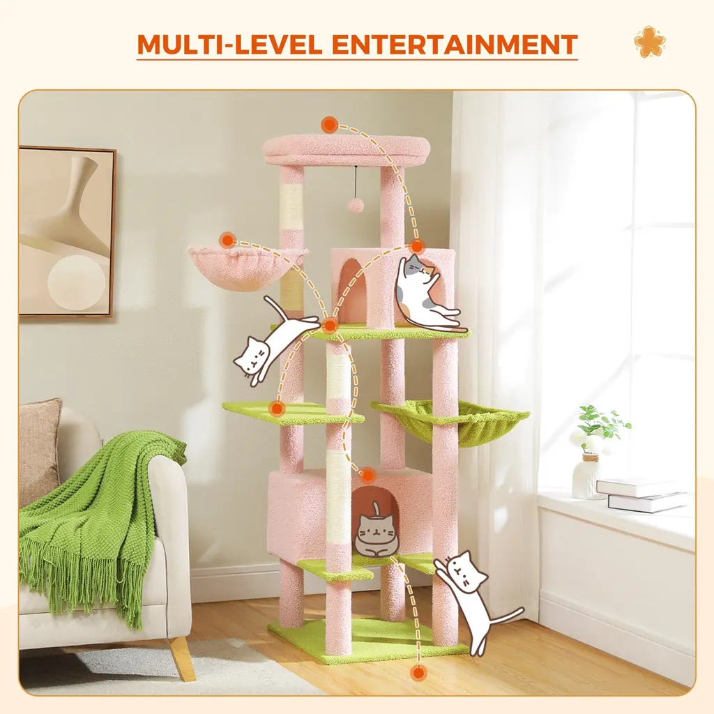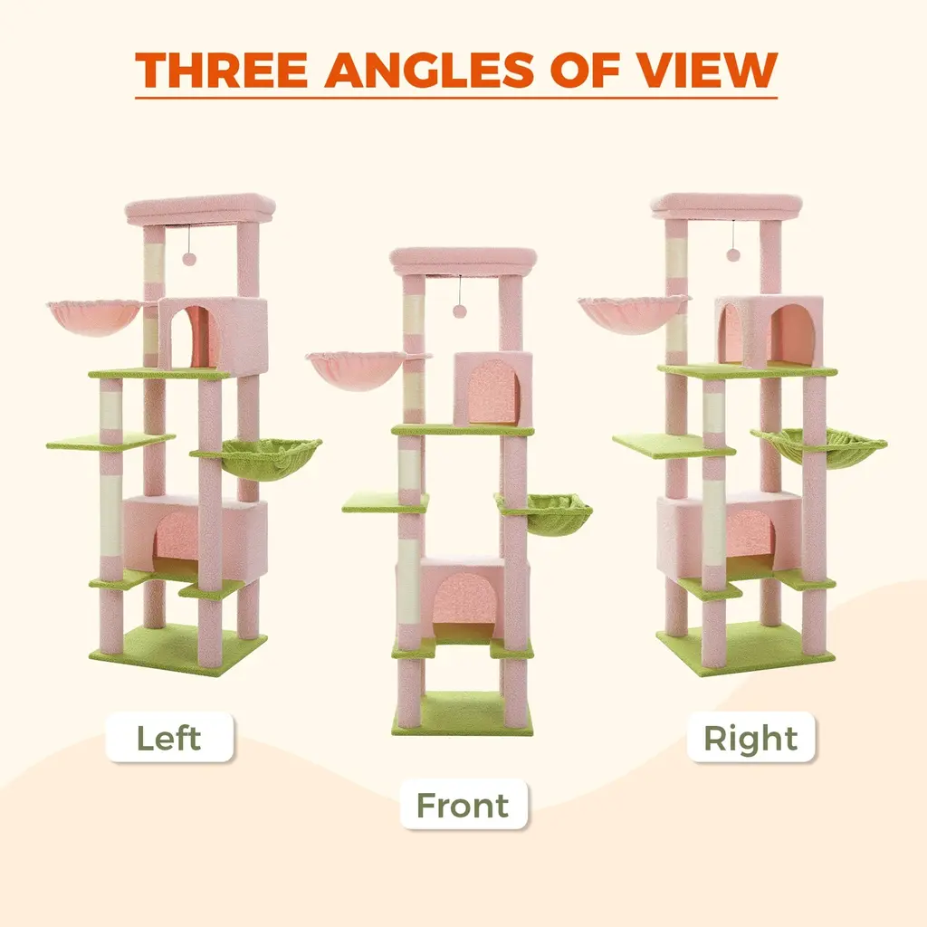 66" Cat Tree, Cat Tower With Sisal-Covered Scratching Post, Super Large Metal Hammock And 2 Big Condos - Pink
