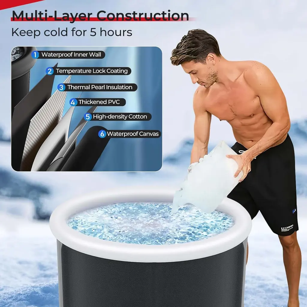 Are you looking for an ice bath solution that offers ultimate convenience and effectiveness? Look no further than our bath tub. This ice bath tub is a practical and efficient choice for individuals under 6'7"/200 cm tall. It provides easy cold water immersion for muscle recovery, muscle pain relief, immunity enhancement, improved sleep, and increased vigor. With a multi-layer construction including a PVC inner layer for thermal insulation and a thick canvas outer layer, this tub can keep water cold for up to 5 hours, while remaining easy to clean. Besides, its stable frame with 6 sturdy support rods ensures secure use whether indoors or outdoors, catering to various activities like workouts, sports, or climbing. Moreover, it also comes with inflation hole, drainage outlet, and a fillable seat cushion for a relaxing experience. Features:Specification
