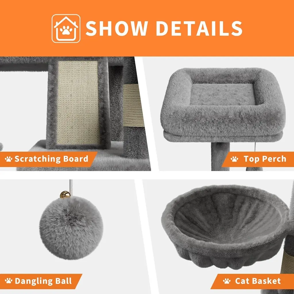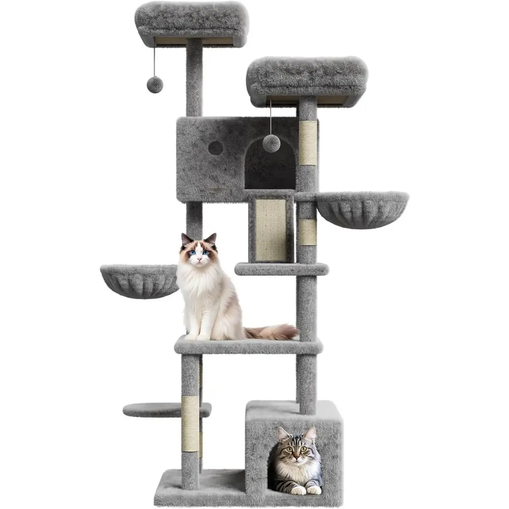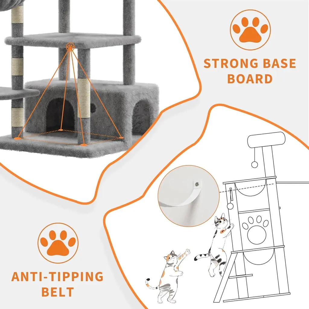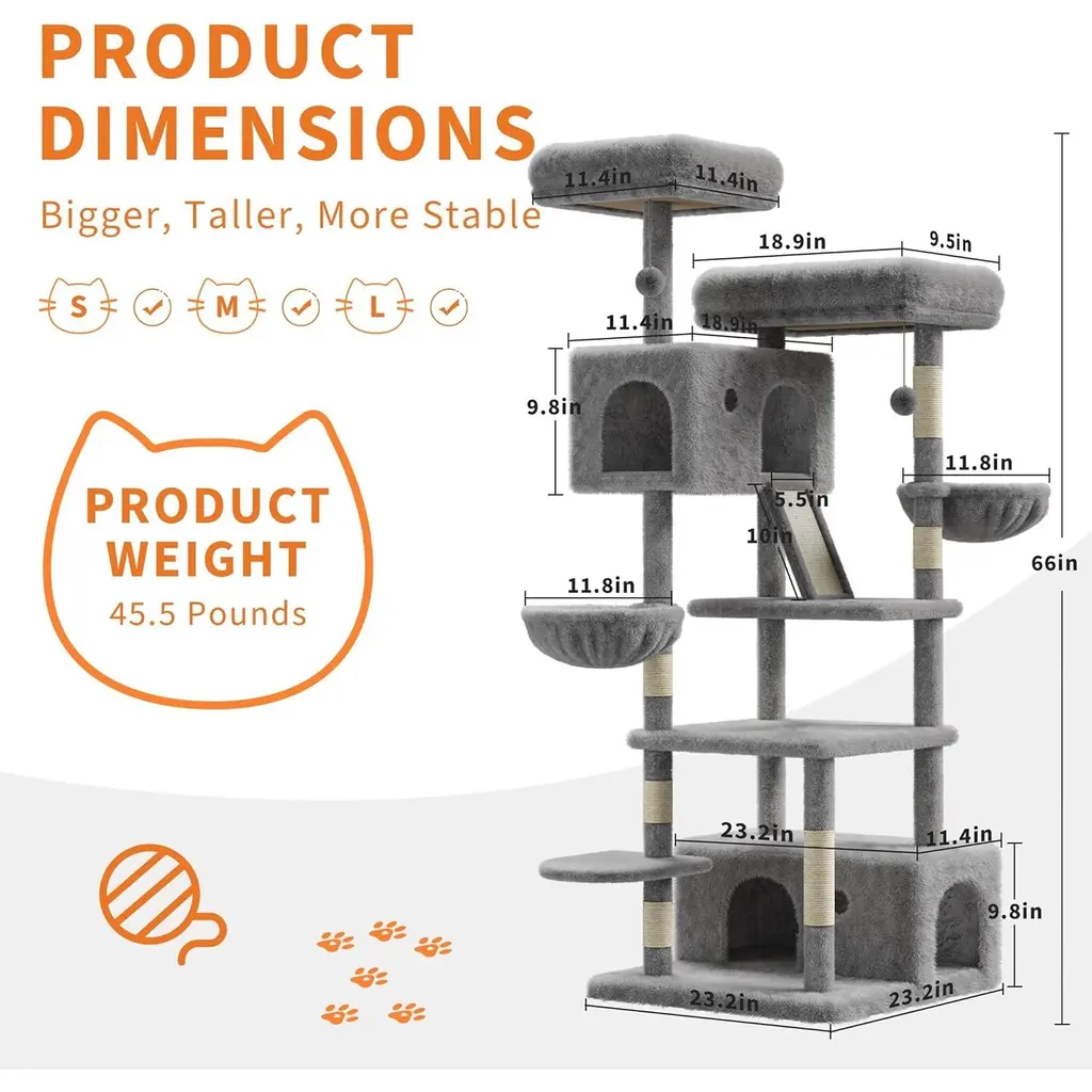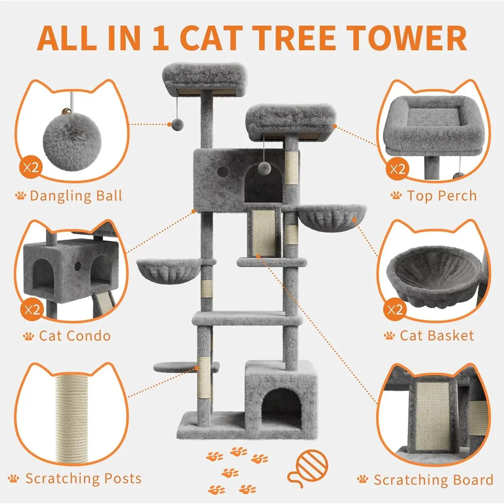 [Large Apartment Offering Privacy and Comfort] Built-in apartments offer your cat a quiet, private nook where they can relax or nap away from the hustle and bustle of your home. It's the perfect hideaway for cats who love their own space. [Cozy Plush Perch and Hammock] The plush perch and cozy hammock provide a soft and comfortable place for your cat to rest that they will love to lounge on. The high-quality fabric keeps them cozy even after a long snooze, and it's easy to clean for your convenience! [FEATURES TO ATTRACT CAT PLAY] Designed to keep your cat entertained, this tower features sisal scratching posts, hanging balls and a fun basket. The combination of climbing, scratching and interactive toys promotes healthy exercise and mental stimulation. [SPACIOUS MULTI-TIER DESIGN] This 66-inch tall large cat tree is perfect for small or large cats weighing 20 pounds or more. The multi-level design gives your furry friend plenty of room to climb, jump and explore. Each level is designed for comfort and combines exercise and rest. [DURABLE, HEAVY DUTY CONSTRUCTION] This sturdy cat tower is made of reinforced materials for durability. The heavy-duty construction ensures that even larger, more active cats can safely enjoy the cat tower without rocking or tipping over.