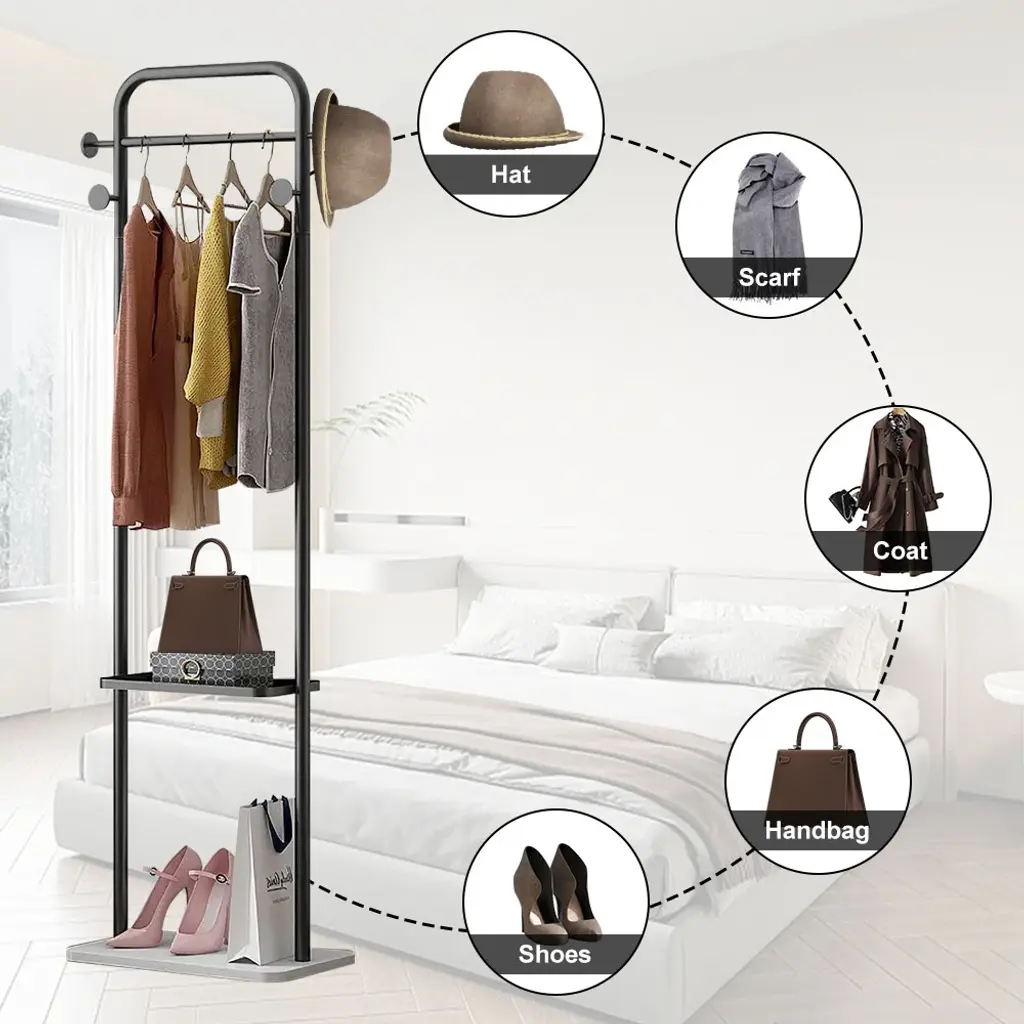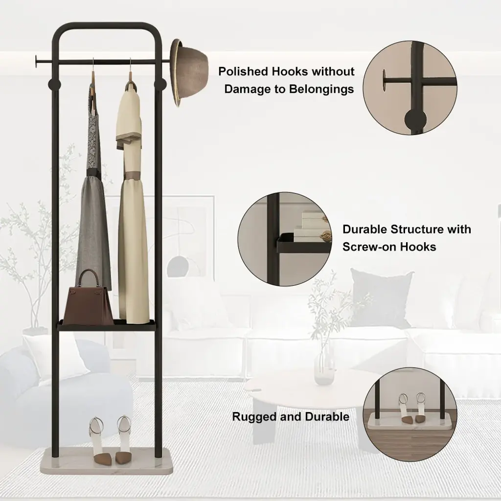 A versatile coat rack perfect for any space! Use it in your entryway or bedroom to organize your clothes. Despite its tiny footprint, it boasts impressive storage capacity. Crafted with a sturdy marble base for stability and ample hanging capacity. Hang your scarves, hats, and jackets with ease. The middle tray is perfect for storing handbags, accessories, and more, while the lower level provides ample space for your shoes. Ideal for tiny homes, apartments, dorms, or condos. Its simple design seamlessly blends with any decor style.