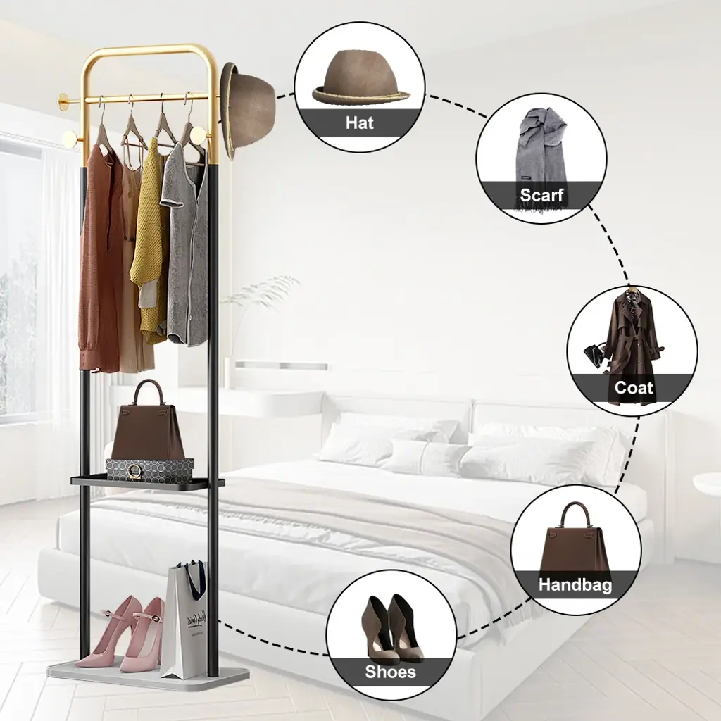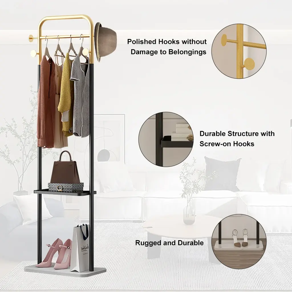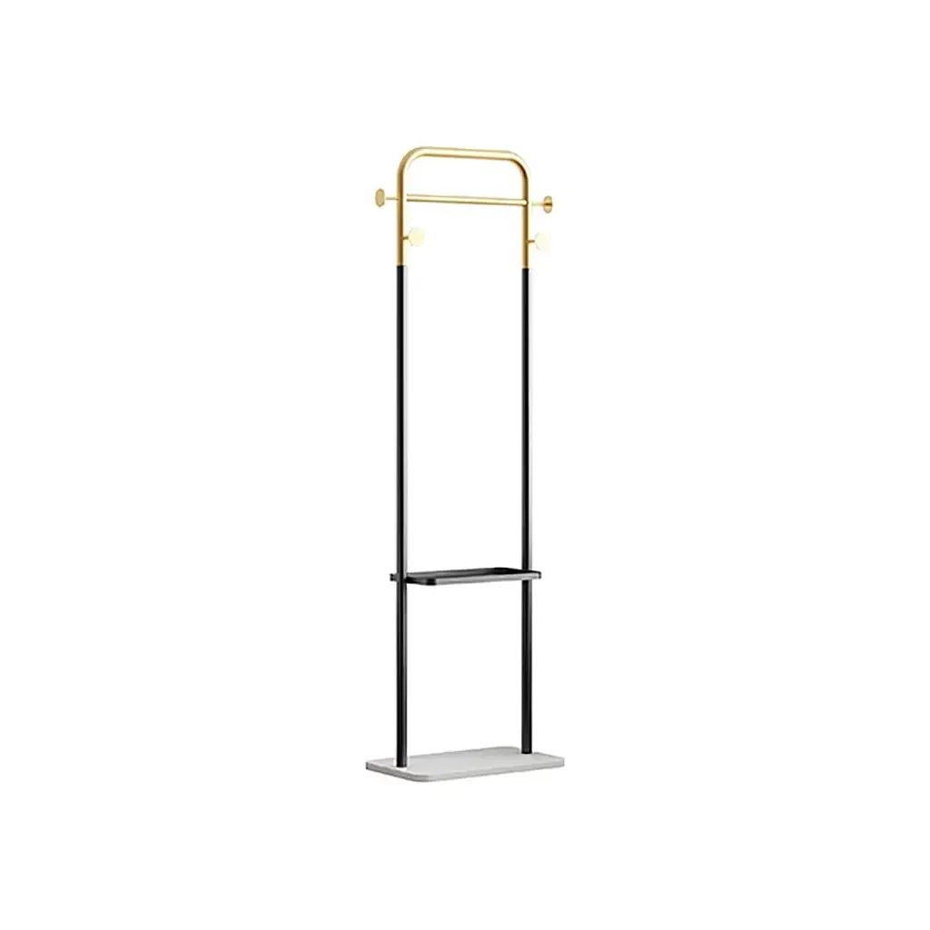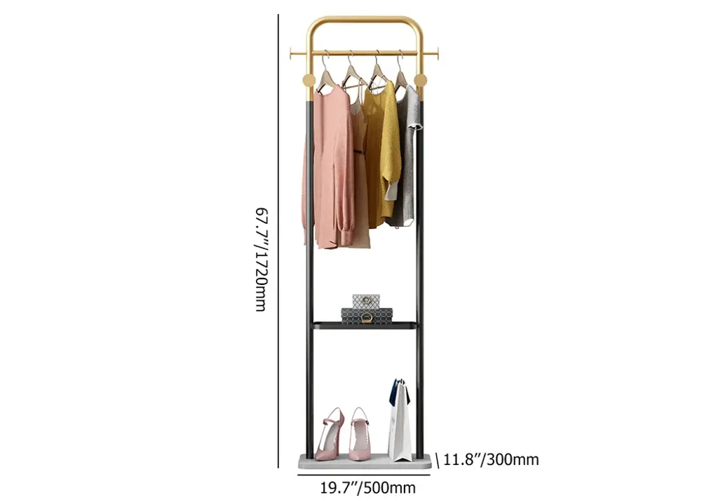 A versatile coat rack perfect for any space! Use it in your entryway or bedroom to organize your clothes. Despite its tiny footprint, it boasts impressive storage capacity. Crafted with a sturdy marble base for stability and ample hanging capacity. Hang your scarves, hats, and jackets with ease. The middle tray is perfect for storing handbags, accessories, and more, while the lower level provides ample space for your shoes. Ideal for tiny homes, apartments, dorms, or condos. Its simple design seamlessly blends with any decor style.