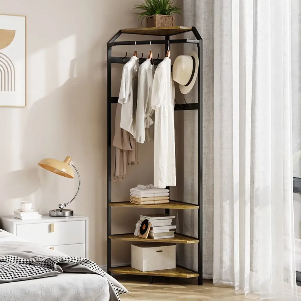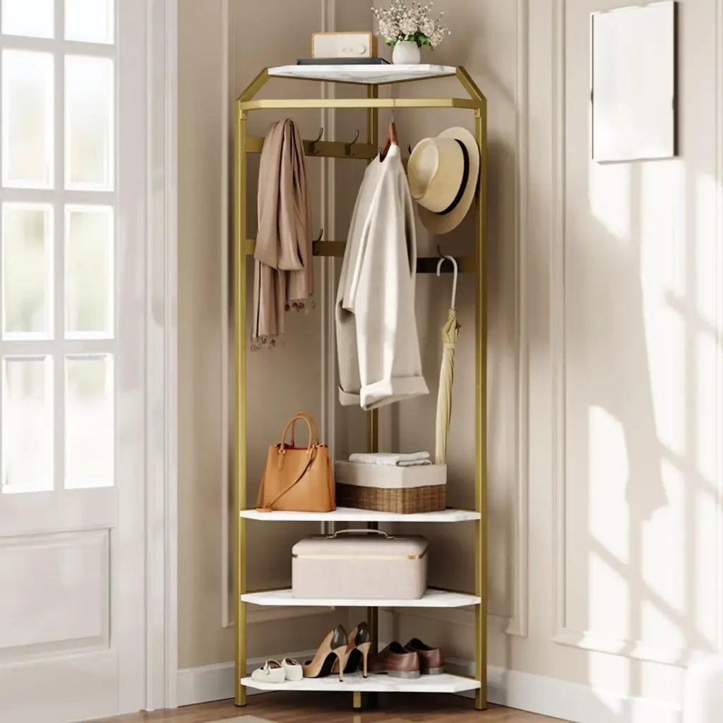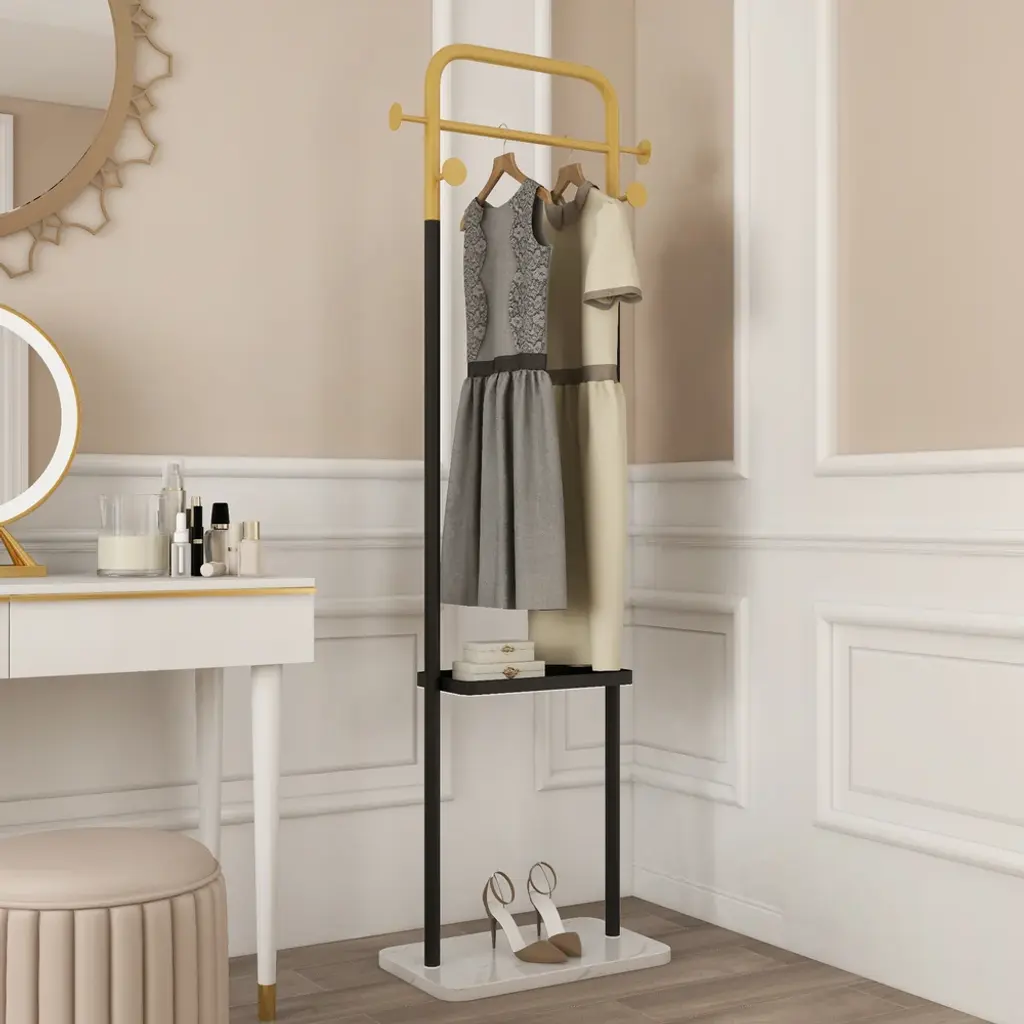 A versatile coat rack perfect for any space! Use it in your entryway or bedroom to organize your clothes. Despite its tiny footprint, it boasts impressive storage capacity. Crafted with a sturdy marble base for stability and ample hanging capacity. Hang your scarves, hats, and jackets with ease. The middle tray is perfect for storing handbags, accessories, and more, while the lower level provides ample space for your shoes. Ideal for tiny homes, apartments, dorms, or condos. Its simple design seamlessly blends with any decor style.