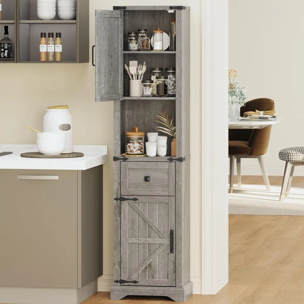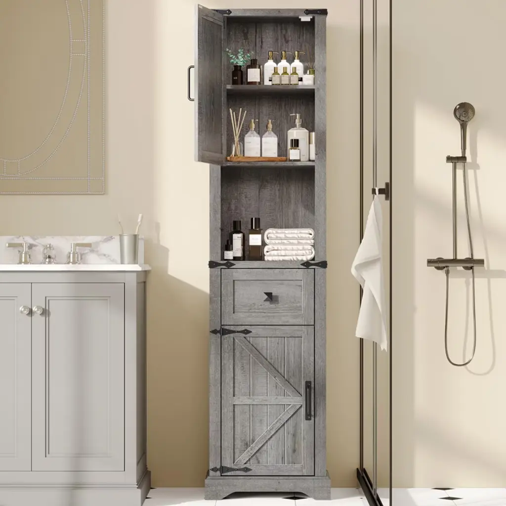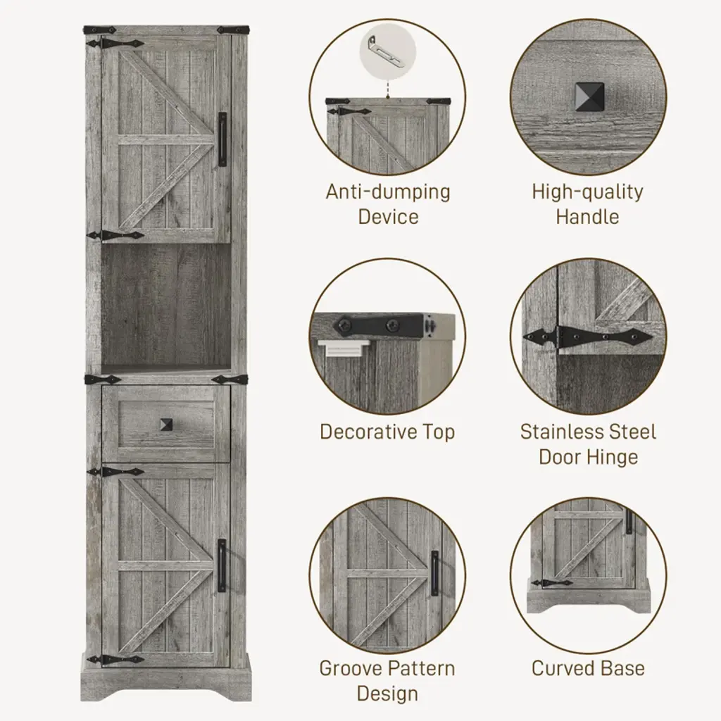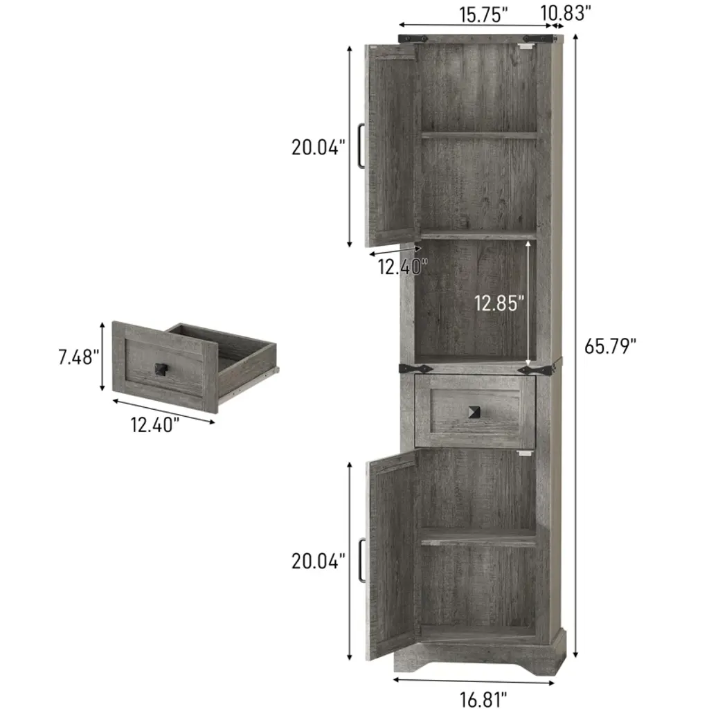 This 65.79" tall farmhouse storage cabinet features a unique wood grain finish with metal trim and a rustic barn door style, blending charming rustic appeal to fit living rooms, kitchens, or bathrooms. Measuring 10.83"D x 16.81"W x 65.79"H, its adjustable and removable shelves offer versatile, customizable storage, perfect for small spaces. The design fuses industrial and farmhouse styles with black matte metal accents. Made of premium engineered wood, it’s sturdy with strong load-bearing capacity, plus a back anti-tipping device for safety.