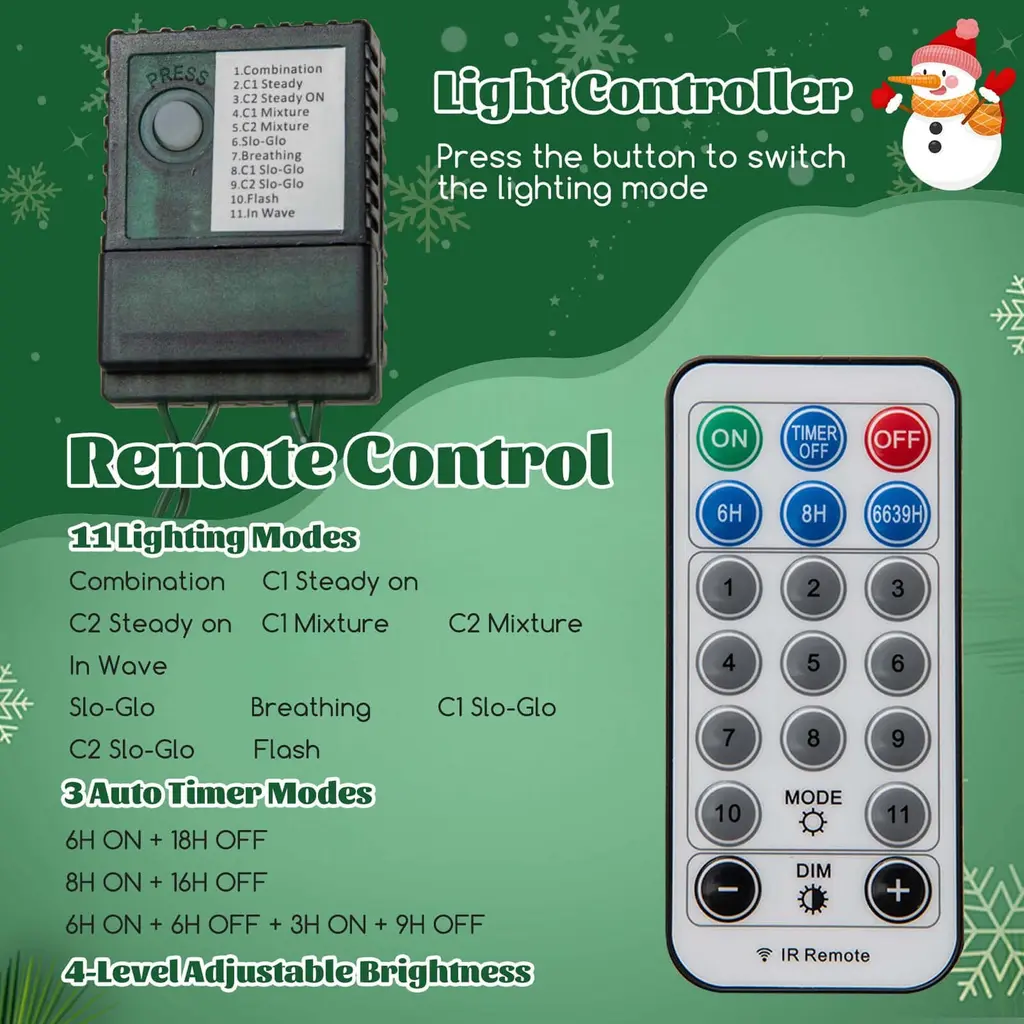 The 6/7.5 ftXmas tree boasts 721 realistic branch tips. Crafted from premium PE and PVC, this tree is fireproof, non-allergic, anti-fading, and smell-free. Customize the ambiance with 300/400 LED lights offering warm white and multi-color options. In addition, the versatile Xmas decoration offers 11 lighting modes. This tree also boasts 3 auto timer modes. As needed, you can customize the 4-level adjustable brightness. Enjoy the convenience of 2 control options through a remote control and light controller, with a memory function to save your settings. The hinged structure and folding metal stand ensure easy setup, while included gloves protect your hands during assembly. Features:Specification