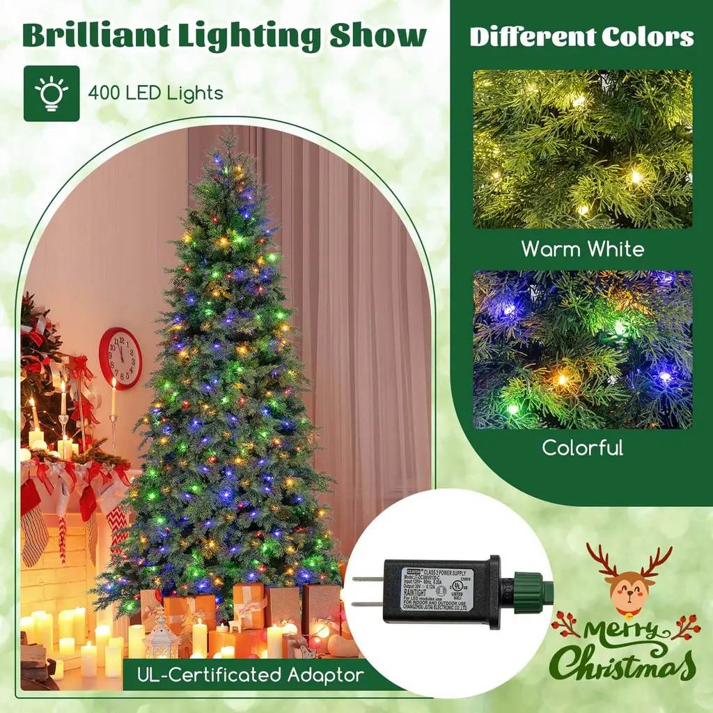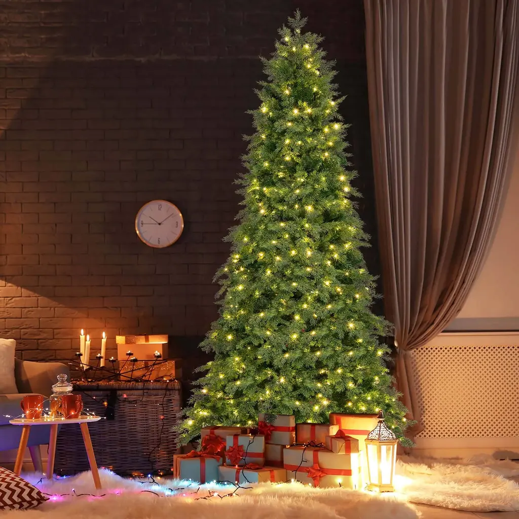 The 6/7.5 ftXmas tree boasts 721 realistic branch tips. Crafted from premium PE and PVC, this tree is fireproof, non-allergic, anti-fading, and smell-free. Customize the ambiance with 300/400 LED lights offering warm white and multi-color options. In addition, the versatile Xmas decoration offers 11 lighting modes. This tree also boasts 3 auto timer modes. As needed, you can customize the 4-level adjustable brightness. Enjoy the convenience of 2 control options through a remote control and light controller, with a memory function to save your settings. The hinged structure and folding metal stand ensure easy setup, while included gloves protect your hands during assembly. Features:Specification