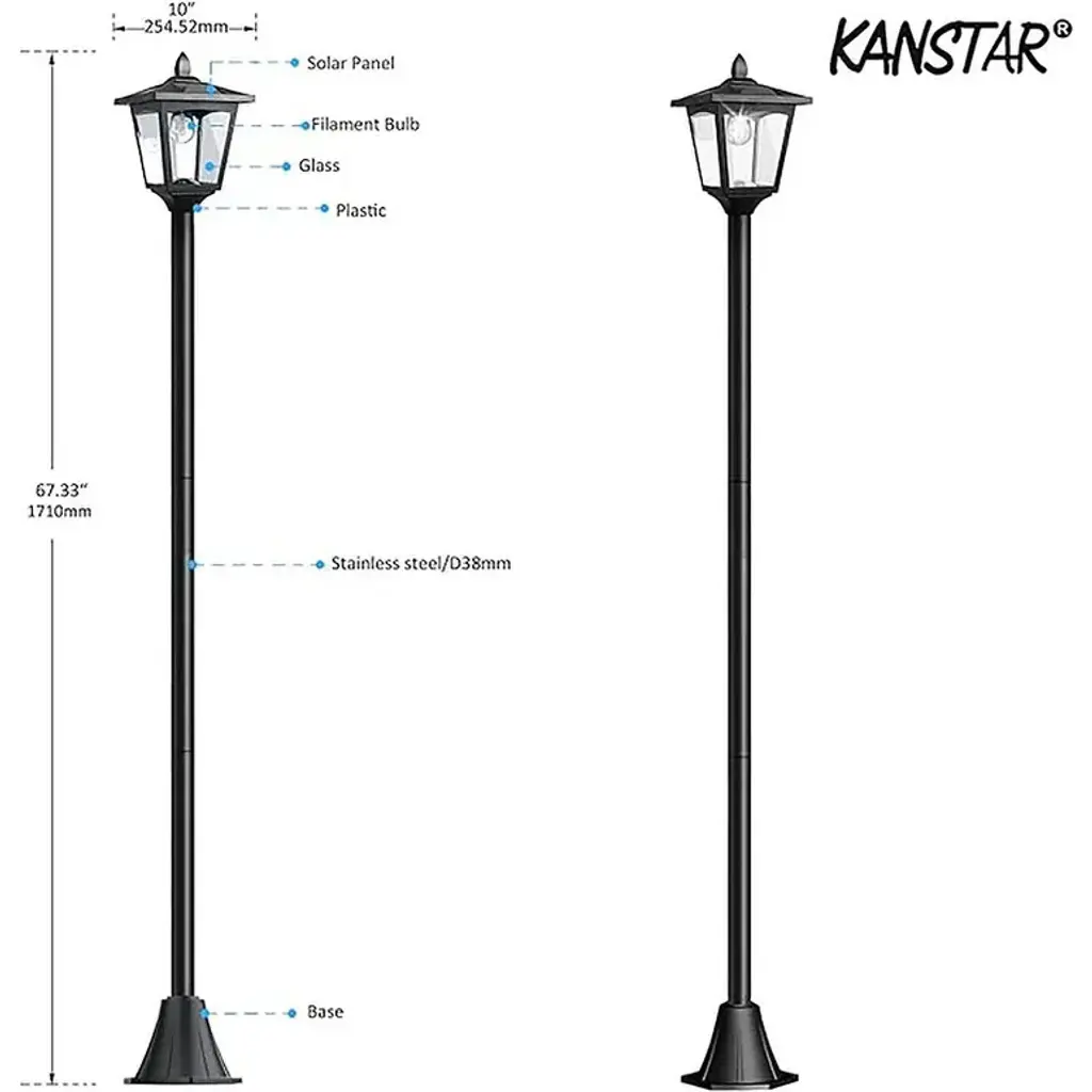 Solar Powered & Energy Saving: This 67" solar lamp post light charges via built-in solar panels, providing bright LED illumination at night. With a dusk to dawn sensor, it automatically turns on and off—no wiring or electricity needed. Perfect for energy-efficient outdoor lighting. Adjustable Height for Versatile Placement: Featuring sectional poles, this solar lamp post is adjustable up to 67", ideal for lawn borders, garden paths, walkways, and patios. Customize the height for your specific outdoor lighting needs. Waterproof & Durable: Crafted from UV-coated plastic and aluminum die-cast, this solar lamp post is IP65 waterproof, ensuring reliable performance in all weather conditions—rain, snow, or intense sunlight. Easy Assembly & Low Maintenance: With pre-installed AA Ni-Cd batteries and all necessary anchors and screws, setup is quick and easy. Place it in a sunny spot for year-round, maintenance-free illumination in your driveway, garden, or patio. Bright LED Illumination: Equipped with 4 high-efficiency LEDs, this solar lamp post provides a soft, white glow, enhancing safety and ambiance for walkways, flower beds, and other outdoor spaces.