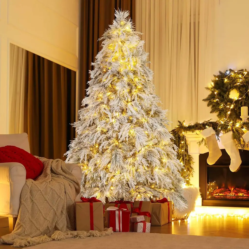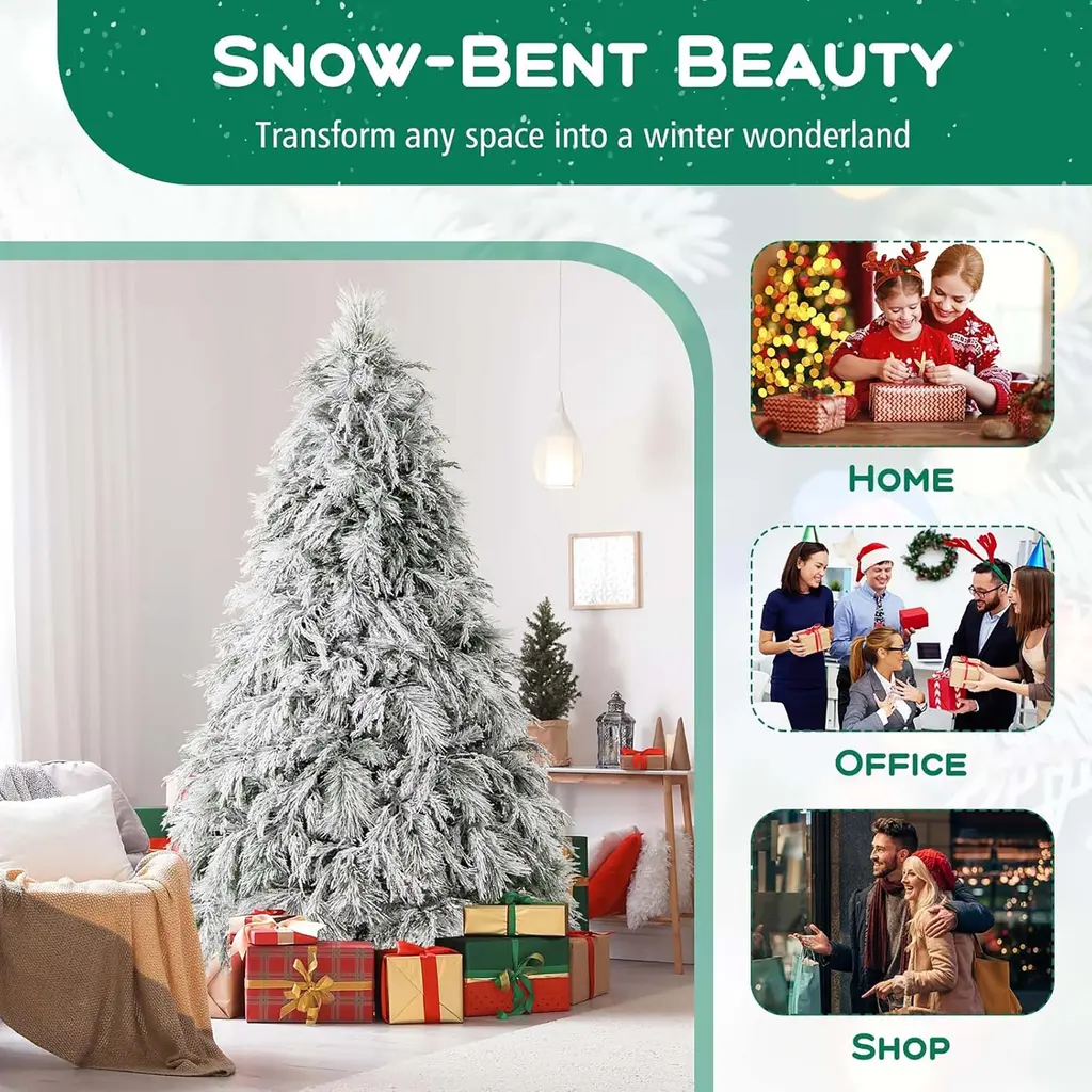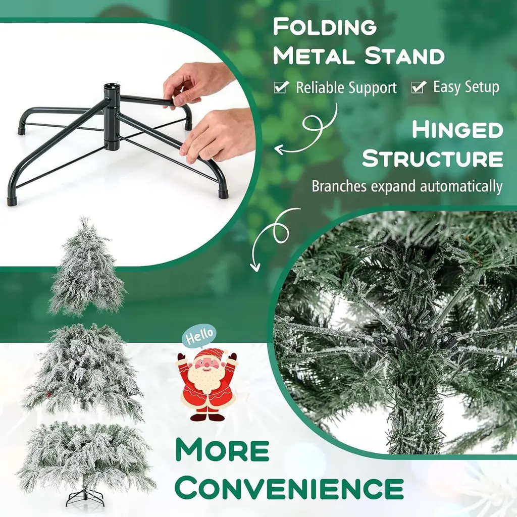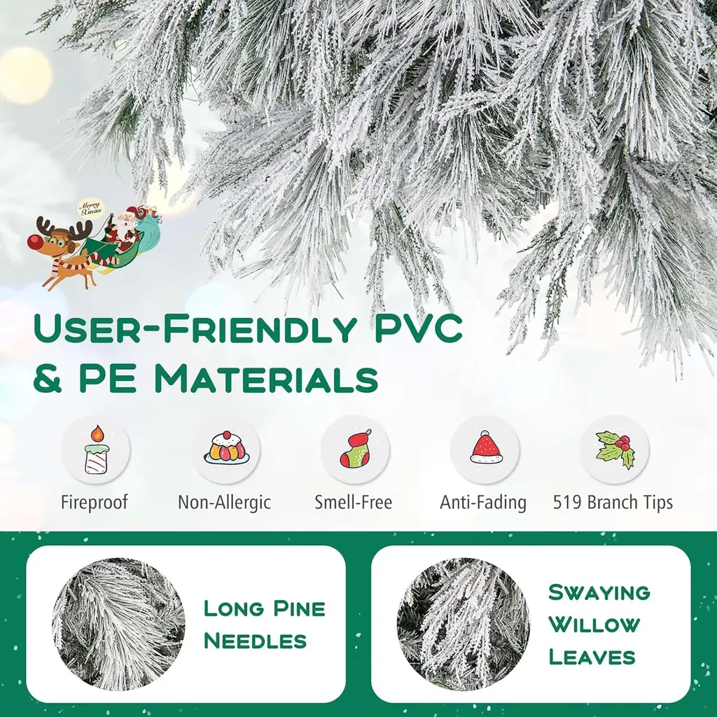 6/7ft Pre-Lit Flocked Christmas Tree Hinged Artificial Xmas Tree - 6 Foot