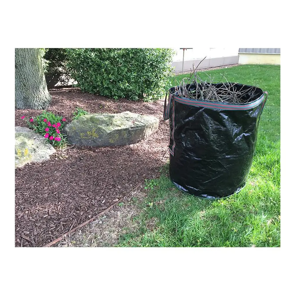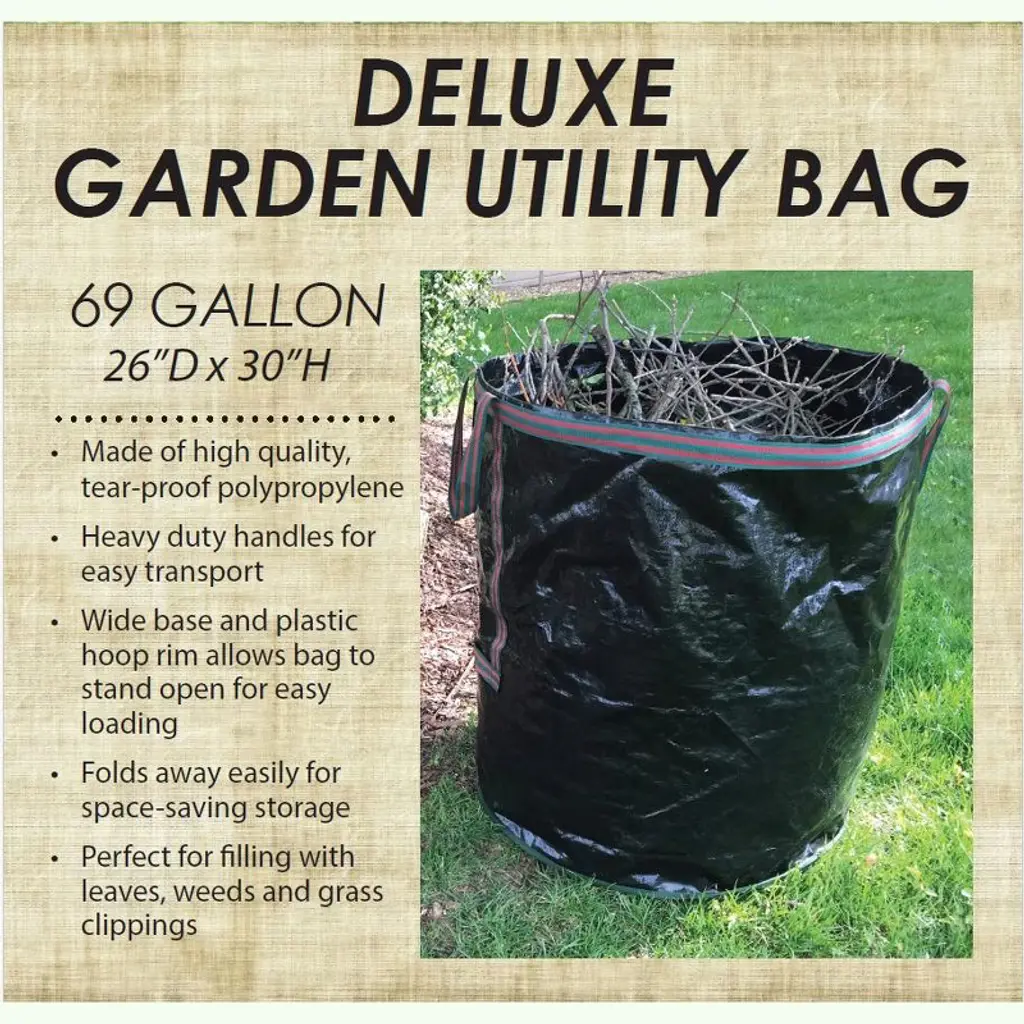 Self-standing Deluxe 69 or 51 gallon Black Tip Bag makes yard clean-up a snap! Made of high quality tear-proof poylpropylene and heavy duty handles on each side. Wide base and plastic hoop rim allows the bag to stand open on its own for easy loading. Perfect for filling with leaves weeds or grass clippings to add to your composting.