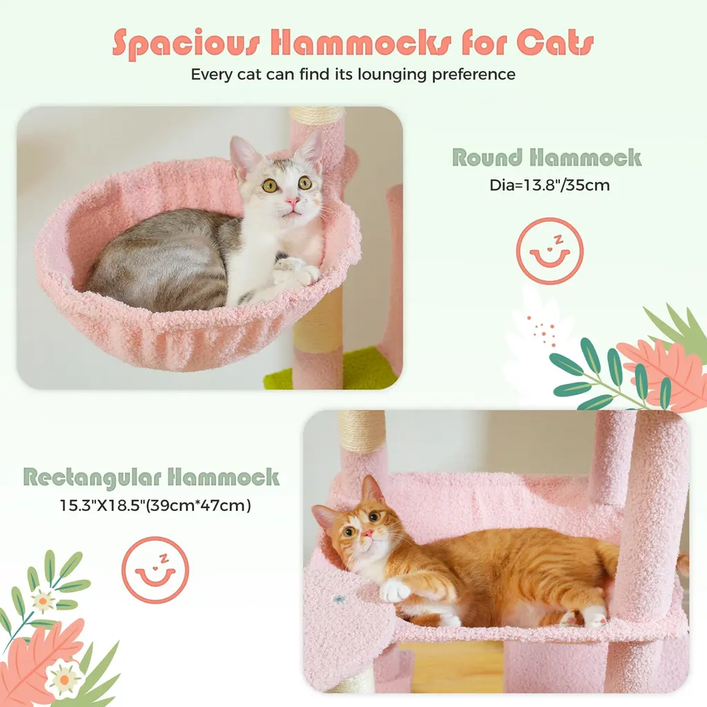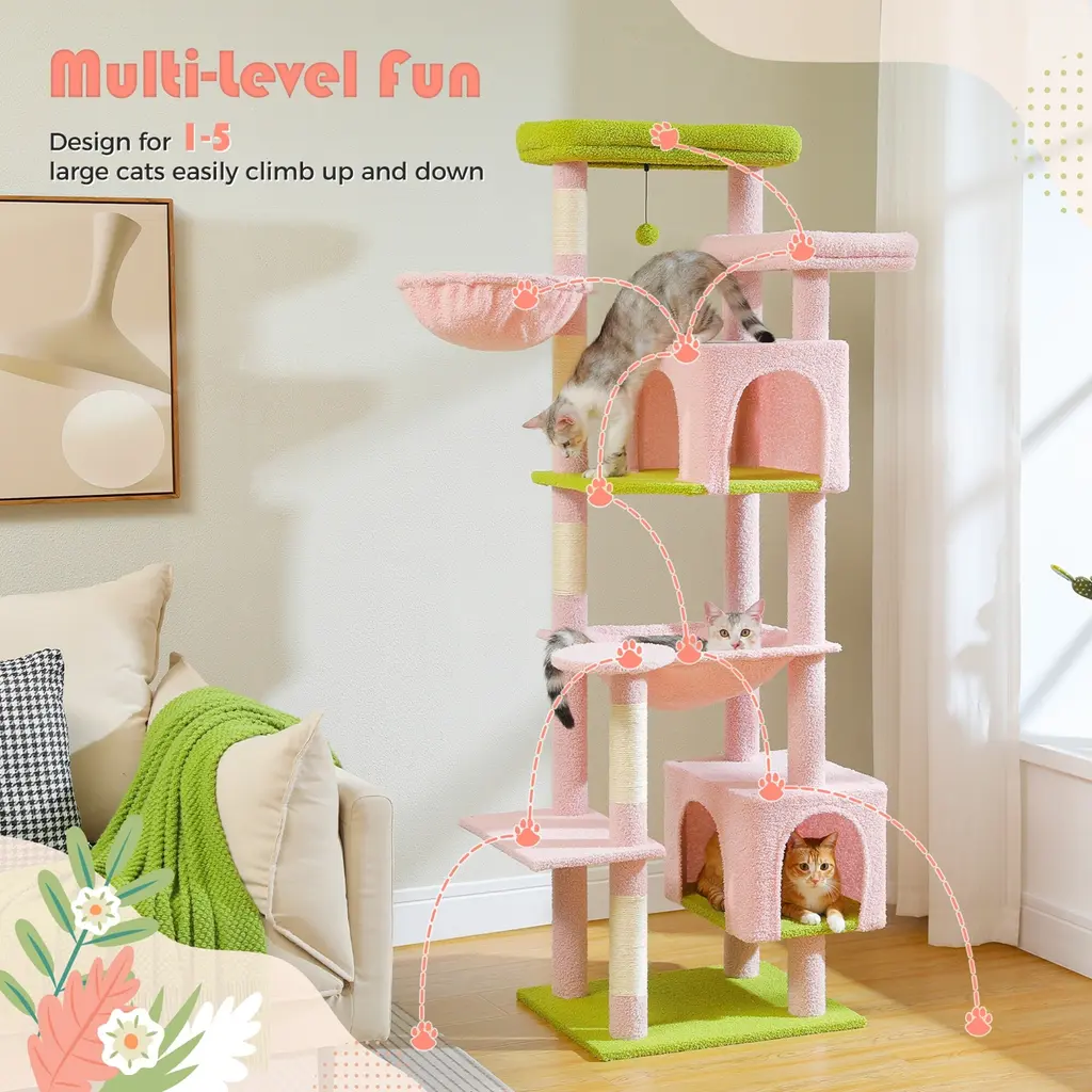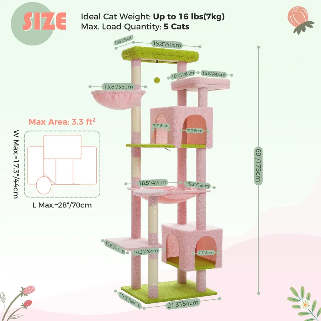 69" Tall Cat Tree Tower For Indoor Large Cats With Super Large Hammock, Scratching Posts, Condo House And Large Top Perch - Pink