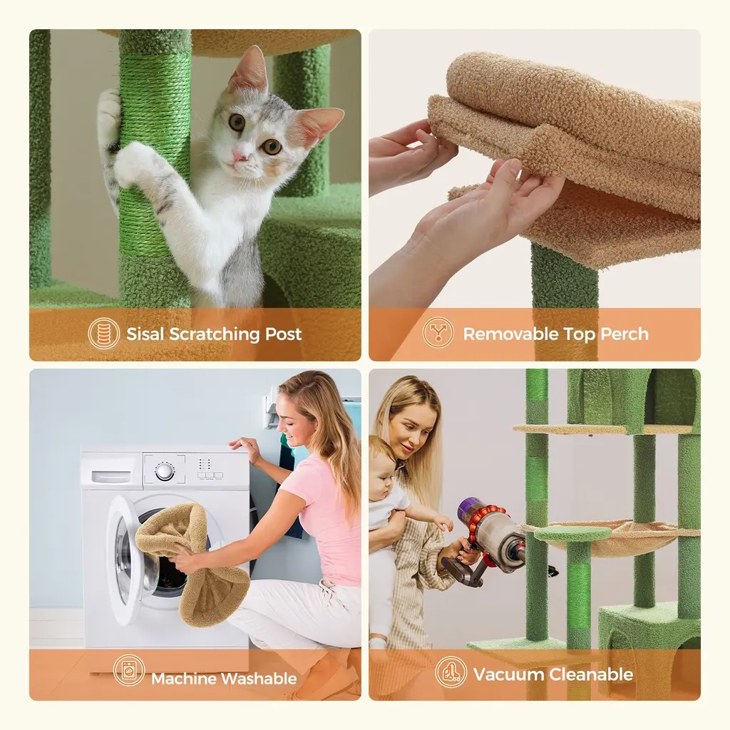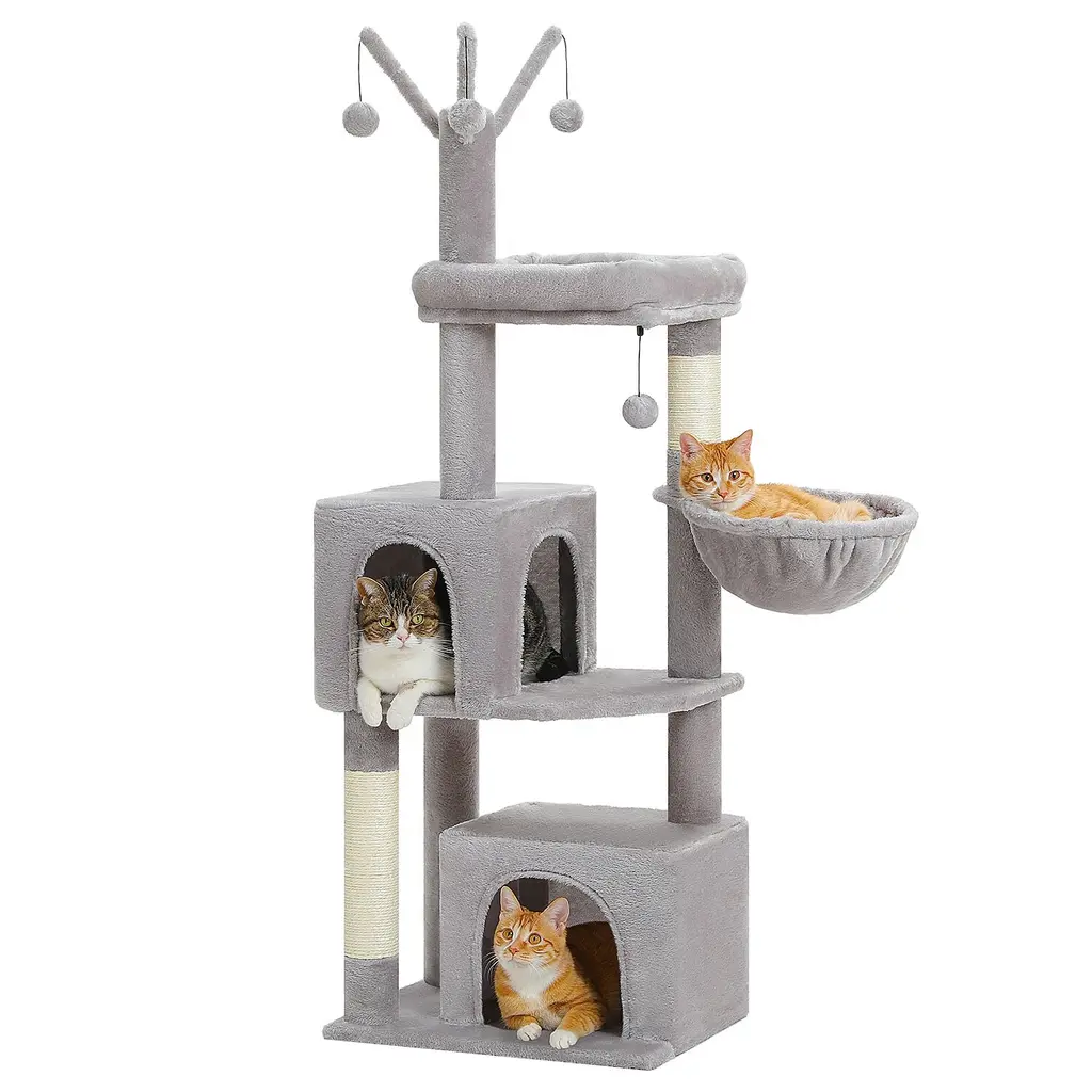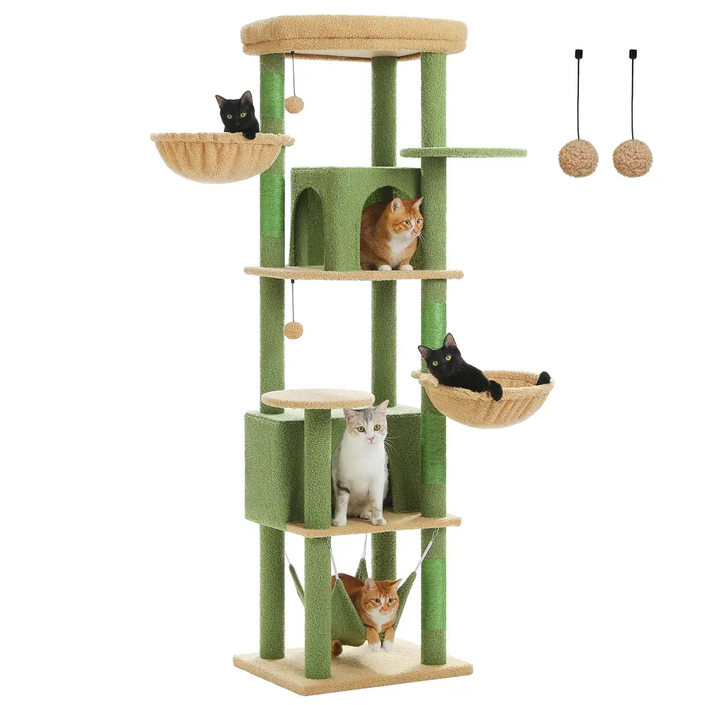 Give your feline companions the ultimate playground with the 69"H Large Cat Tree. This premium cat tree is designed to provide hours of fun, exercise, and relaxation for your beloved cats. Spacious and Versatile: The 69"H Large Cat Tree offers ample space for your furry friends to climb, play, and rest. It comes with 2 cozy perches, 2 comfortable cat condos, 1 entertaining toy ball, scratching posts, and 2 relaxing hammocks, providing various activities to keep your cats engaged and entertained. Premium Material: Crafted with high-quality materials, including sturdy wood, durable cardboard, soft plush, and sisal, this cat tree ensures long-lasting durability and stability. The plush surfaces provide a cozy and comfortable spot for your cats to relax, while the sisal scratching posts help satisfy their natural urge to scratch and protect your furniture. Multiple Levels for Exploration: With multiple levels and platforms, your cats can easily climb up and down, explore their surroundings, and observe from different heights. This promotes exercise, stimulates curiosity, and satisfies their natural instincts. Easy Assembly: The 69"H Large Cat Tree is easy to assemble with detailed instructions included. The parts are designed to fit securely, ensuring the stability and safety of the structure for your cats' enjoyment. Color Variation: Please note that the actual product color may vary slightly from the images due to lighting and monitor settings. If you have any questions or concerns about the color, please feel free to contact us, and we will be happy to provide further assistance.