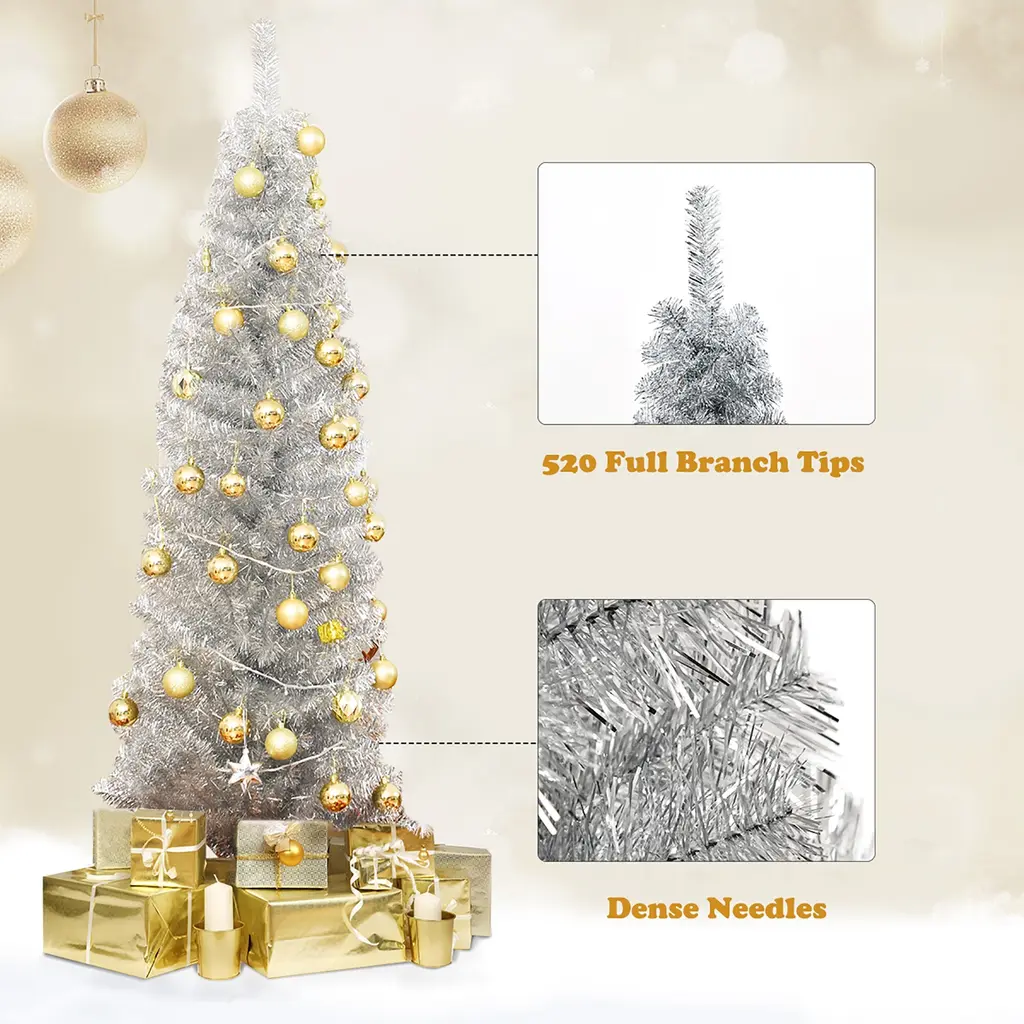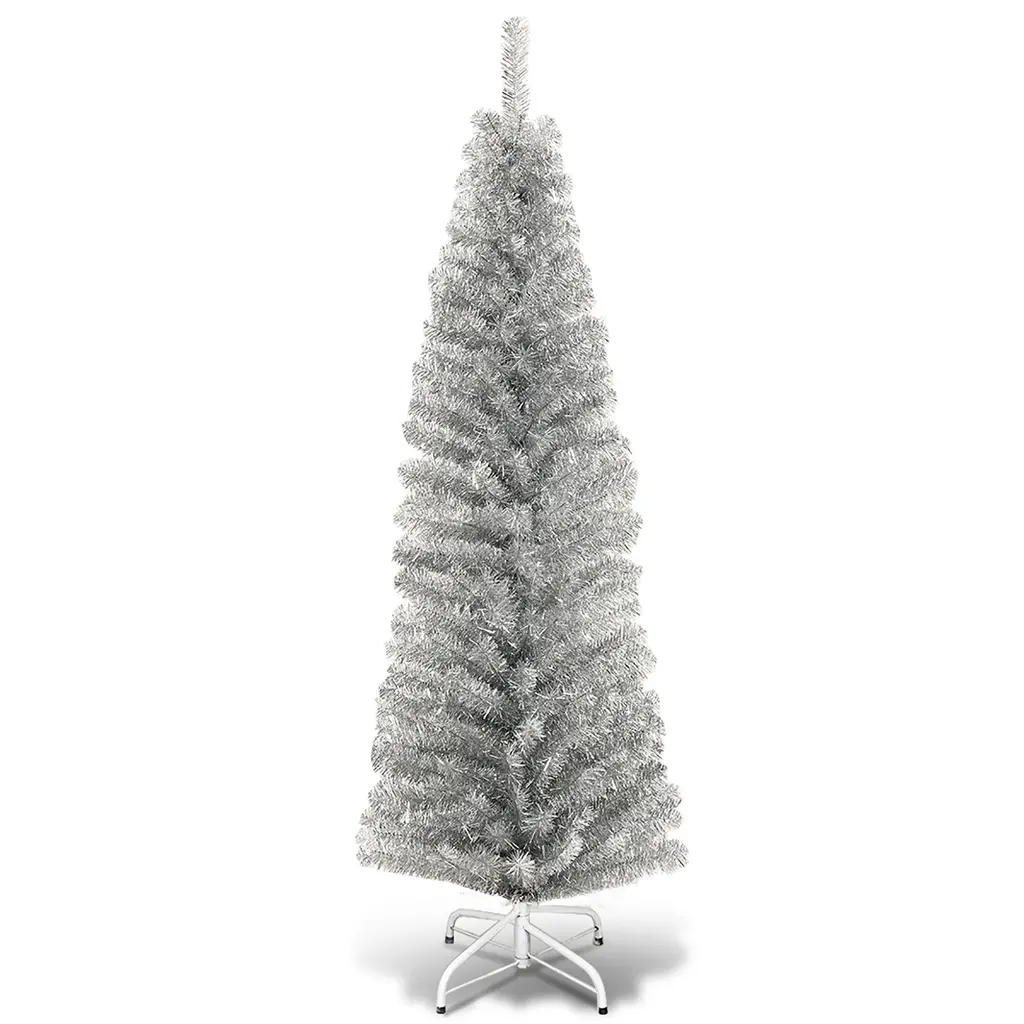 DescriptionOur brand new 6ft Artificial Christmas tree features slim pencil design, which is great for display in corners, small rooms and areas with limited floor space. The tree is made of fade and crush resistant PVC needles, appears fresh-cut. It is perfect for indoor and outdoor decoration at Christmas for your home.Features New Material PVC needles for safe useDistinctive and eye-catching tree520 branch tips design to help emulate a real Christmas treeThe sturdy stand provides the tree greater support and prevent the base from breakingSlim pencil design is great for display in corners, small rooms and areas with limited floor spaceGet festive and use this tree for the holidays, or add a touch of nature to your home year-roundPerfect for indoor and outdoor decoration at Christmas for your homeEasy to store with portable design SpecificationColor: Blue\Champagne\SilverMaterial: PVC + IronHeight: 6ftBase Wide: 1.6ftNet Weight: 7.3 lbs\6 lbsPackage Includes:1 x Pencil Christmas Tree1 x Stand1 x Instruction
