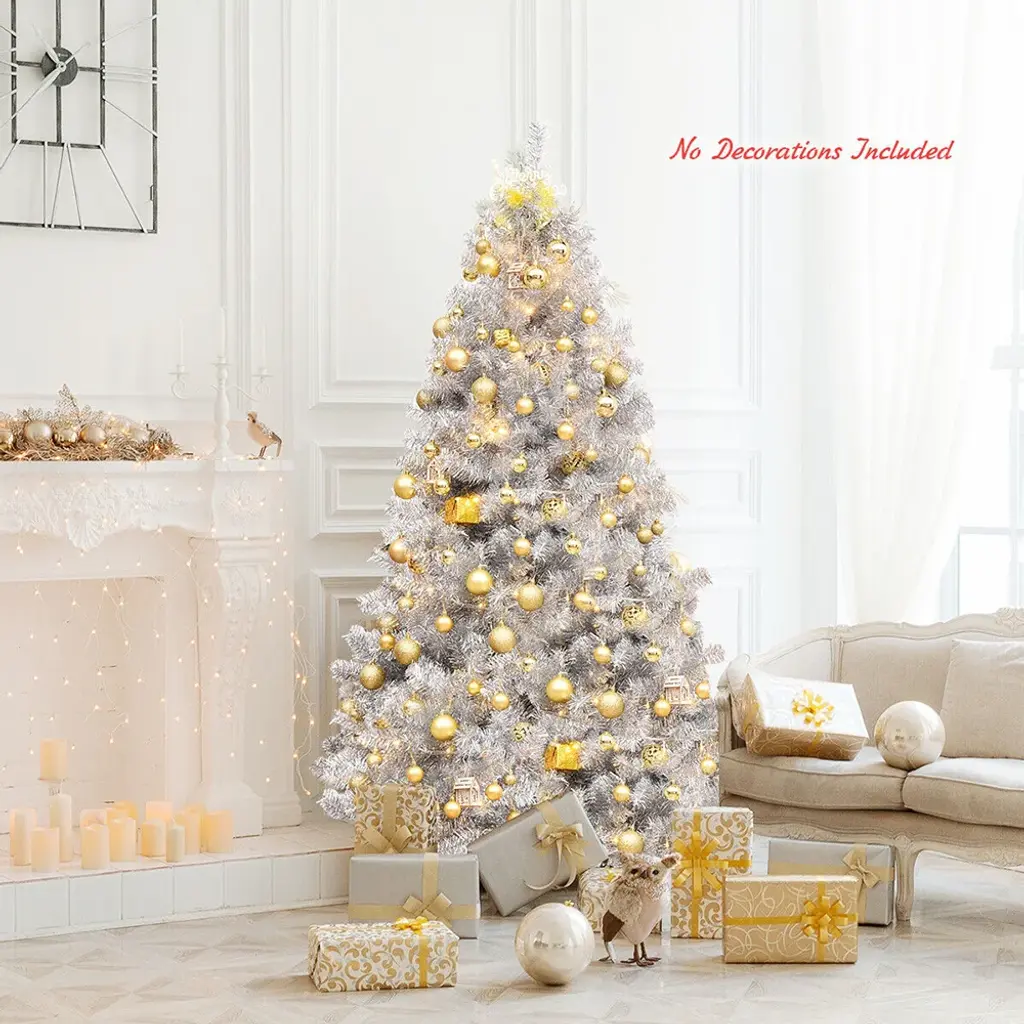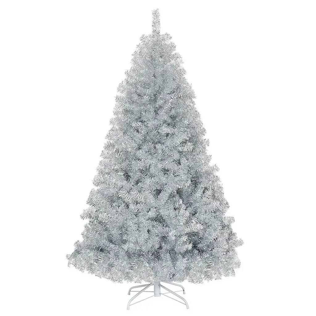 ▌ PRODUCT DETAILS: Description: Our Christmas tree is an ideal choice to imbue your home with holiday atmosphere! This tree is tall, leafy and fluffy with 1036 branch tips, which will be a great decoration at Christmas. It is crafted of premium PVC material with odorless tinsel film, which is fire-resistant and non-allergenic for a long lifespan. And the metal stand offers high stability and sturdiness to help the tree stay straight in the wind. You can use the Christmas tree whether indoor or outdoor. What's more, the branches are connected to the trunk by hinges to set up effortlessly in a short time. With unique silver design, it is an eye-catching addition in home, office, shop, etc. Note: Lights and ornaments are not included Features: 1036 branch tips for leafy and realistic appearance Environmental-friendly PVC material, crush resistant and durable Non-flammable and non-allergenic tinsel film for a safe environment Sturdy metal stand with antiskid foot caps to ensure stability and balance Perfect for indoor and outdoor decoration at Christmas for your home Unique silver design for an eye-catching addition Ideal for home, office, shops, school, etc Come in 3 tree trunks with hinged design for quick assembly and easy storage No extra decorations on the tree expect branches for exerting your imagination Specifications: Color: Silver Material: PVC + Tinsel Film + Iron Overall Dimensions: 3.7' x 6'(Dia x H) Number of Tips: 1036 Net Weight: 15 lbs Package Includes: 1 x Silver Tinsel Christmas Tree 1 x Metal Stand 1 x Instruction