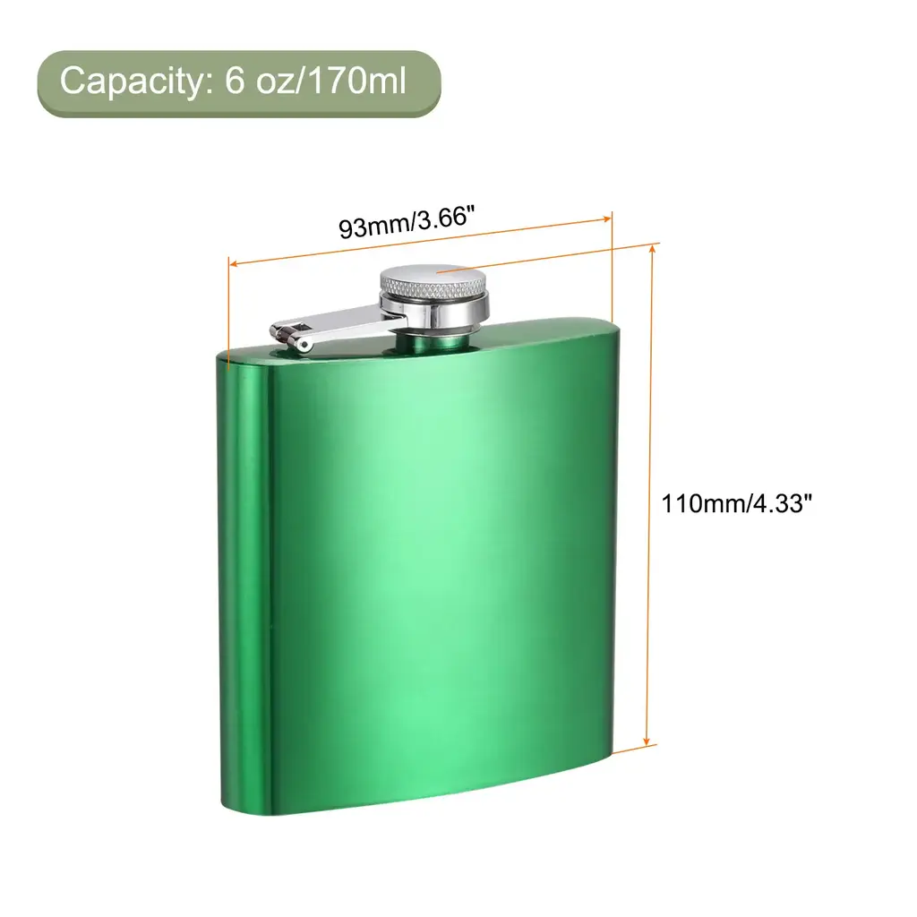 Description:Material - The hip flask is constructed from stainless steel material, with a plating surface finish for corrosion resistance, wear resistance, sturdy construction, not easy to rust and deform, and has long-lasting durability.Leak Proof - The cap of our hip flask is sealed tightly to ensure that wine or beverages will not leak out and be wasted. Furthermore, the cap features a hinged design which is connected to the flask, ensuring that they are not misplaced and lost.Easy to Carry - The shape of the flask is flat and rectangular, portable to carry out for outdoor activities, allowing it to easily fit into pockets, bags, or hidden compartments and not occupy much space. Store it anywhere, drink anytime and anywhere.Multifunctional Application - The portable hip flask can be brought while camping, fishing, picnic, boating, hiking and other outdoor or indoor activities to carry and store a small amount of liquor or other beverages.Warm Tips for First Use & Conservation - 1. Please rinse the flask inside with soap water and clean it up for the first time. 2. After using, please keep the flask always empty, clean and dry thoroughly when not used. 3. Better not to keep liquid in it for a long time.Specification:Material: Stainless SteelFinish: PlatingColor: BlackCapacity: 6 oz/170mlOverall Size: 110mm x 93mm/4.33-inch x 3.66-inch(L*W)Package Content:1pcs x Hip Flask
