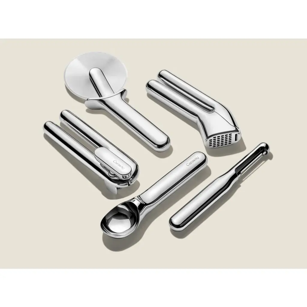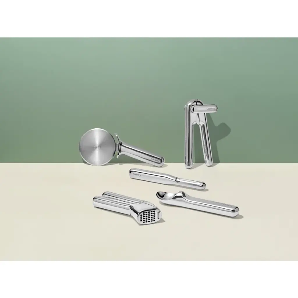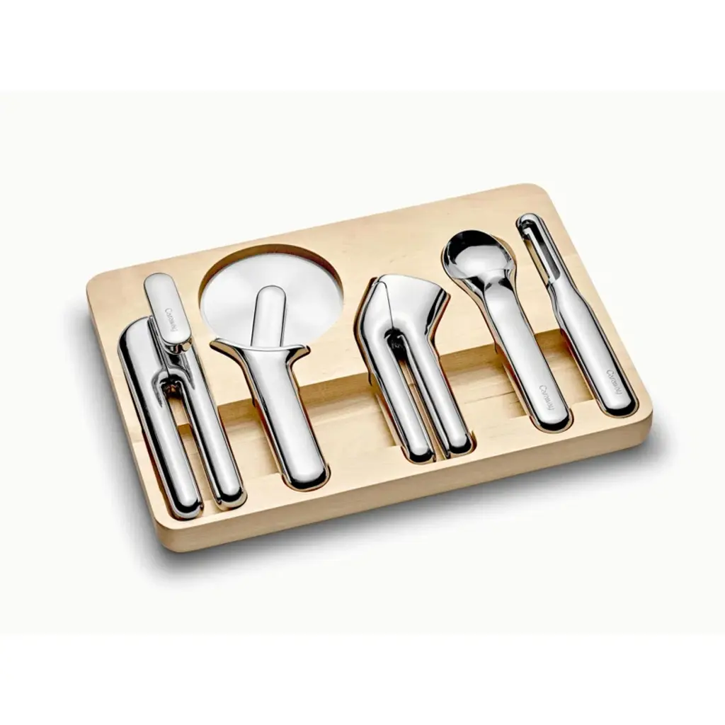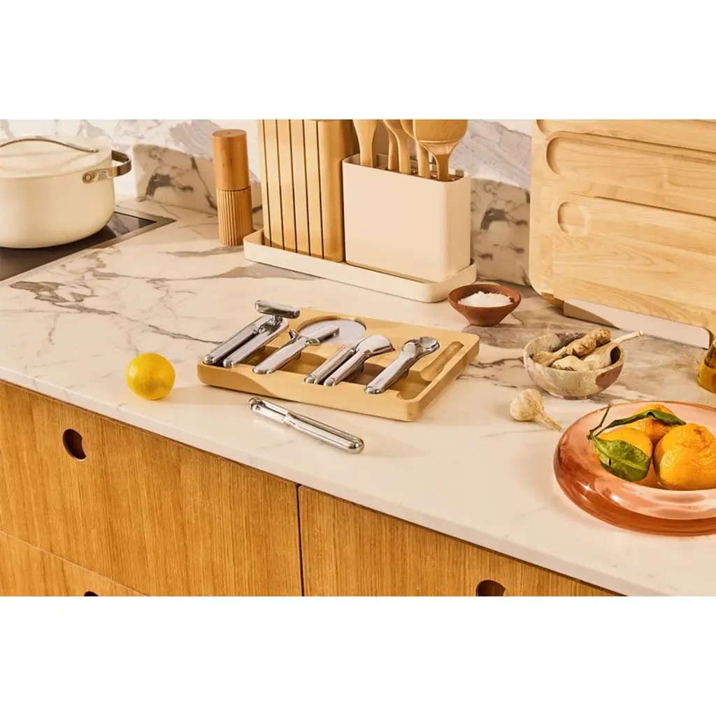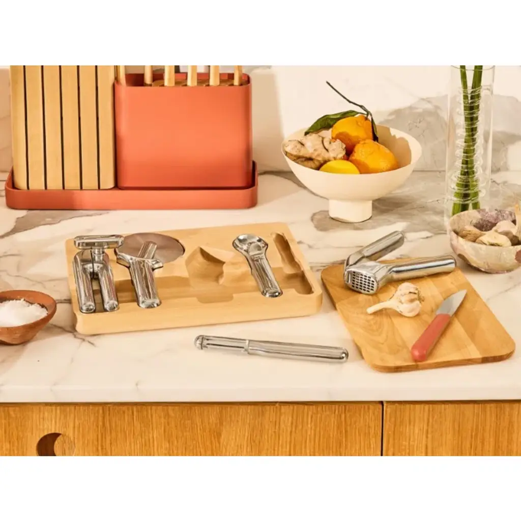 Crafted with non-toxic stainless steel, these 5 essential gadgets combine form and function. With no plastic or silicone, this first-ever premium line of kitchen tools is durable and easy to use. The included organizer, made of 100% FSC-certified birch wood, fits away neatly. Say goodbye to the junk drawer.