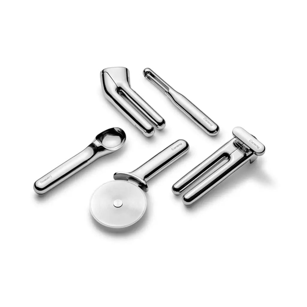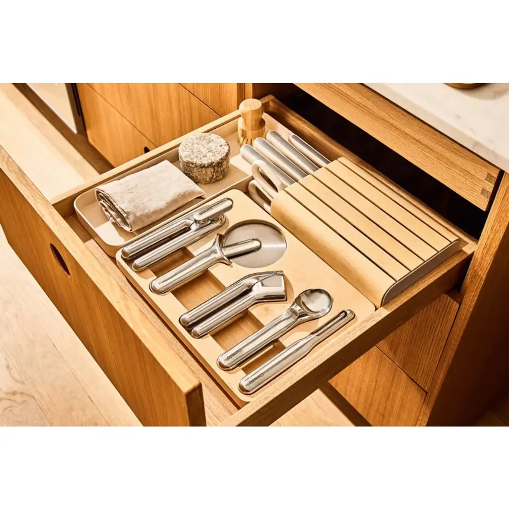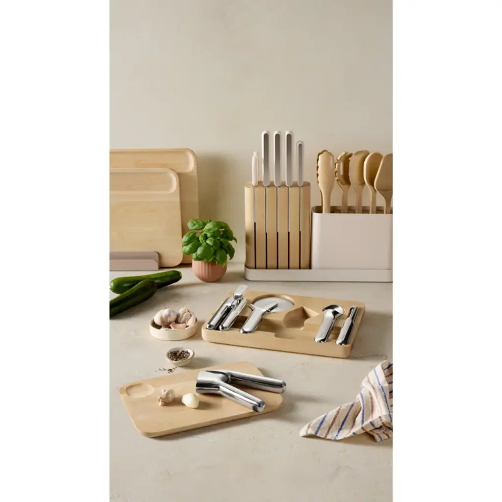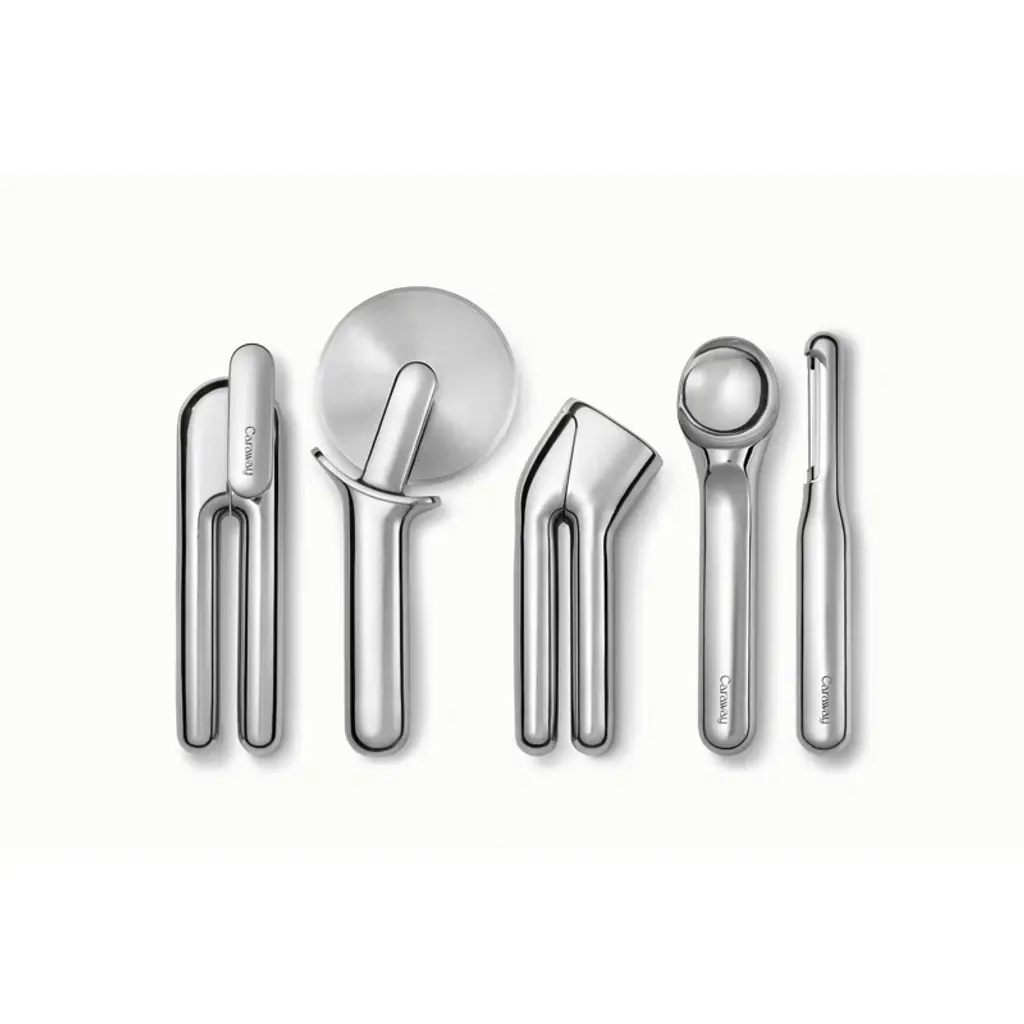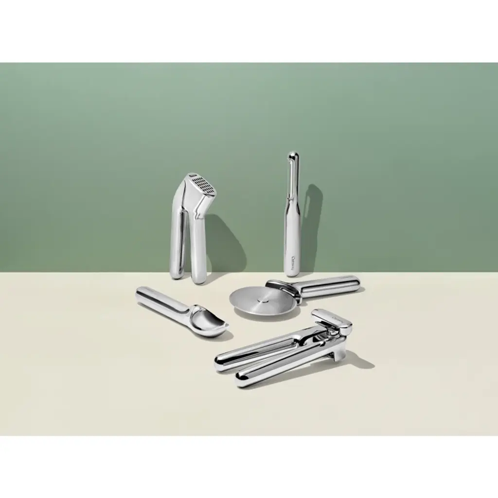 Crafted with non-toxic stainless steel, these 5 essential gadgets combine form and function. With no plastic or silicone, this first-ever premium line of kitchen tools is durable and easy to use. The included organizer, made of 100% FSC-certified birch wood, fits away neatly. Say goodbye to the junk drawer.