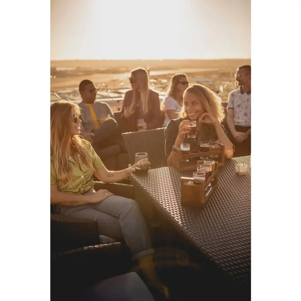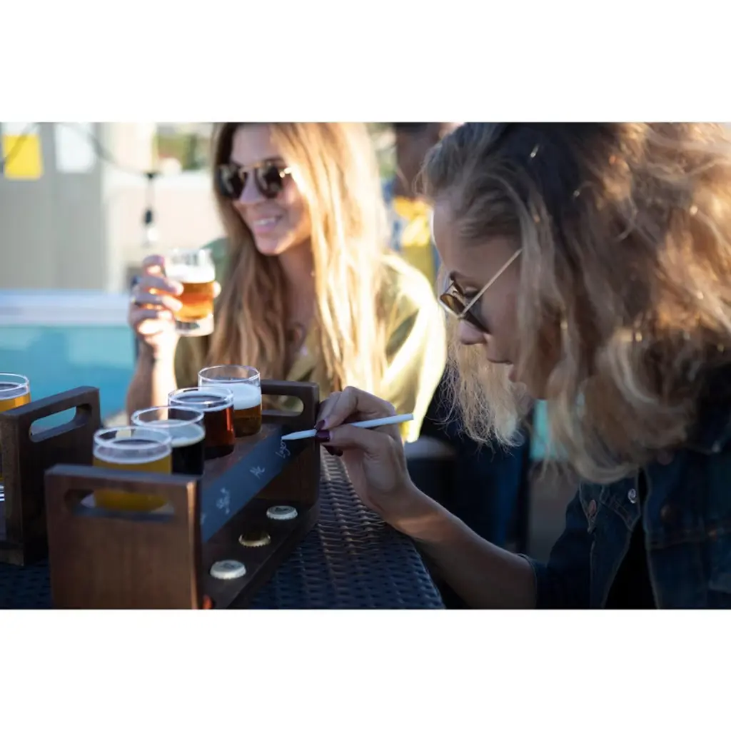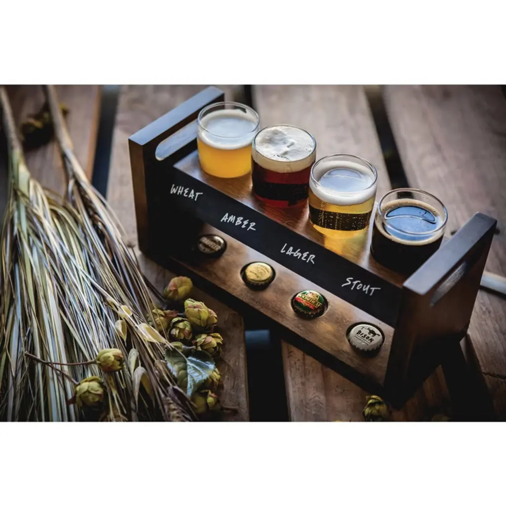The Craft Beer Flight Set is a stylish yet rugged beer flight tasting set made to delight ale aficionados and Pilsner poppers alike. This handsome two tiered acacia tray holds four 4 oz beer glasses suspended in the top shelf and includes a chalkboard panel, soapstone pencil, and hollowed areas to neatly hold beer caps. The ultimate housewarming or birthday gift for beer lovers, this beer set allows you to take the craft beer tasting experience home.