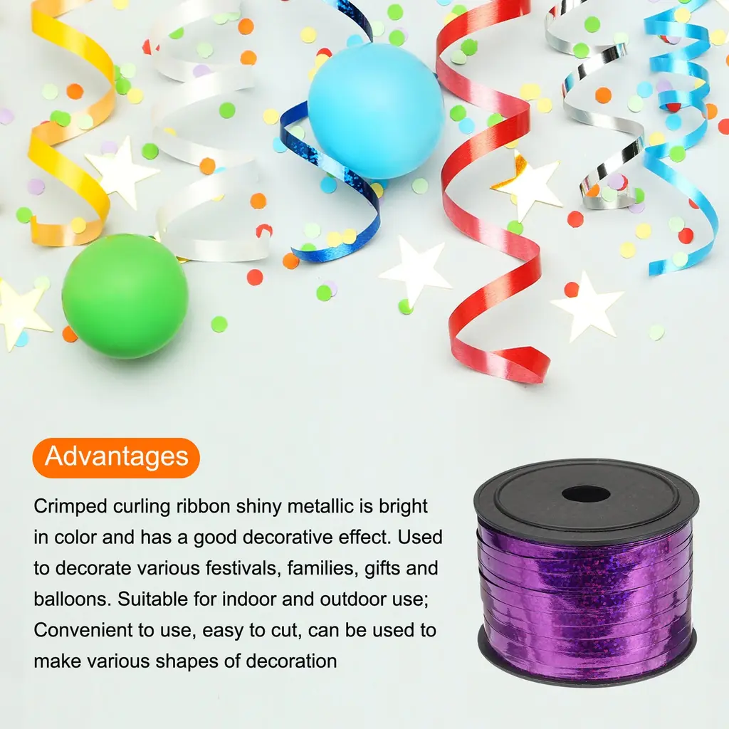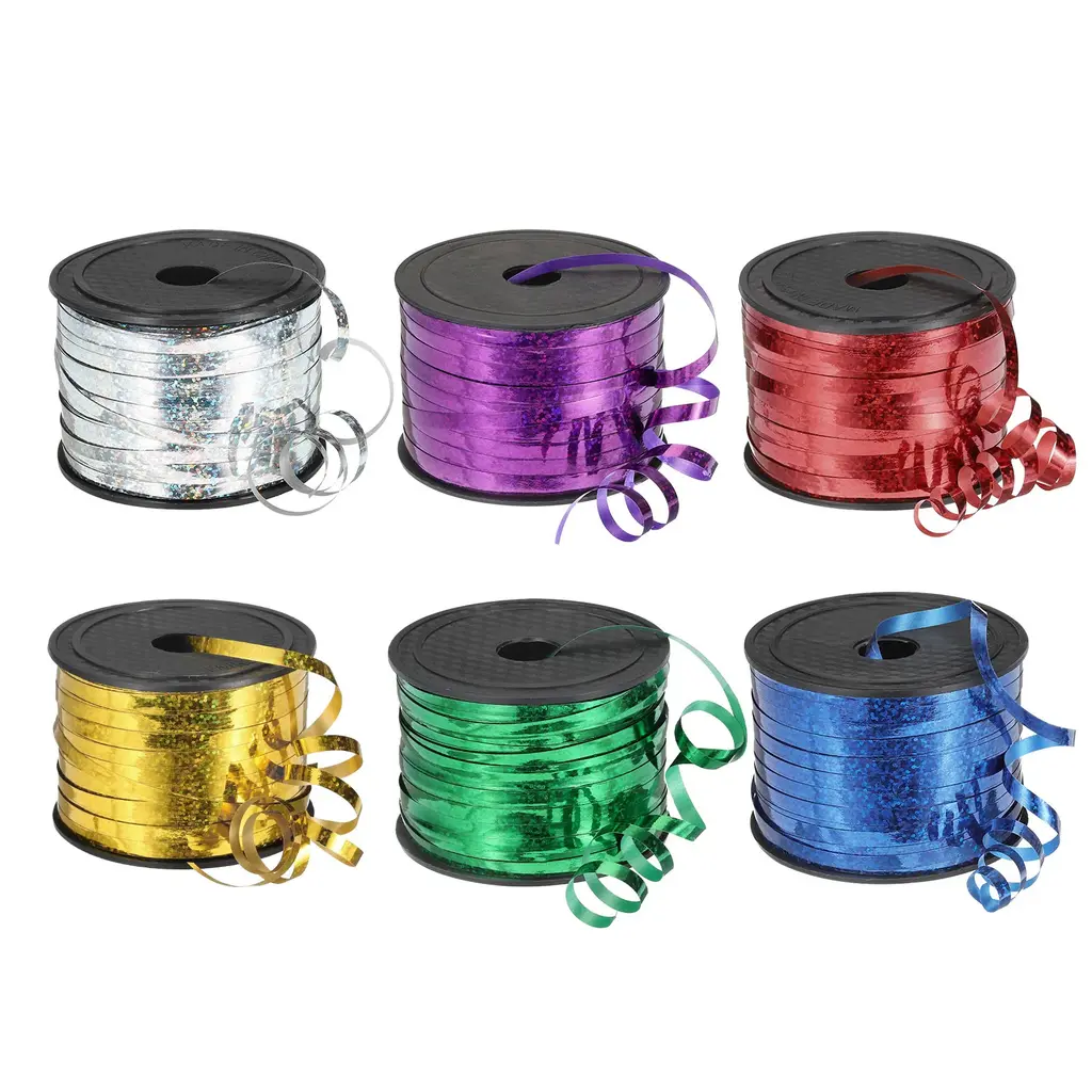 What is this?The glitter metallic shiny holographic glossy ribbon roll is bright in color, and suitable for various gifts, home, and party decorations, used for wrapping boxes, baskets, gifts, Christmas trees, decorations, balloon decorative metallic ribbons, handicrafts, scrapbooks, etc. It is suitable for weddings, Christmas, Valentine's Day, birthdays, and partiesWhat will I get?Curling ribbon, is in size of : 5mm(3/16-inch) width, 100 Yards total lengthIn the package of: 4 Roll x Curling ribbonIs there any advantages of the product?Crimped curling ribbon shiny metallic is bright in color and has a good decorative effect. Used to decorate various festivals, families, gifts and balloons. Suitable for indoor and outdoor use; Convenient to use, easy to cut, can be used to make various shapes of decorationHow to use it?Steps of installation: 1. Select metallic crimp ribbon with appropriate size; 2. Cut to the length you want; 3. Used as decorative ribbon to decorate balloons, gifts, festivals, weddings, etc.What should I notice?Please select the appropriate size metallic crimp ribbon
