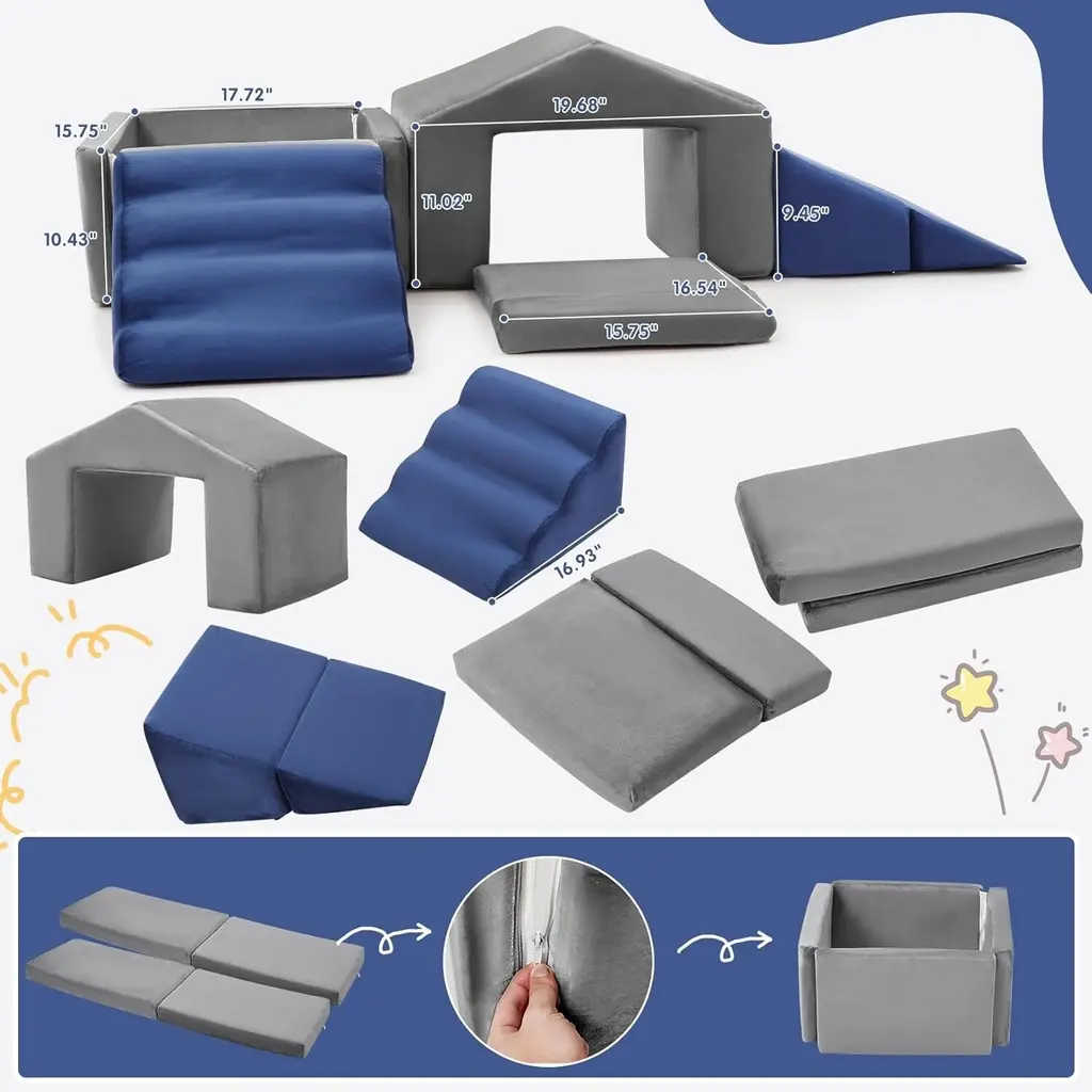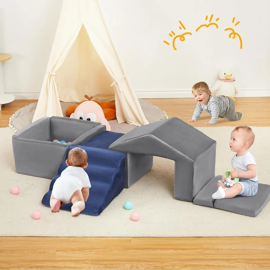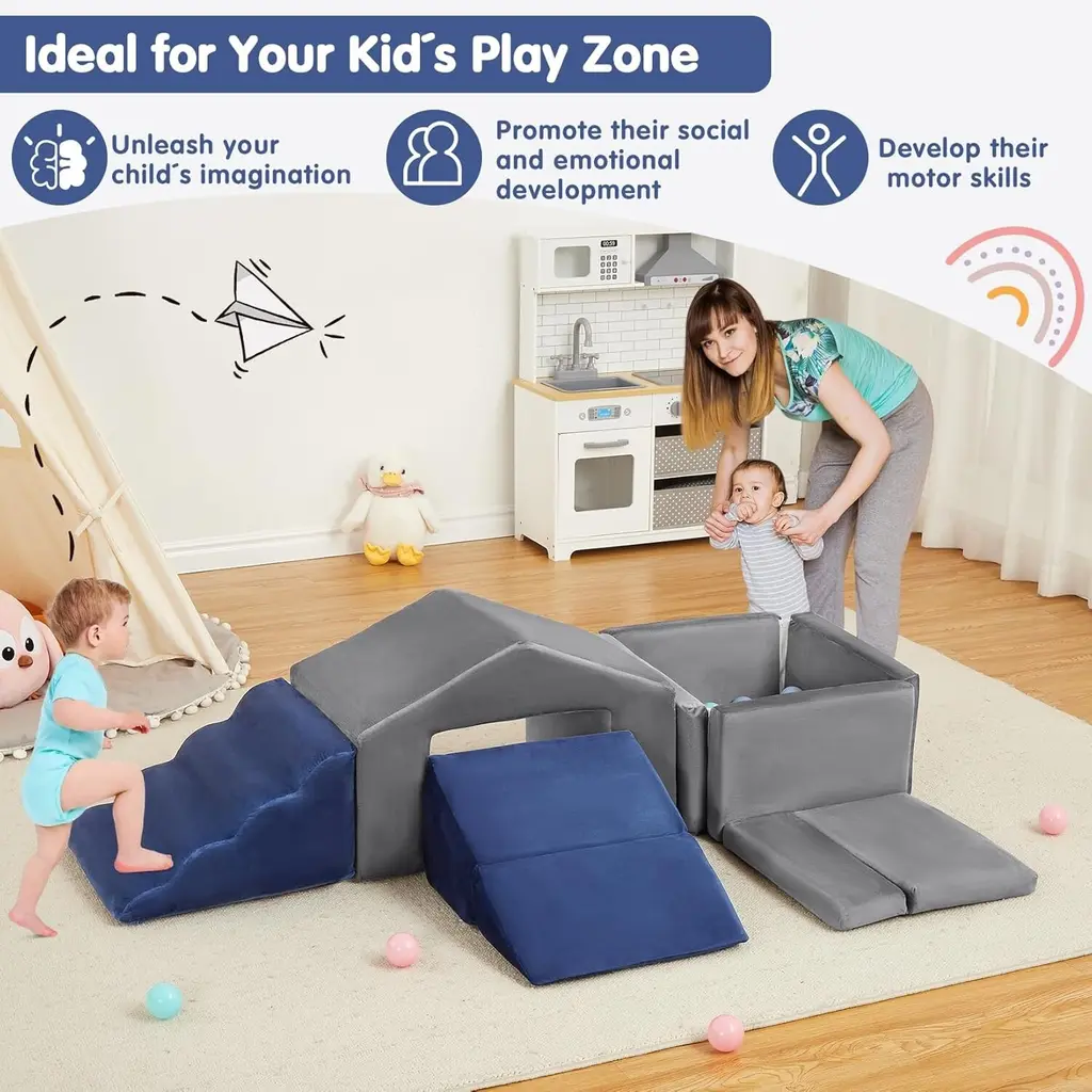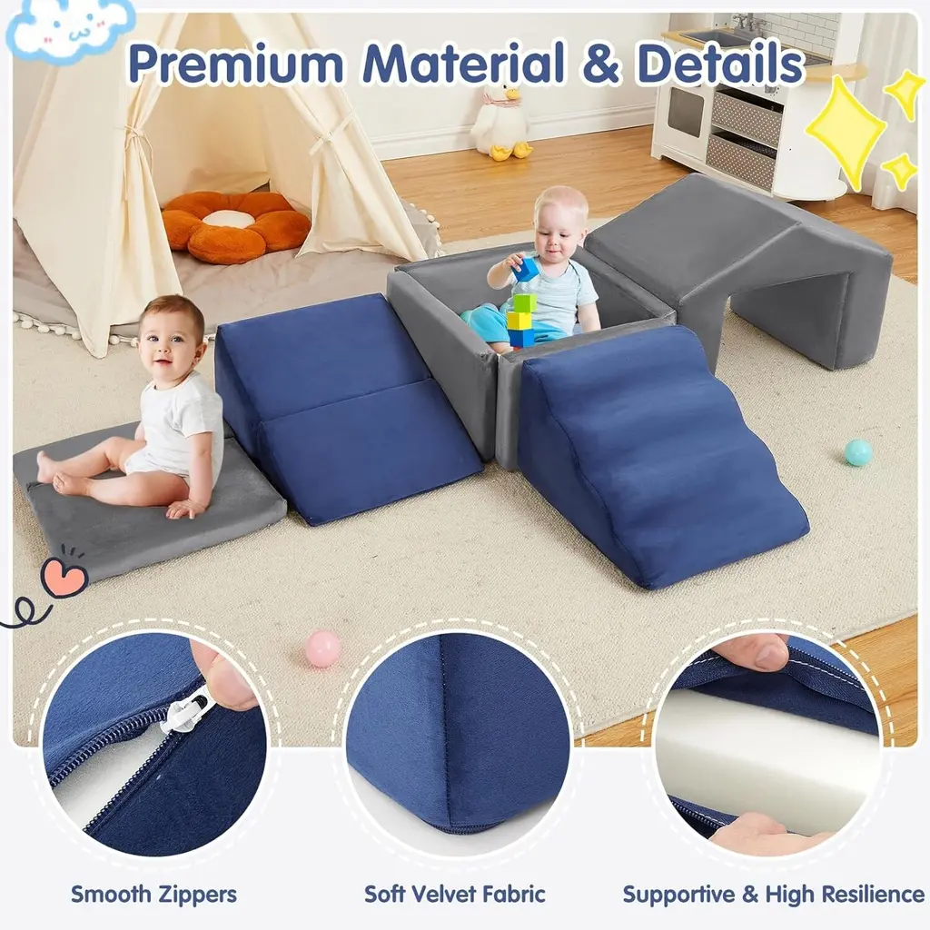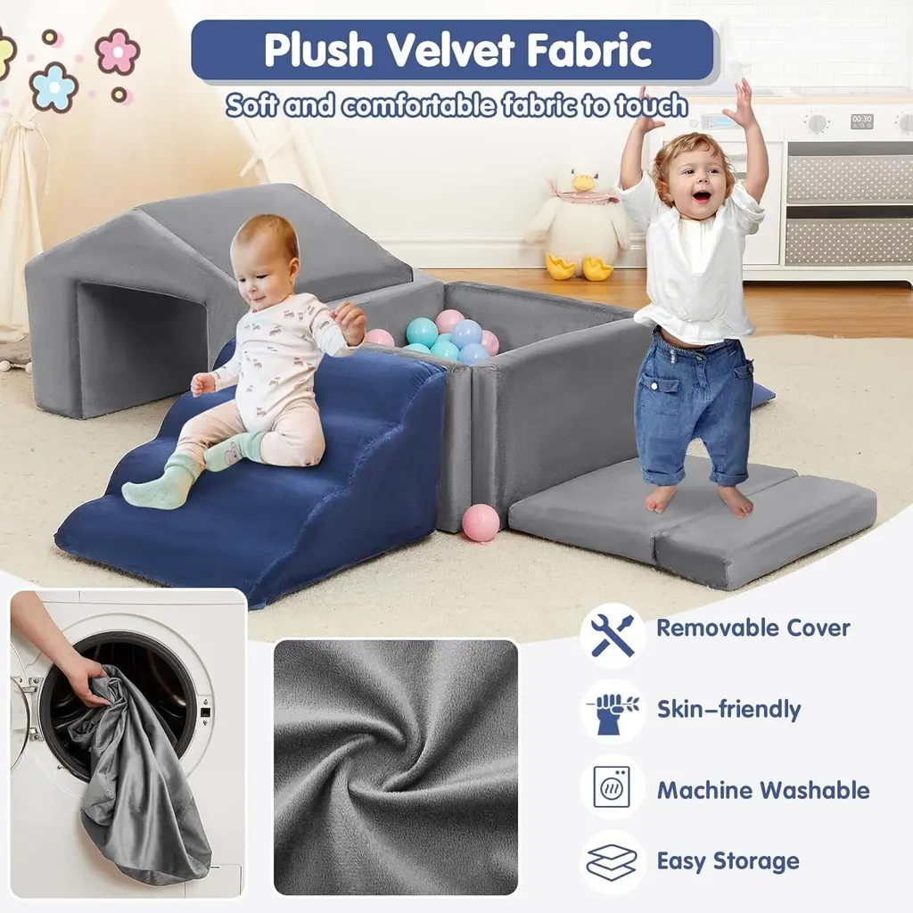 【Foam Playset Specification】This foam playset includes 6 components: 1 stair unit, 1 ramp, 1 mat, 1 trapezoid, and a square ball pit (balls not included). These foam pieces can be arranged in various configurations, making it an excellent soft play area for infants, toddlers, and young children. 【Premium Foam for Soft Play】The soft blocks are crafted from lightweight foam that resists deformation, ensuring safety for your child while remaining highly practical. The high-density foam construction provides effective cushioning during active play, delivering both comfort and security. 【Designed for Comfort】Both the foam climbing blocks and the ball pit are covered in a soft velvet fabric, making them gentle to the touch for your little one. This delicate material blends well with most interior designs, making it a perfect addition to any soft play area. 【Climb & Crawl for Active Play】Our recreational blocks not only enhance children's imaginative play but also promote creative thinking. This modular set can be used for various activities, including playtime and exercise, allowing for the creation of obstacle courses or spatial structures. Some pieces can even serve as seating options. 【Easy Clean】Each element in the set features a removable cover, allowing for easy washing in the machine and helping you keep the soft playset clean and tidy. (Tip: Please wait 24-48 hours after unpacking for the product to fully regain its shape.)