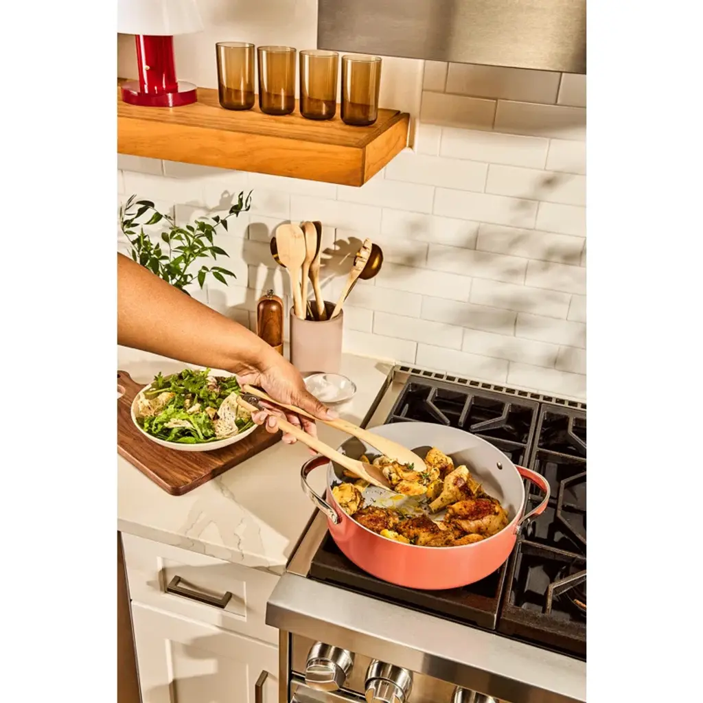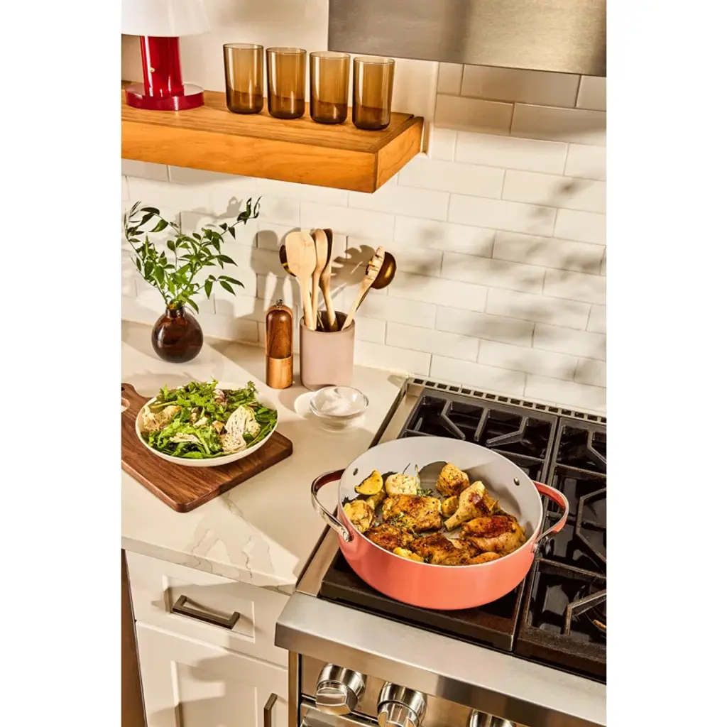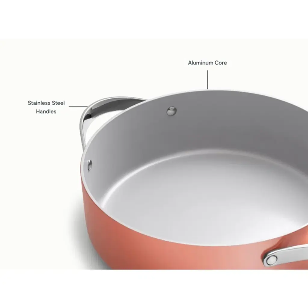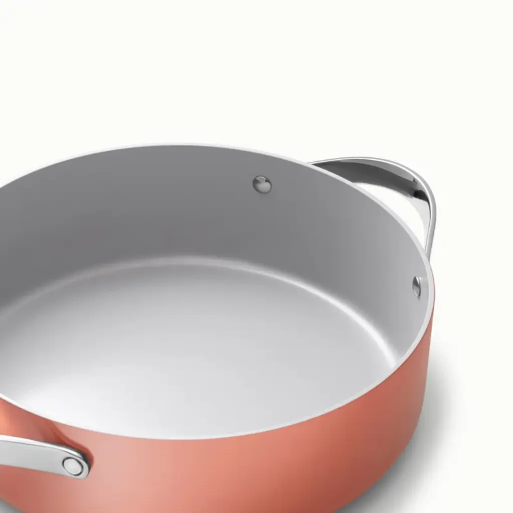 Our Rondeau is the MVP of one-pan meals, made with our signature non-stick, non-toxic ceramic coating. Thanks to the high, straight walls, you can simmer, braise, or fry without a mess. The large surface area is perfect for browning before finishing in the oven, and with two stainless steel handles, you can easily move your dish from the stove to the oven or table. Lid included.