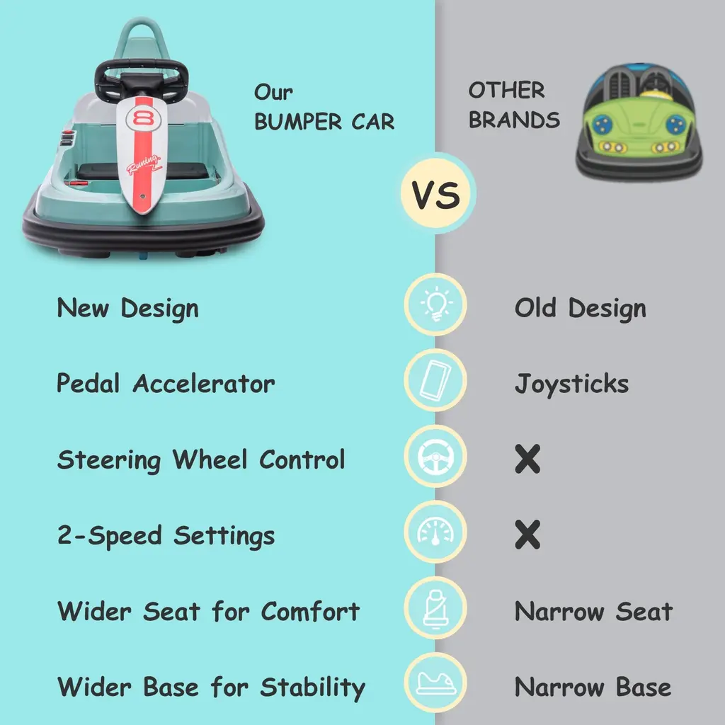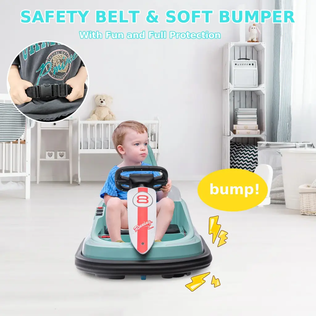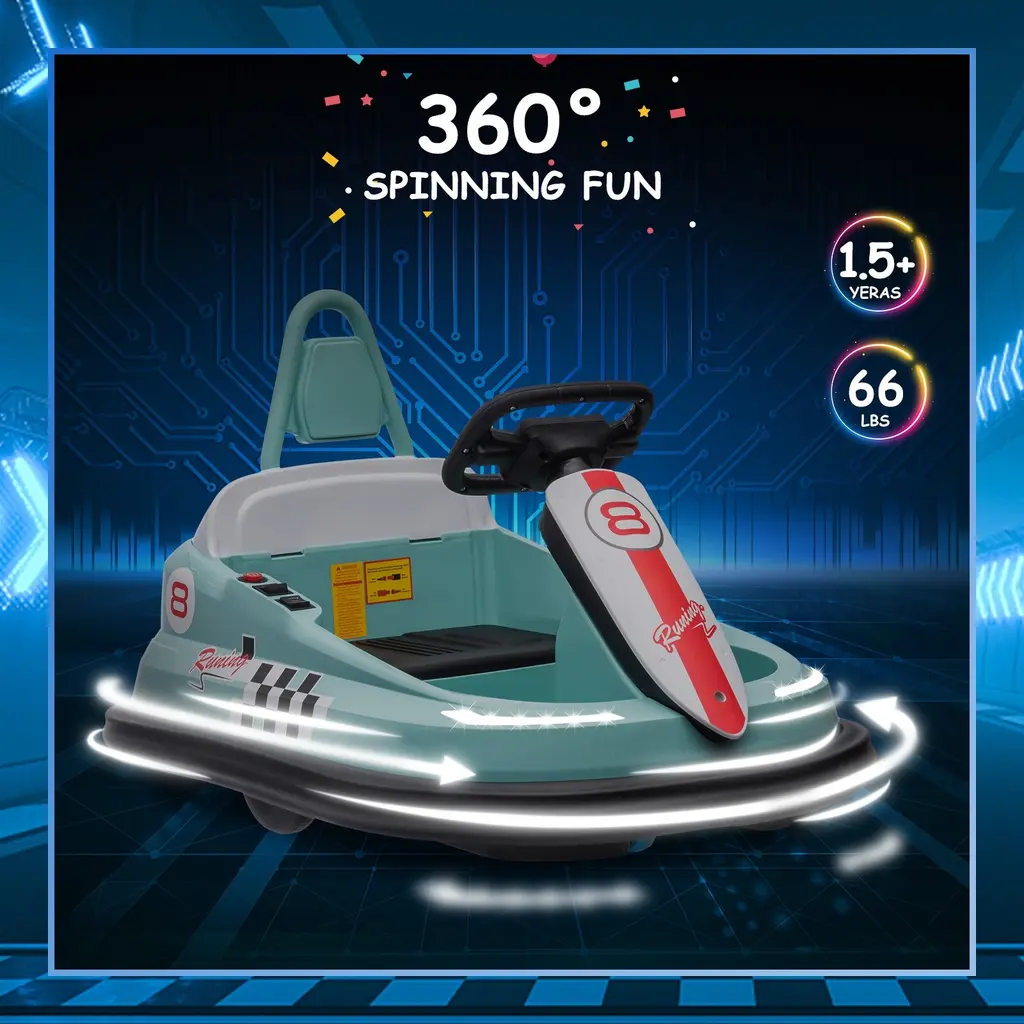 【ENTIRELY NEW DESIGN】The curved profile of the frame combined with a thick rubber-like bumper, the toddler bumper car lets them race, chase, spin and bump. Steering wheel and pedal controls on this 6V kids car allows your kid to have worry-free, non-frustrating, endless entertainment. 【GET READY TO SPIN】This awesome new-designed kids bumper car can spin a full 360 degrees with simple steering wheel controls. With special light and sound effects it's just like being at the fair. With a maximum speed of 1.9 mph this bumper car is a great introduction to electric ride-on cars. 【TOP SAFETY FEATURES】The ride-on bumper car has an adjustable seat belt, anti-flat tires and sturdy plastic shell construction for a safer ride. This awesome electric vehicle has a soft PVC rubber anti-collision strip making it a safe ride on toy for your kids and protect walls and furniture. 【PREMIUM PERFORMANCE】The kids car has forward/reverse and turn controls. the music and horn function make your kids enjoy a funny and safe driving experience. Includes a rechargeable 6V battery that lets your kids enjoy 1-2 hours of riding fun. Battery charging time is about 8-12 hours. 【GIFT FOR BOYS&GIRLS】This bumper car is a perfect addition to interactive and group games. Kids can bump each other for more riding fun. Overall Dimensions: 29.3"(L) x 18.9"(W) x 18.3"(H); Weight capacity: 66 lbs (NOTE: Without Remote Control)