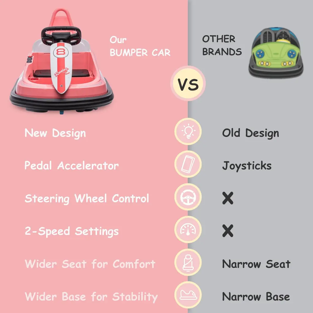 【ENTIRELY NEW DESIGN】The curved profile of the frame combined with a thick rubber-like bumper, the toddler bumper car lets them race, chase, spin and bump. Steering wheel and pedal controls on this 6V kids car allows your kid to have worry-free, non-frustrating, endless entertainment. 【GET READY TO SPIN】This awesome new-designed kids bumper car can spin a full 360 degrees with simple steering wheel controls. With special light and sound effects it's just like being at the fair. With a maximum speed of 1.9 mph this bumper car is a great introduction to electric ride-on cars. 【TOP SAFETY FEATURES】The ride-on bumper car has an adjustable seat belt, anti-flat tires and sturdy plastic shell construction for a safer ride. This awesome electric vehicle has a soft PVC rubber anti-collision strip making it a safe ride on toy for your kids and protect walls and furniture. 【PREMIUM PERFORMANCE】The kids car has forward/reverse and turn controls. the music and horn function make your kids enjoy a funny and safe driving experience. Includes a rechargeable 6V battery that lets your kids enjoy 1-2 hours of riding fun. Battery charging time is about 8-12 hours. 【GIFT FOR BOYS&GIRLS】This bumper car is a perfect addition to interactive and group games. Kids can bump each other for more riding fun. Overall Dimensions: 29.3"(L) x 18.9"(W) x 18.3"(H); Weight capacity: 66 lbs (NOTE: Without Remote Control)