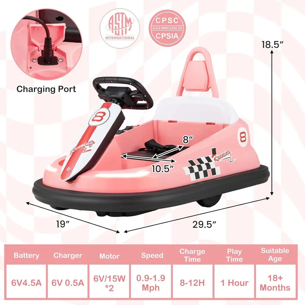 Ride, chase, spin & bump with our amazing bumper car! The electric ride on bumper car is equipped with 4 wheels at the bottom to bring kids smooth driving. By controlling the steering wheel, kids can get a full 360° spinning. With soft EVA bumper and anti-collision baffle, the bumper car effectively prevents toddlers from impact during the bumping game. What's more, the seat belt can hold toddler securely in place. When kids get bored, the multifunctional steering wheel with horn and music will make their riding more enjoyable. And don't miss the white light strips mounted on the front edge, which give the car a new look. The toddler ride on bumper car can be used indoor or outdoors, which will be a wonderful gift for your little one! Features:Specification