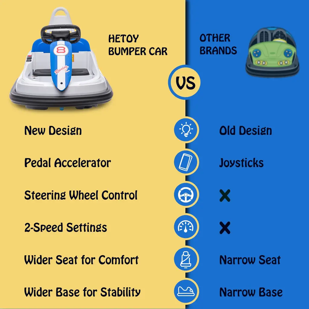 Fresh Design: With its sleek curved frame and sturdy rubber-like bumper, our toddler bumper car is ideal for racing, chasing, spinning, and bumping. Equipped with user-friendly steering wheel and pedal controls, this 6V kids car offers worry-free, non-frustrating, and endless entertainment for your little ones. Ultimate Spinning: This newly designed kids bumper cars can perform a full 360-degree spin with easy steering wheel controls. Complete with special light and sound effects, it delivers a fair-like experience. With a top speed of 1.9 mph, this bumper car for toddlers 3-6 is the perfect introduction to electric ride-on cars. Premium Safety Features: With an adjustable seat belt, puncture-resistant tires, and durable plastic shell, this kids car ensures a secure ride. The electric vehicle also features a soft PVC rubber anti-collision strip, providing a safe playing experience for your children and preventing damage to walls and furniture. Exceptional Performance: This electric car features forward/reverse and turn controls, along with safety belt, music and horn functions for a safe and fun driving experience. It comes with a rechargeable 6V battery, providing 1-2 hours of riding enjoyment. The battery requires approximately 8-12 hours for a full charge. Great Gift for Boys Girls: This bumper car toy is an ideal choice for interactive group play. Kids can bump into each other for added riding excitement. Overall Dimensions: 29.3"(L) x 18.9"(W) x 18.3"(H); Weight Capacity: 66 lbs. (PLEASE NOTE: Remote Control not included)