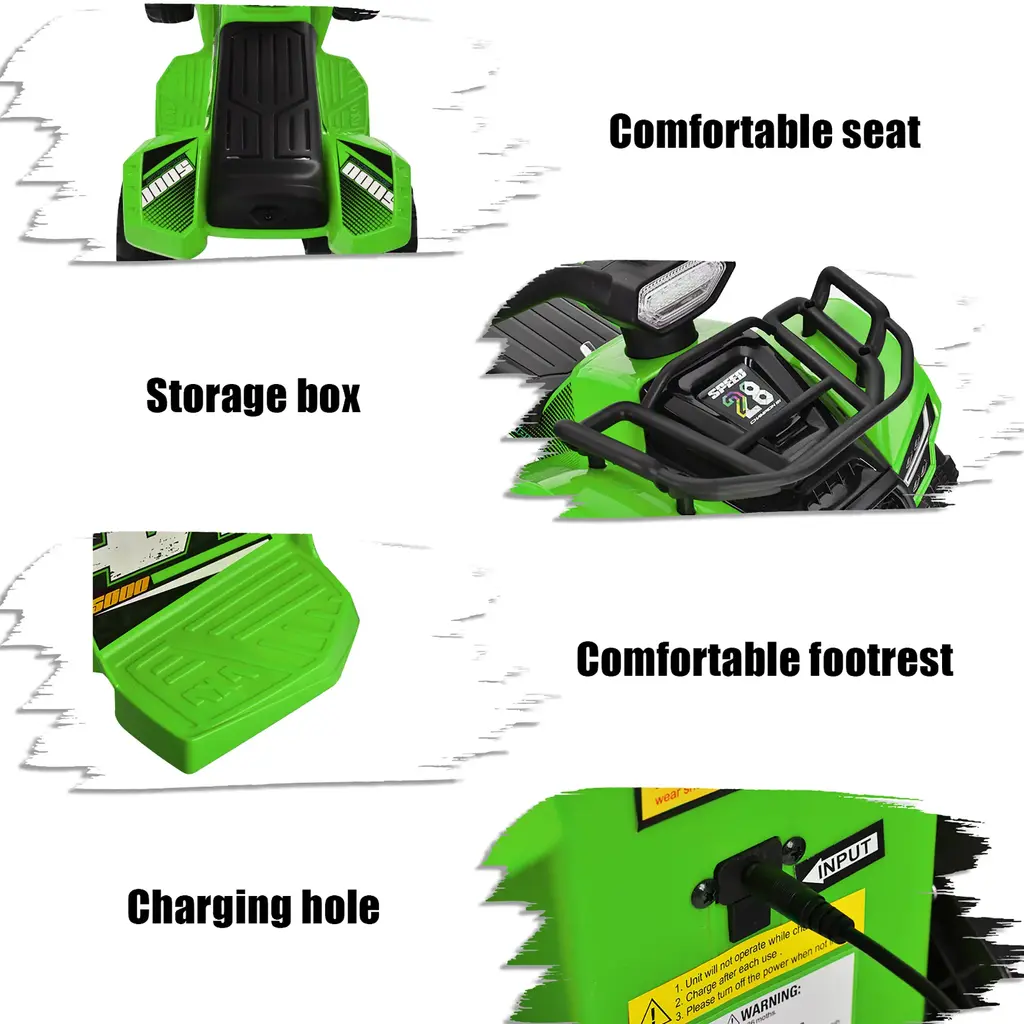 This kids' ATV combines ease of use, durability, and realistic features for a thrilling and safe driving experience. Operating the vehicle is simple with a power button for acceleration and a straightforward switch for movement. The 6V 4Ah battery provides up to 40 minutes of playtime, and the sturdy tires are suitable for various surfaces. The ATV's design includes LED headlights, a horn, and a storage box for added realism. Additional entertainment features like an MP3 player and USB socket enhance the fun, while the sturdy frame and ergonomic seat ensure comfort and safety for young riders. Features:Specification