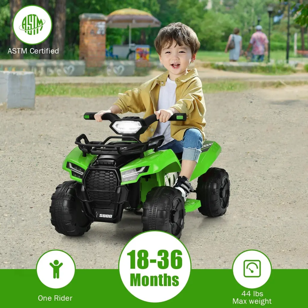 SpecificationsKey Features● Easy-to-Operate Kids Vehicle: This kids' ride on ATV is easy to operate. Simply press the power button on the handle to accelerate the car with a constant safe speed of 1 mph. There is a switch for moving the car forward, and parking. No complicated buttons will stop the kids from having endless driving fun as grownups do. ● Rechargeable Battery and Thickened Wheels: The ride-on quad has a 6V 4Ah battery. In a fully charged condition, it will allow for 40 minutes of playtime. And 4 wear-resist PP wheels enable the electric ride-on ATV to run on different grounds, either indoors or outdoors, such as the wood floor, asphalt road, and more. ● Authentic Appearance: Designed as a real beach ATV for kids, this mini one has an atmospheric LED headlight, horn, and a front storage box to store toys. It is an ideal gift for kids over 18 months to have their first race. The maximum weight limit is 44 lbs. ● Comfortable and Safe Ride-on Car: Featuring a low center of gravity, this kids' electric 4-wheeler quad is safe and stable to drive. And the wide seat fits kids' body curves for coziness while the footrests comfortably accommodate toddler's feet. ● Multifunctional Features: This ride-on car toy has MP3, USB socket to bring kid's favorite songs and music into the exciting cruise to double the fun. And it also memorizes a couple of songs and stories to share with your kids for educational purposes.DescriptionThis kids' electric 4-wheeler quad is an ideal gift to cheer up your children.Featuring a realistic appearance, this toddler ride-on car not only gives a fun cruise but also indulges kids in roleplaying. Besides, it also offers music and story functions for kids to practice verbal communication. Providing endless fun, this kids' car toy guarantees safety and comfort as well. A stable 4-wheel structure watches over a secured ride while the curved seat base and footrests render cozy seating. This mini beach car has a simple operation that kids can easily understand. You will need to charge 8-12 hours to have 40 minutes of lasting fun.If you are worried about preparing a gift for your child, do not hesitate to take it home!