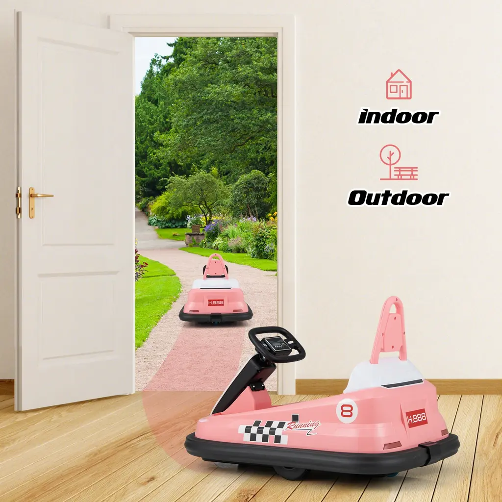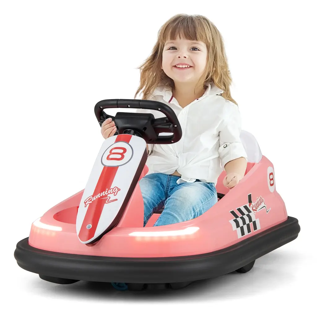 Specifications:● Fun Music and LED Lights: With bright LED lights, this baby bumping toy car lets toddlers drive with fun. Also, there is a horn sound available. What's more, the multi functional music panel with LED display features story, music and FM modes for option. The built-in USB port, AUX port and TF slot bring more possibilities.● Exciting yet Safe Bumping: Equipped with dual motors and a rechargeable battery, this electric bumper car allows kids to enjoy a long time of exciting bumping. And the universal wheels make the bumper car spin 360° for unlimited fun. Besides, the spacious sitting area with a safety harness keeps children in position for security.● Realistic Driving Experience: Toddlers can start an adventure by pressing the power button. Likewise, they can choose to go forward or backward at high speed or low speed thanks to easy-to-operate buttons. With a functional steering wheel and realistic throttle pedal, the toddler bumper car offers kids an immersive driving feeling.● Fun Music and LED Lights: With bright LED lights, this baby bumping toy car lets toddlers drive with fun. Also, there is a horn sound available. What's more, the multi functional music panel with LED display features story, music and FM modes for option. The built-in USB port, AUX port and TF slot bring more possibilities.● Child-friendly Details: The 6V ride-on bumper car is made of BPA-free materials that are friendly to kids' health. With the soft EVA bumper, the walls and furniture will be prevented from scratches. The cozy backrest also serves as a carry handle for easy moving. In addition, the ASTM and CPSIA certifications enhance reliability.● Great Gift and Easy Assembly: Coming with clear instruction and complete parts, the kids electric bumping toy can be assembled easily. It is a perfect birthday or holiday gift for kids, providing them with wonderful indoor or outdoor playing times.