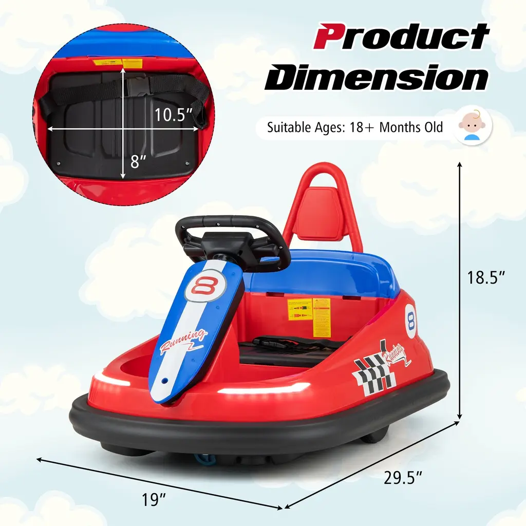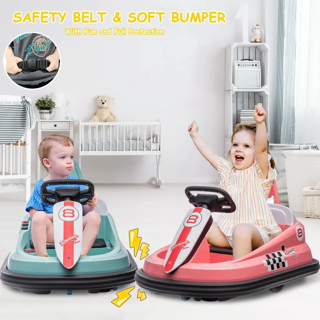 Specifications:● Fun Music and LED Lights: With bright LED lights, this baby bumping toy car lets toddlers drive with fun. Also, there is a horn sound available. What's more, the multi functional music panel with LED display features story, music and FM modes for option. The built-in USB port, AUX port and TF slot bring more possibilities.● Exciting yet Safe Bumping: Equipped with dual motors and a rechargeable battery, this electric bumper car allows kids to enjoy a long time of exciting bumping. And the universal wheels make the bumper car spin 360° for unlimited fun. Besides, the spacious sitting area with a safety harness keeps children in position for security.● Realistic Driving Experience: Toddlers can start an adventure by pressing the power button. Likewise, they can choose to go forward or backward at high speed or low speed thanks to easy-to-operate buttons. With a functional steering wheel and realistic throttle pedal, the toddler bumper car offers kids an immersive driving feeling.● Fun Music and LED Lights: With bright LED lights, this baby bumping toy car lets toddlers drive with fun. Also, there is a horn sound available. What's more, the multi functional music panel with LED display features story, music and FM modes for option. The built-in USB port, AUX port and TF slot bring more possibilities.● Child-friendly Details: The 6V ride-on bumper car is made of BPA-free materials that are friendly to kids' health. With the soft EVA bumper, the walls and furniture will be prevented from scratches. The cozy backrest also serves as a carry handle for easy moving. In addition, the ASTM and CPSIA certifications enhance reliability.● Great Gift and Easy Assembly: Coming with clear instruction and complete parts, the kids electric bumping toy can be assembled easily. It is a perfect birthday or holiday gift for kids, providing them with wonderful indoor or outdoor playing times.