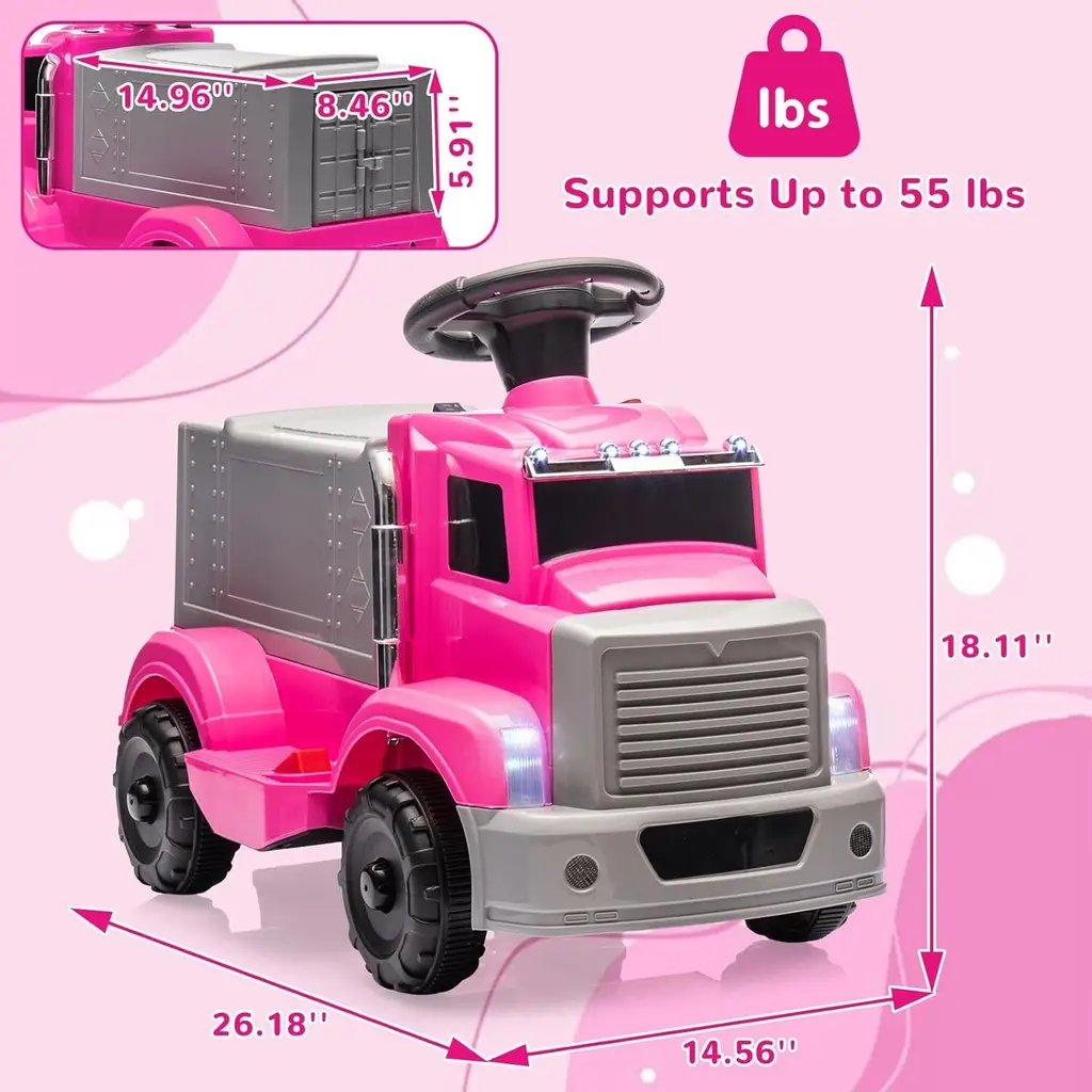 INTERACTIVE KIDS' CAR: This delightful electric vehicle for children features two shining headlights, five LED lights, and an array of sounds and music that can be triggered with a simple button press, ensuring a fun and safe riding experience 2-IN-1 DESIGN: This toddler car comes with two thrilling driving modes—electric and foot-operated! With a 6V 4.5AH battery and a 35W motor, it smoothly cruises at a consistent speed of 1.86 mph across different surfaces. Your child can embark on their own adventures while enhancing their motor skills—let the excitement start AMPLE STORAGE SPACE: This electric car for toddlers features a roomy storage compartment under the seat that resembles a truck bed. It's the perfect place for kids to stash snacks, toys, books, and crayons, creating their very own secret hideout SAFELY DESIGNED FOR KIDS: This ride-on toy features an anti-tilt mechanism and rounded corners for enhanced safety. It's also ASTM and CPSIA certified, ensuring you can relax while your little one has fun riding! Dimensions: 26.18"L x 14.56"W x 18.11"H. Weight capacity: 55 lbs. USER-FRIENDLY: With a one-touch start button, flexible steering wheel, and accelerator pedal, your little adventurer can easily take control and start their fun ride! The simple forward, reverse, and stop buttons help improve hand-eye coordination. This toddler toy makes a great gift for any holiday or special occasion