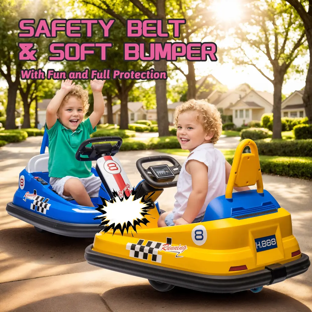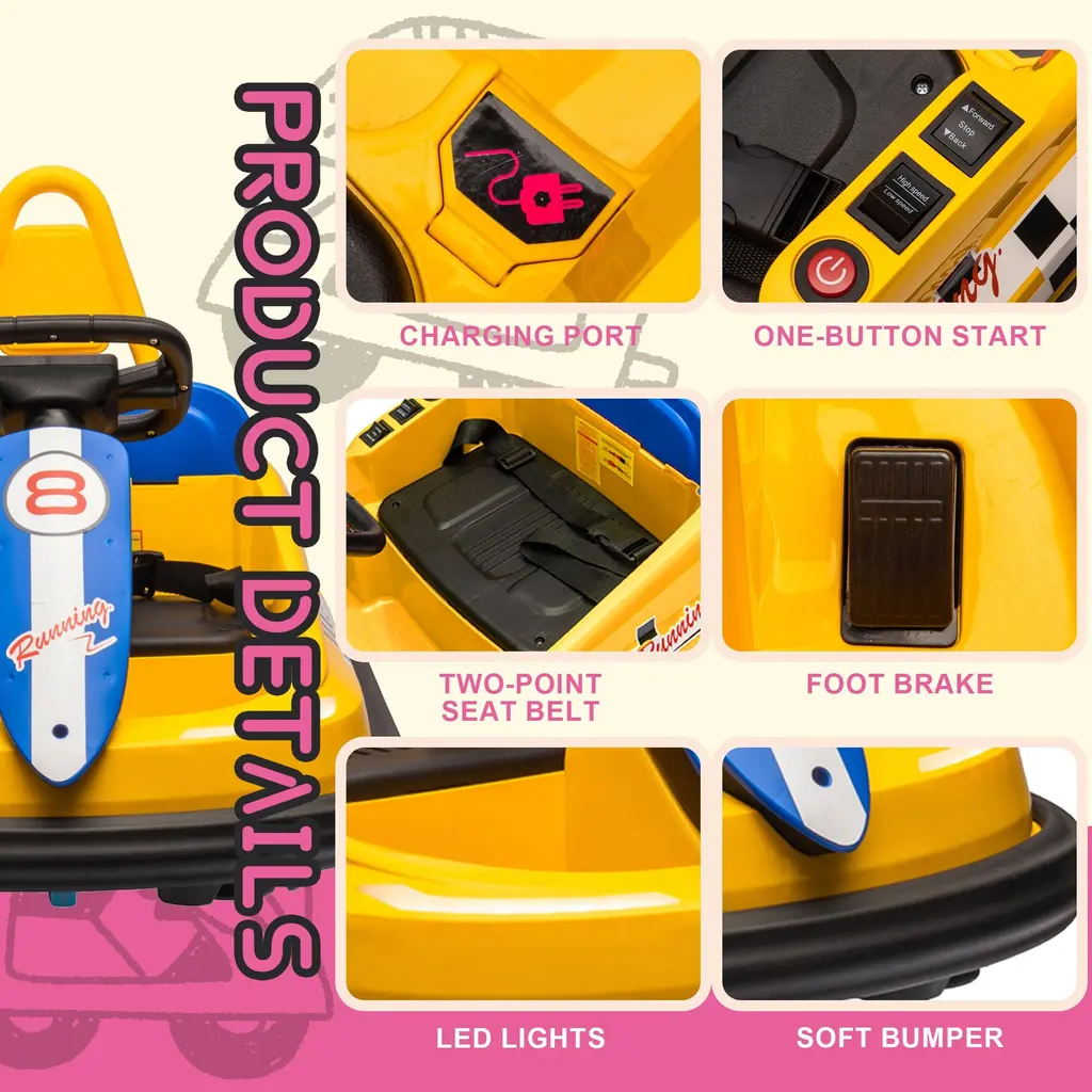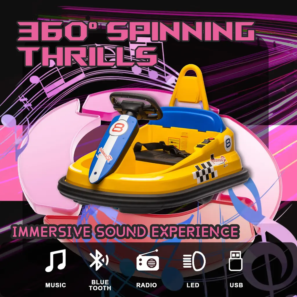 Three-Speed Modes for Every Adventure: From leisurely cruises to thrilling races, our bumper car offers three customizable speed settings—slow, medium, and fast—tailored to suit your child's driving skills and the surrounding environment. Let them explore the world at their own pace! Mesmerizing LED Light Show: Dazzle onlookers with our bumper car's captivating LED light decoration. No matter when and where, your child will stand out in style with these vibrant lights that turn every ride into a spectacle. Effortless One-Button Start: Say goodbye to complicated start-up procedures! Our bumper car features a user-friendly one-button start function, allowing your child to kickstart their driving adventure with ease. Simple, intuitive, and ready for action! 360° Spinning Thrills: Get ready for heart-pounding excitement with our bumper car's 360° rotation function. With just a push of a button, your child can experience the thrill of spinning in all directions, adding an extra dimension of fun to their driving escapades. Double the Safety, Double the Peace of Mind: Safety always comes first. That's why our bumper car is equipped with dual-point safety belts, ensuring your child stays securely strapped in during every exhilarating ride. Let them have fun while you relax knowing they're protected. Immersive Sound Experience: Elevate your child's driving experience with our bumper car's built-in speaker and music system. From catchy tunes to lively sound effects, the immersive audio adds an extra layer of enjoyment to their adventures. Bluetooth Connectivity for Endless Entertainment: Take the excitement up a notch with our bumper car's Bluetooth player functionality. Simply connect your device, and let the music play! Whether it's their favorite playlist or an interactive story, the possibilities for fun are endless. A Timeless Toy for Growing Explorers: Designed for children aged eighteen months and above, our bumper car is more than just a toy--it's a companion for their journey of discovery and adventure. Built to last and inspire, it promises years of joyful memories and endless smiles.