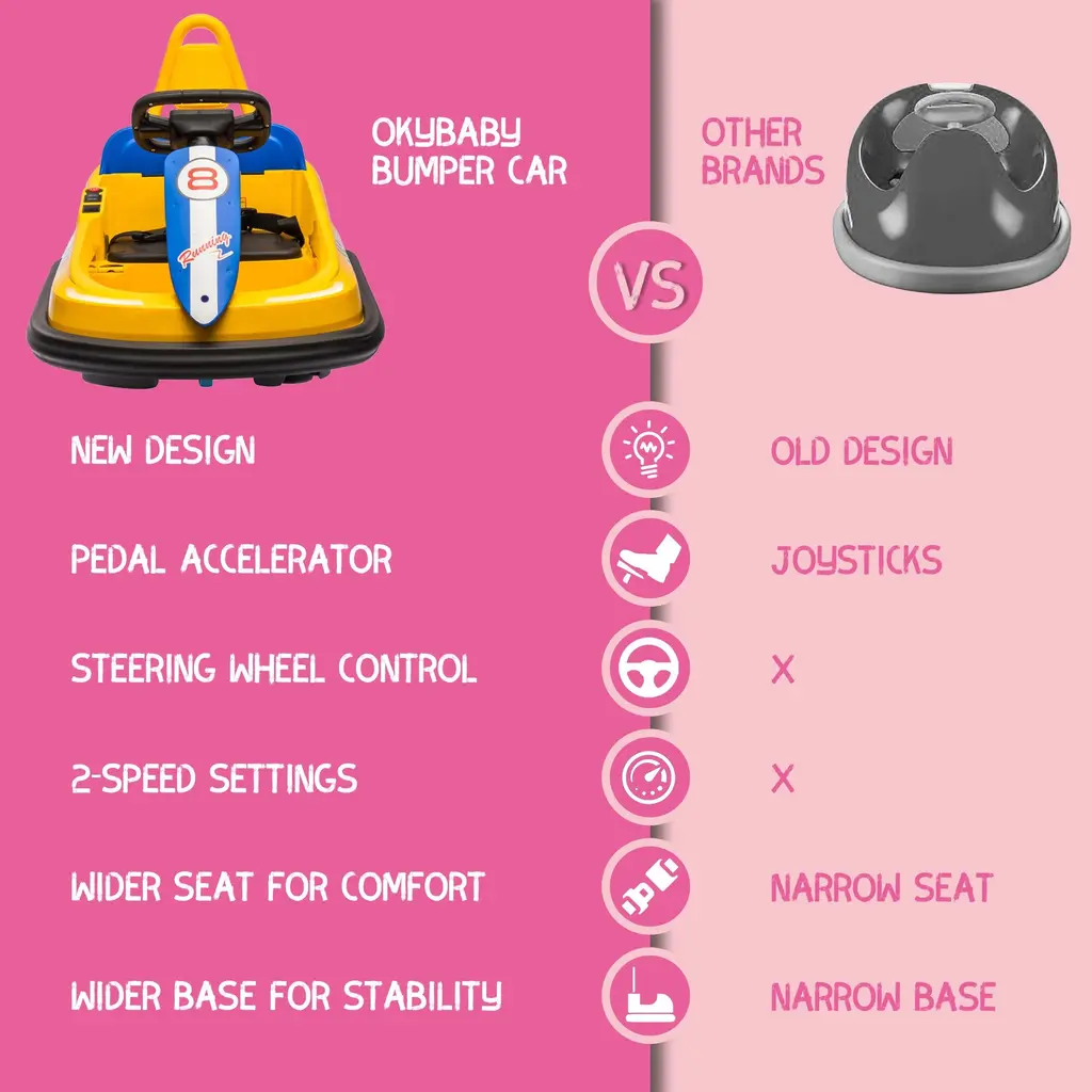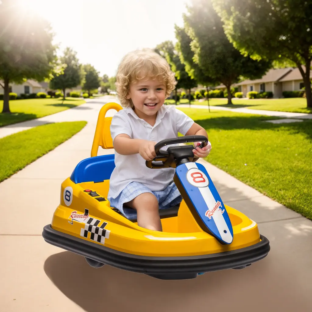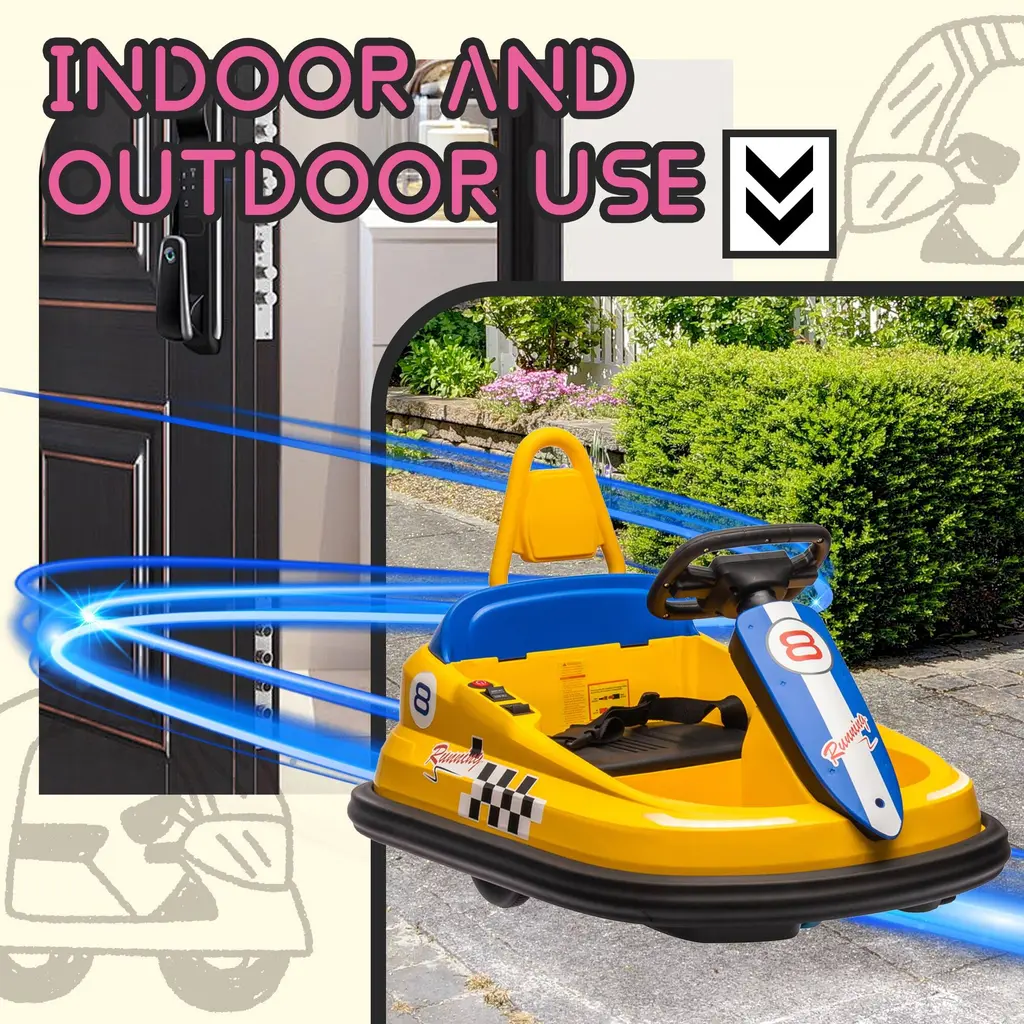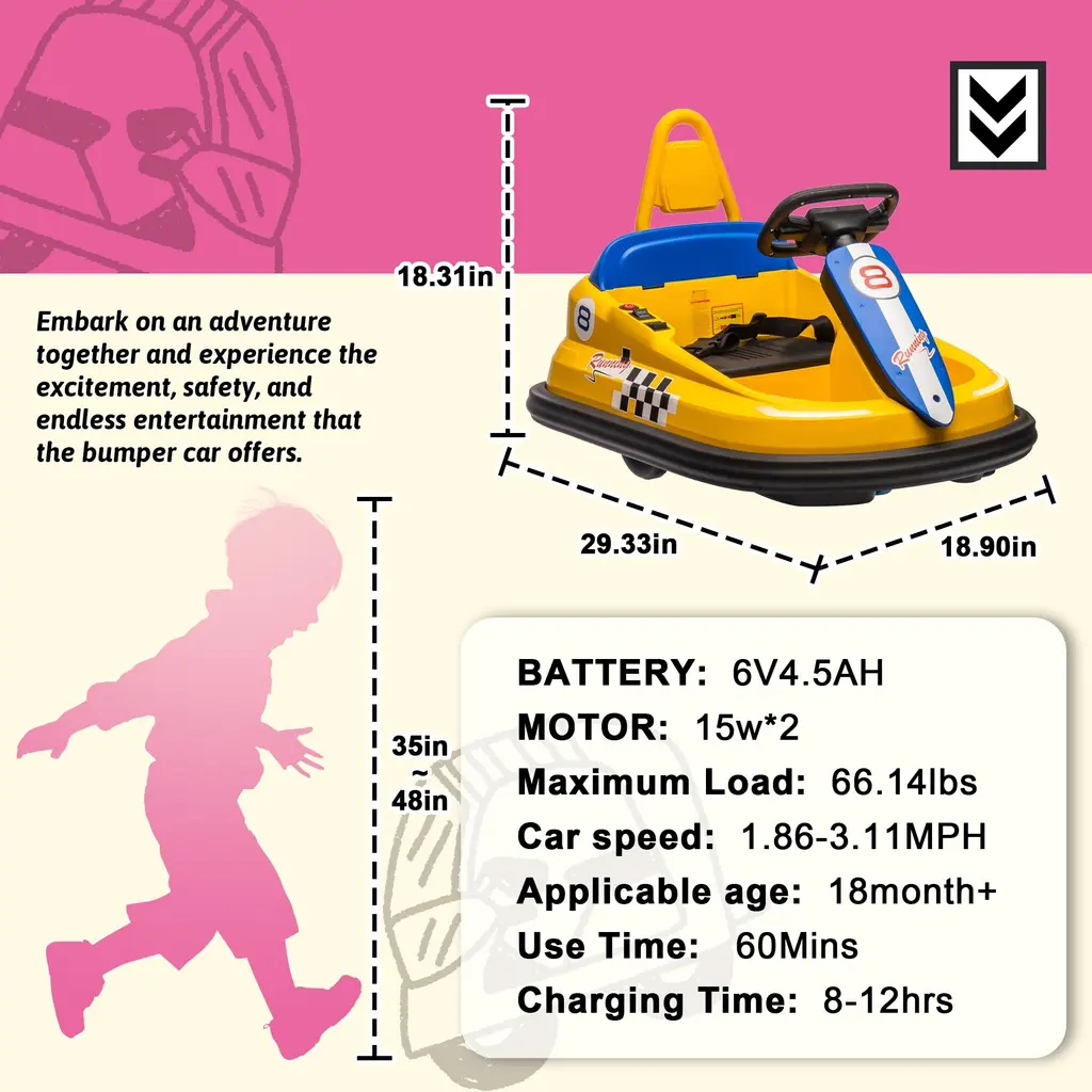 Three-Speed Modes for Every Adventure: From leisurely cruises to thrilling races, our bumper car offers three customizable speed settings—slow, medium, and fast—tailored to suit your child's driving skills and the surrounding environment. Let them explore the world at their own pace! Mesmerizing LED Light Show: Dazzle onlookers with our bumper car's captivating LED light decoration. No matter when and where, your child will stand out in style with these vibrant lights that turn every ride into a spectacle. Effortless One-Button Start: Say goodbye to complicated start-up procedures! Our bumper car features a user-friendly one-button start function, allowing your child to kickstart their driving adventure with ease. Simple, intuitive, and ready for action! 360° Spinning Thrills: Get ready for heart-pounding excitement with our bumper car's 360° rotation function. With just a push of a button, your child can experience the thrill of spinning in all directions, adding an extra dimension of fun to their driving escapades. Double the Safety, Double the Peace of Mind: Safety always comes first. That's why our bumper car is equipped with dual-point safety belts, ensuring your child stays securely strapped in during every exhilarating ride. Let them have fun while you relax knowing they're protected. Immersive Sound Experience: Elevate your child's driving experience with our bumper car's built-in speaker and music system. From catchy tunes to lively sound effects, the immersive audio adds an extra layer of enjoyment to their adventures. Bluetooth Connectivity for Endless Entertainment: Take the excitement up a notch with our bumper car's Bluetooth player functionality. Simply connect your device, and let the music play! Whether it's their favorite playlist or an interactive story, the possibilities for fun are endless. A Timeless Toy for Growing Explorers: Designed for children aged eighteen months and above, our bumper car is more than just a toy--it's a companion for their journey of discovery and adventure. Built to last and inspire, it promises years of joyful memories and endless smiles.