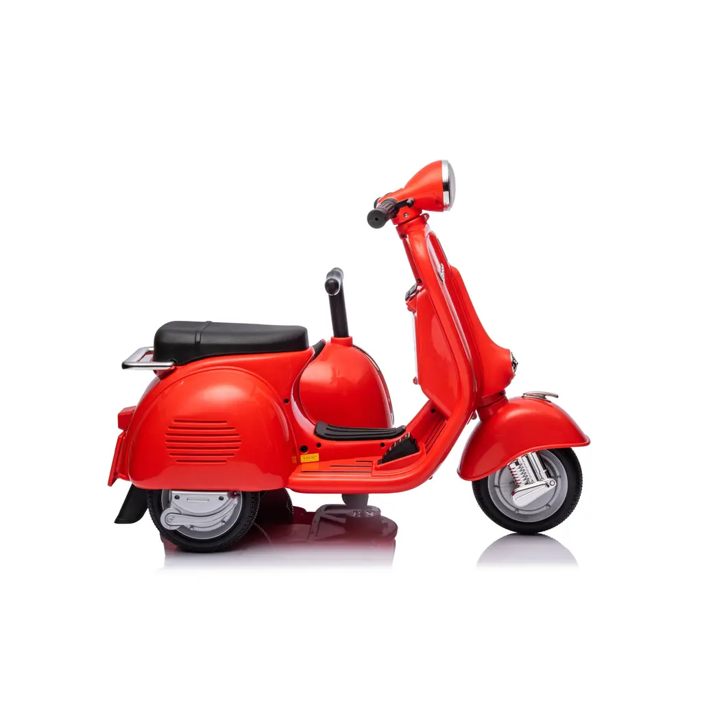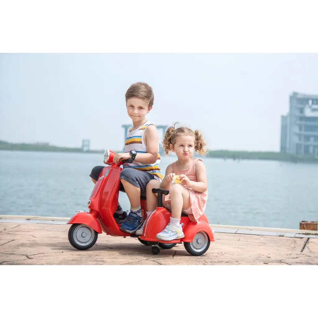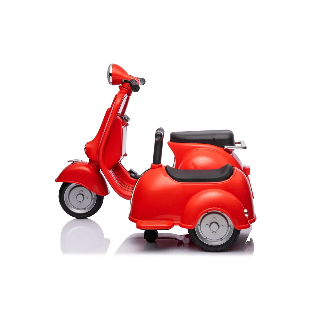 Product Overview: The 6V Licensed Vespa Scooter Motorcycle with Sidecar for kids is the perfect ride for young adventurers. With its sleek design, vibrant colors, and realistic features, this ride-on motorcycle is sure to delight any child. Designed for two riders, it comes with a dual seat and a sidecar, allowing siblings or friends to join the fun. The scooter features bright headlights, a functional key power switch, and a multi-functional music board for added entertainment. Designed with comfort and safety in mind, it includes an anti-rollover frame, shock-absorbing springs, and a slow start and brake function. Assembled dimensions: 31.50L x 27.60W x 25.00H inches. Weight: 21.10 lbs.Product Features: Specifications: Suitable Scenarios: This 6V licensed Vespa ride-on scooter is ideal for indoor and outdoor play, making it a great gift for birthdays or special occasions. Perfect for kids aged 3+, it can be used in the backyard, driveway, or park. The sidecar design allows for a second rider, encouraging social play. With its comfortable design and safe features, it's an excellent choice for kids who love imaginative, active play.Notes: This ride-on scooter is suitable for children aged 3+ years with a maximum weight capacity of 66 lbs. Always supervise children while using the vehicle. The 6V battery allows for a fun ride with a top speed of 3.7 mph, and the vehicle should be fully charged before each use. Store the scooter in a dry, safe place to ensure it remains in good condition for future use.