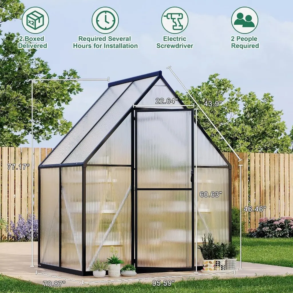 Imagine stepping into a sunlit oasis where your plants grow lush and healthy, protected from harsh UV rays yet bathed in perfect sunlight. Our greenhouse’s UV-blocking polycarbonate panels act like sunscreen for your garden, filtering harmful rays while maximizing light absorption—no more sunburned leaves, just vibrant growth. Breathability is key, and the adjustable roof vent lets you customize airflow on any panel, while the eco-friendly gutter system turns rainwater into a sustainable resource. The lockable door keeps your plants secure, even on windy days. Built with a sturdy aluminum frame, this greenhouse stands strong against 50 mph winds and 40 kg/m² snow loads, so your tomatoes thrive year-round. But it’s more than just a greenhouse. With a little creativity, it becomes a sunny retreat—a reading nook, a yoga space, or even a guest room surrounded by greenery. (Heads up: Shipping arrives in two boxes for easier handling.) Assembly? A breeze. The plug-in panels and quick-install system cut setup time by 40%, and rigorous testing ensures 35% greater stability. Perfect for beginners or busy gardeners who want a durable, multitasking space without the hassle. Your dream garden starts here—where practicality meets possibility. Shop now and grow (or unwind) with confidence! But it’s more than just a greenhouse. With a little creativity, it becomes a sunny retreat—a reading nook, a yoga space, or even a guest room surrounded by greenery. (Heads up: Shipping arrives in two boxes for easier handling.) Assembly? A breeze. The plug-in panels and quick-install system cut setup time by 40%, and rigorous testing ensures 36% greater stability. Perfect for beginners or busy gardeners who want a durable, multitasking space without the hassle. Your dream garden starts here—where practicality meets possibility. Shop now and grow (or unwind) with confidence!