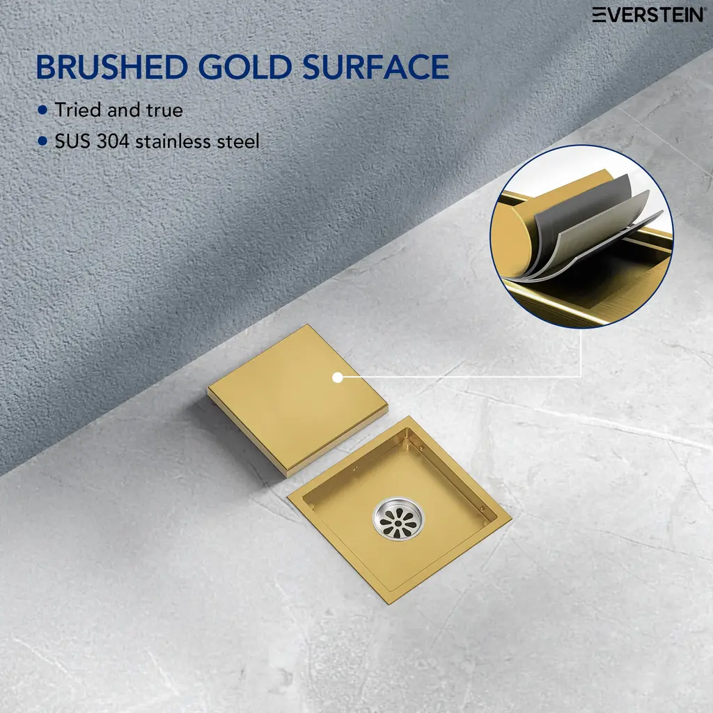 6"x6" Stainless Steel Square Shower Drain With Drain Cover - N/a - Brushed Gold