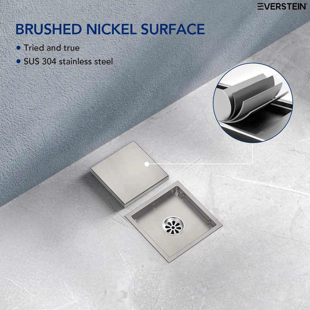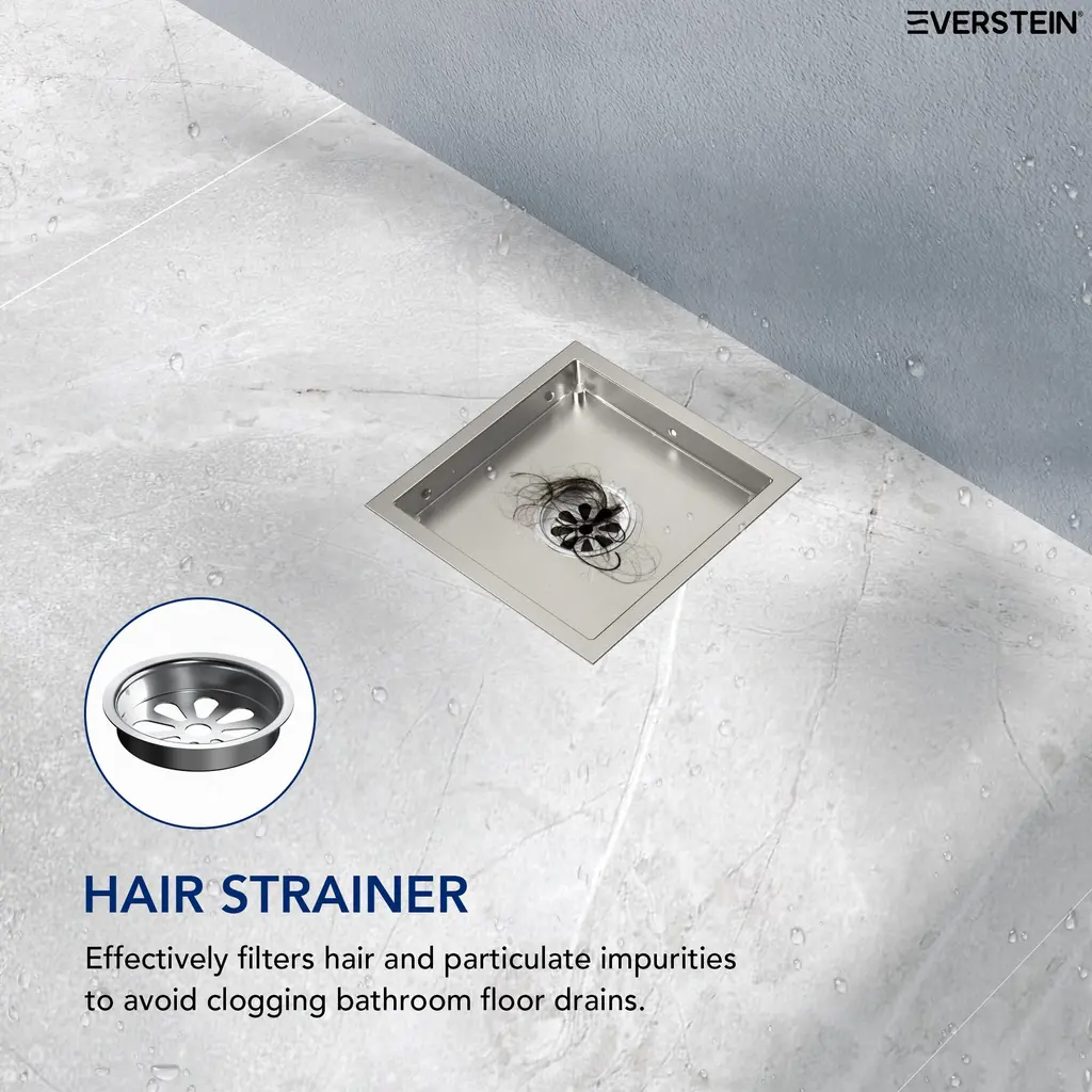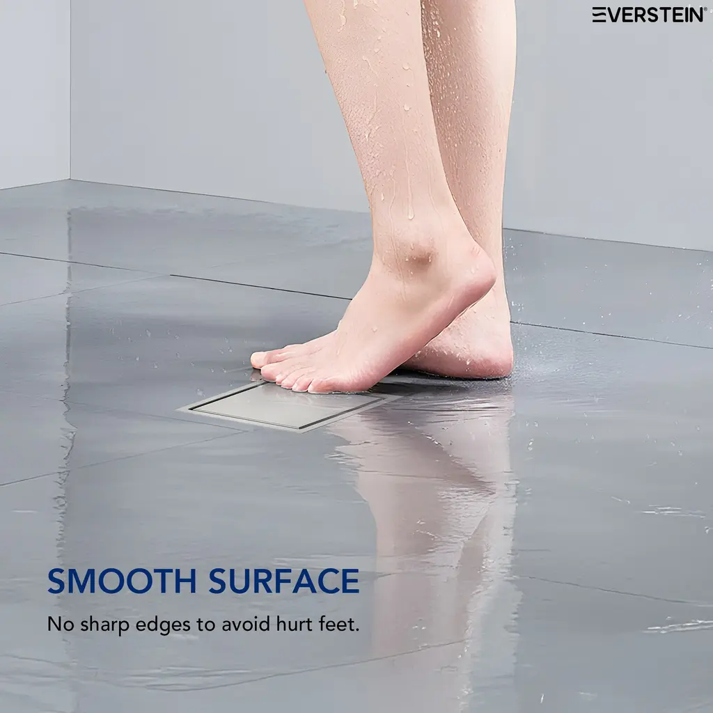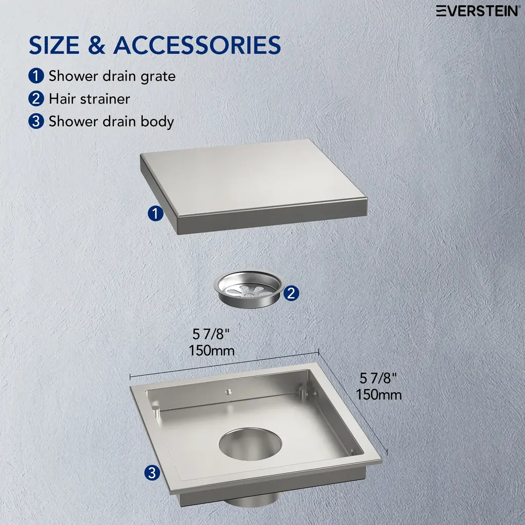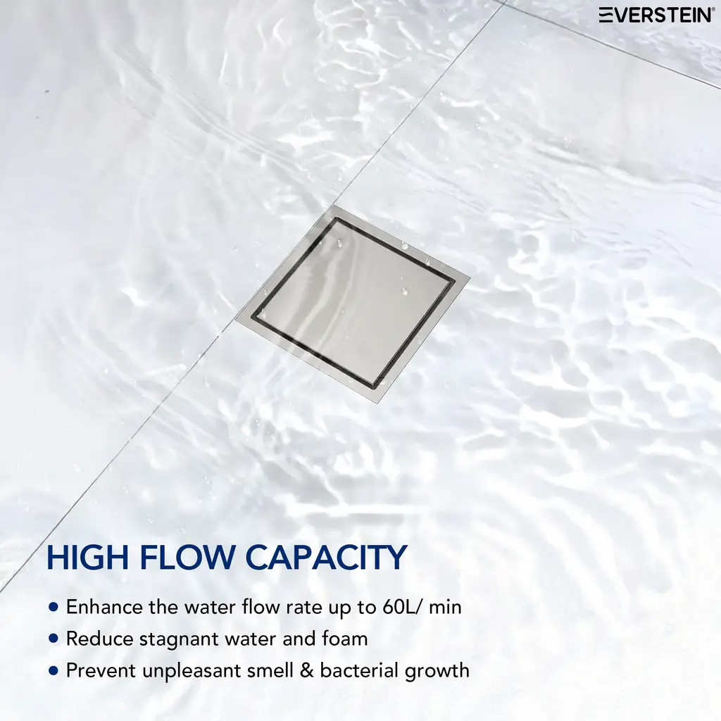 This square shower drain is designed to deliver efficient water drainage with added features for convenience and durability. Equipped with a built-in hair strainer, it effectively captures debris to prevent clogging, ensuring smooth water flow and reducing maintenance efforts. The diameter of outlet is 2", high displacement with an average of 60 l/min. Ideal for use in bathrooms, showers, kitchens, swimming pools, balconies, garages, basements, toilets, and even outdoor areas, the EVERSTEIN floor drain ensures a smooth and hygienic drainage system for your home or commercial space. Feature:After-Sales Warranty: EVERSTEIN provide a lifetime warranty that covers all issues not resulting from human error or accidental damage, with customer service support, ensuring a seamless and worry-free experience from product selection to installation.